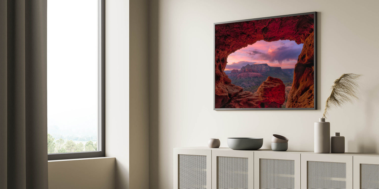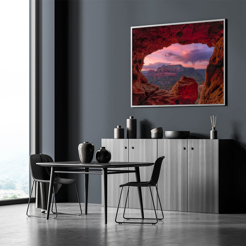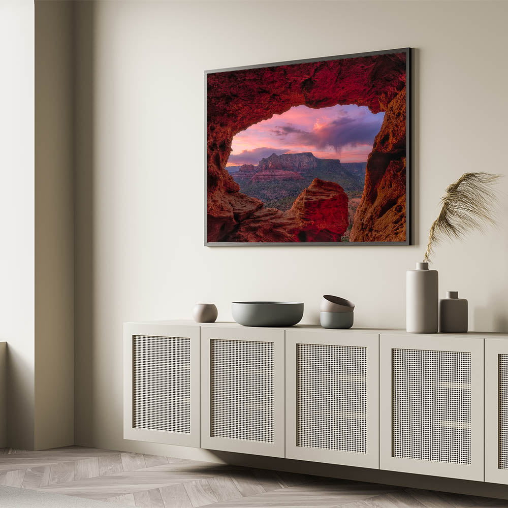 Bring the enchanting beauty of Sedona’s red rock landscape into your home with this breathtaking wall art. Captured from within a cave, this unique perspective showcases the iconic red rocks of Arizona under a vivid sunset sky. The rich reds and purples of the sunset enhance the natural beauty of the rock formations, creating a dramatic and serene scene. Available in various high-quality formats, including framed canvas, acrylic glass, and stretched canvas, this artwork is perfect for adding a touch of Arizona's majestic beauty to any space.