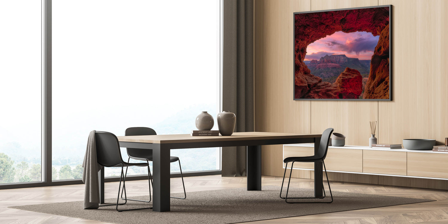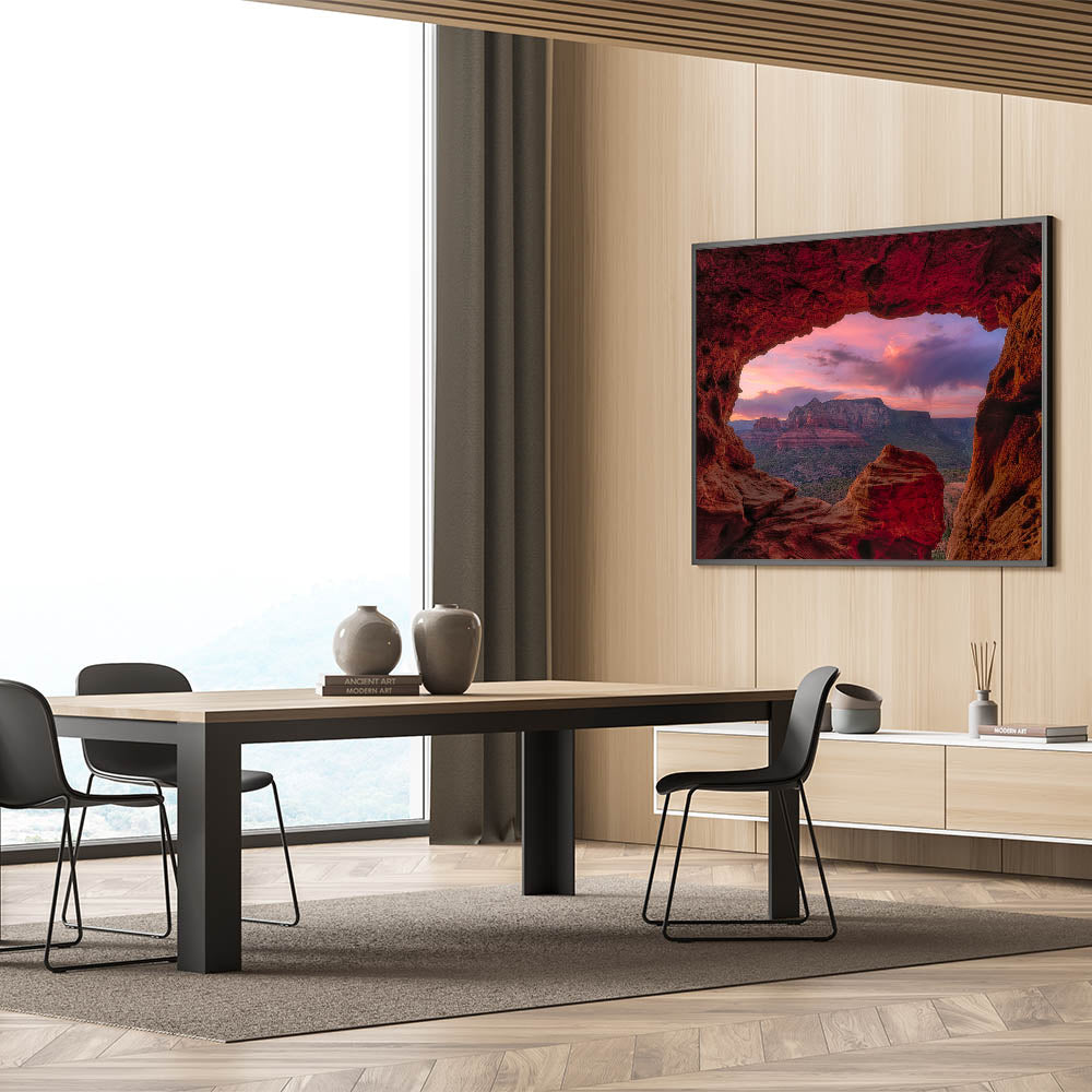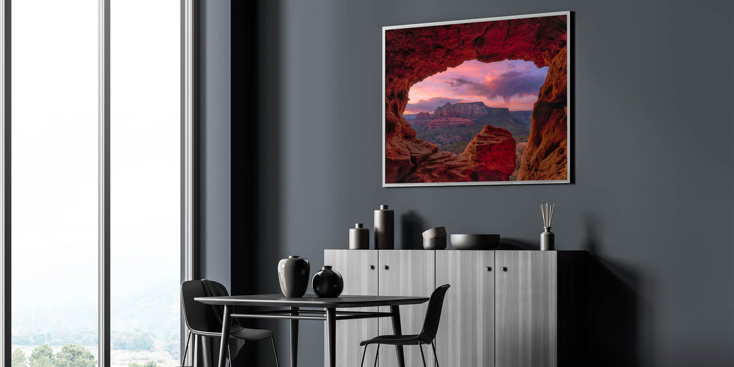 Bring the enchanting beauty of Sedona’s red rock landscape into your home with this breathtaking wall art. Captured from within a cave, this unique perspective showcases the iconic red rocks of Arizona under a vivid sunset sky. The rich reds and purples of the sunset enhance the natural beauty of the rock formations, creating a dramatic and serene scene. Available in various high-quality formats, including framed canvas, acrylic glass, and stretched canvas, this artwork is perfect for adding a touch of Arizona's majestic beauty to any space.