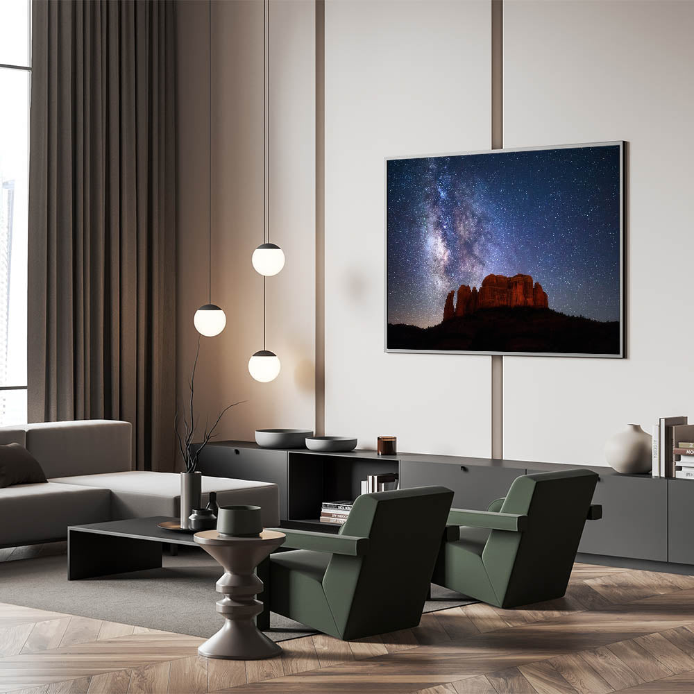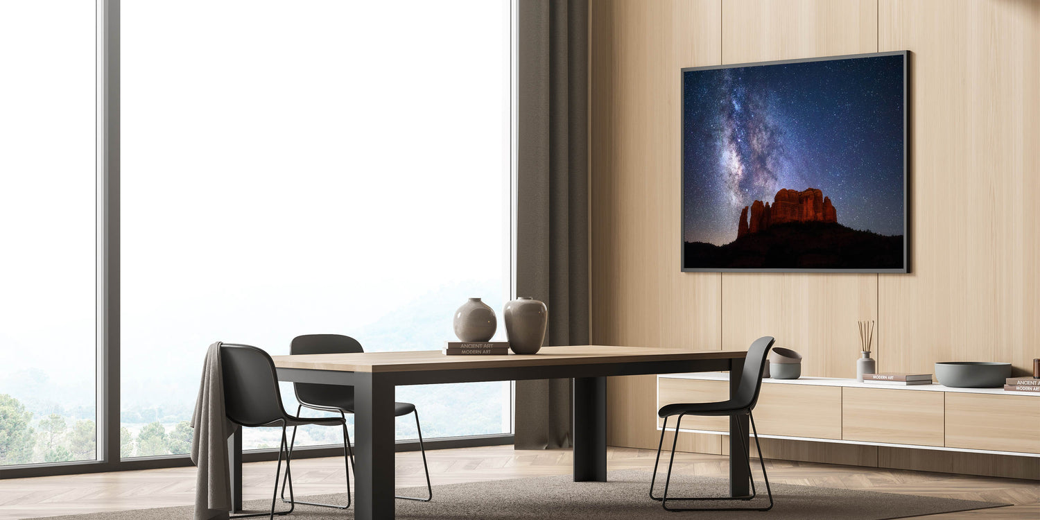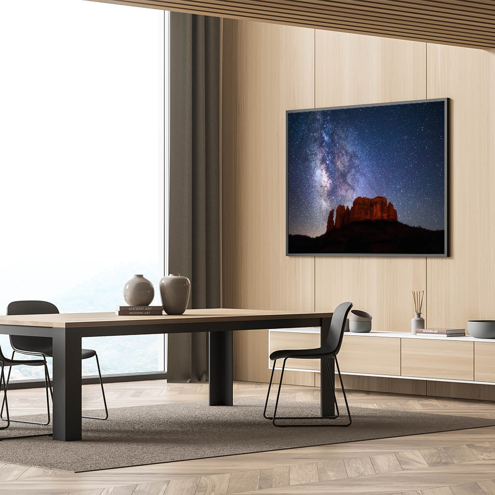 Experience the beauty of Sedona's dramatic night sky with this captivating piece of Sedona canyon art. Featuring a breathtaking view of the Milky Way illuminating the iconic red rock formations, this artwork transports you to the magical Arizona desert under a starlit sky. Perfect for lovers of both astronomy and landscape art, this print beautifully captures the unique blend of rugged canyon beauty and celestial wonder. Available in a range of high-quality formats including stretched canvas, framed canvas, and acrylic glass, this piece brings the serenity of the Sedona night right into your home.