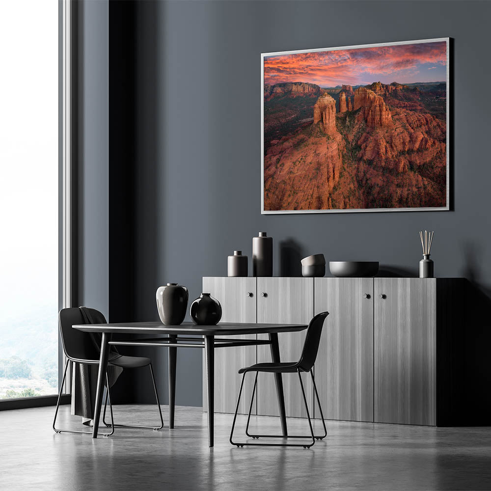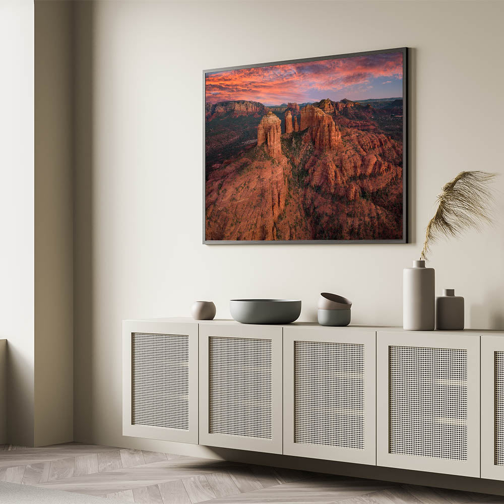 - High-quality Sedona art prints available in stretched canvas, framed canvas, and acrylic glass