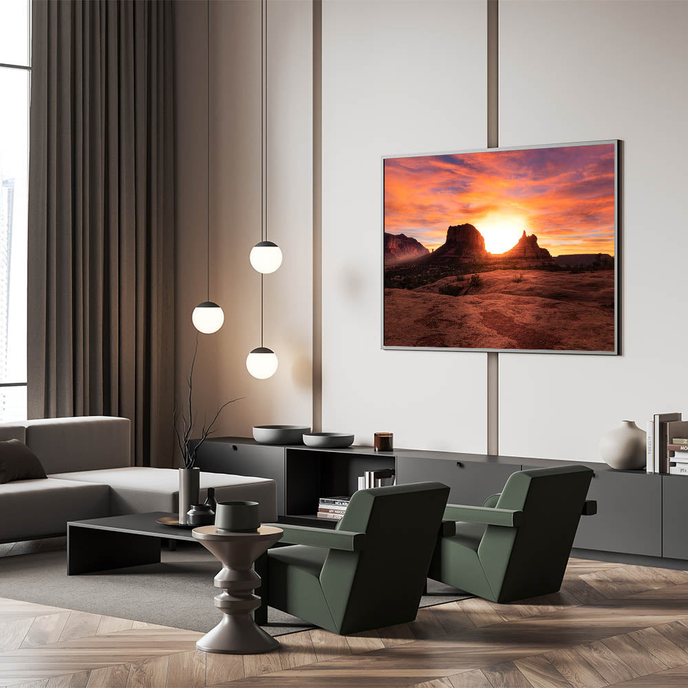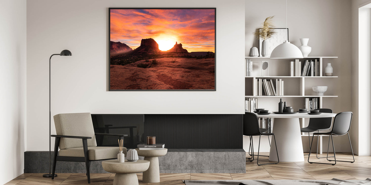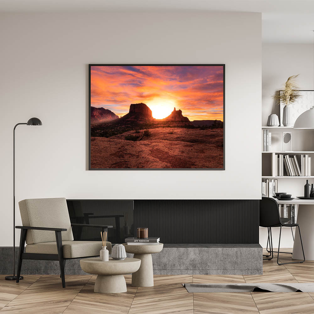 Experience the breathtaking beauty of an Arizona sunset with this stunning Sedona wall art. The glowing sun sets behind Sedona’s iconic rock formations, casting a warm, golden light over the red rocks and desert landscape. The vibrant orange and pink hues in the sky create a truly mesmerizing scene that will transform any room. Available in various high-quality formats, including stretched canvas, framed canvas, and acrylic glass, this artwork is perfect for bringing the natural beauty of Sedona into your home.