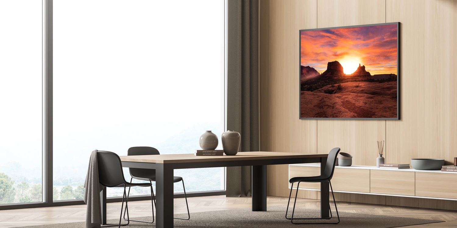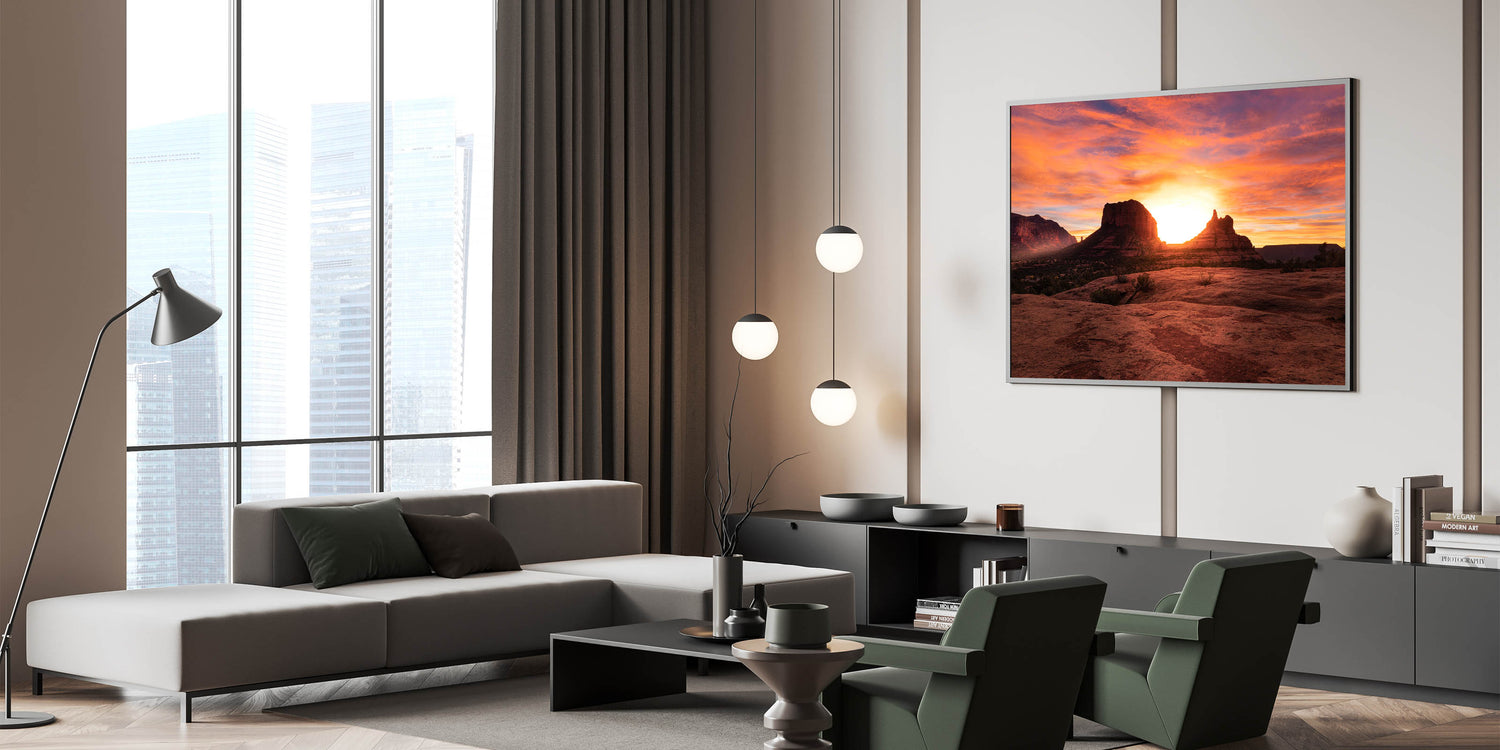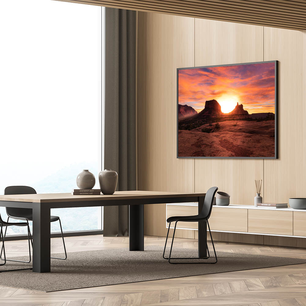 Experience the breathtaking beauty of an Arizona sunset with this stunning Sedona wall art. The glowing sun sets behind Sedona’s iconic rock formations, casting a warm, golden light over the red rocks and desert landscape. The vibrant orange and pink hues in the sky create a truly mesmerizing scene that will transform any room. Available in various high-quality formats, including stretched canvas, framed canvas, and acrylic glass, this artwork is perfect for bringing the natural beauty of Sedona into your home.