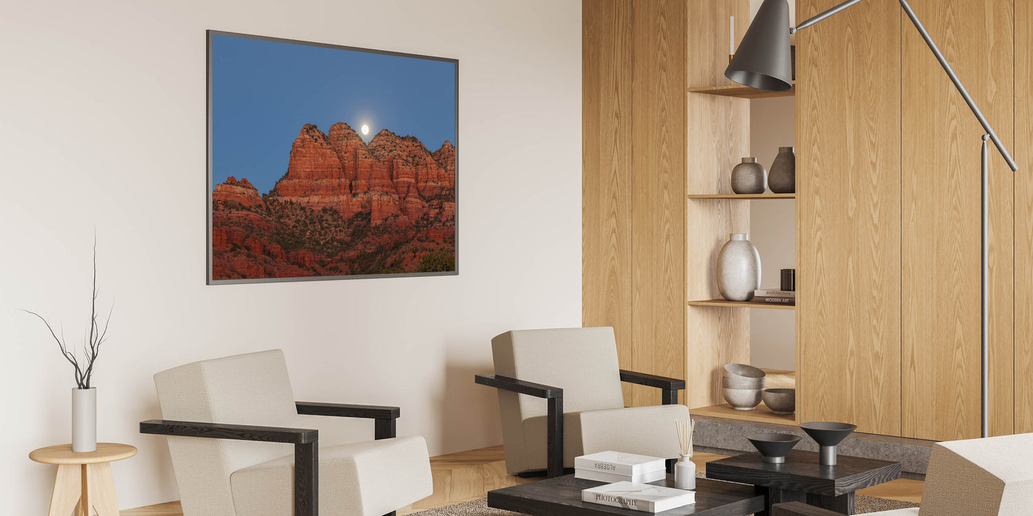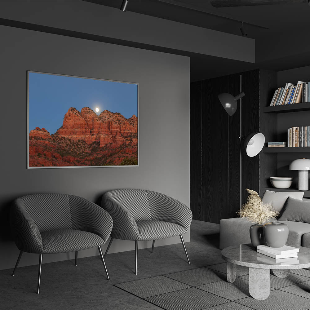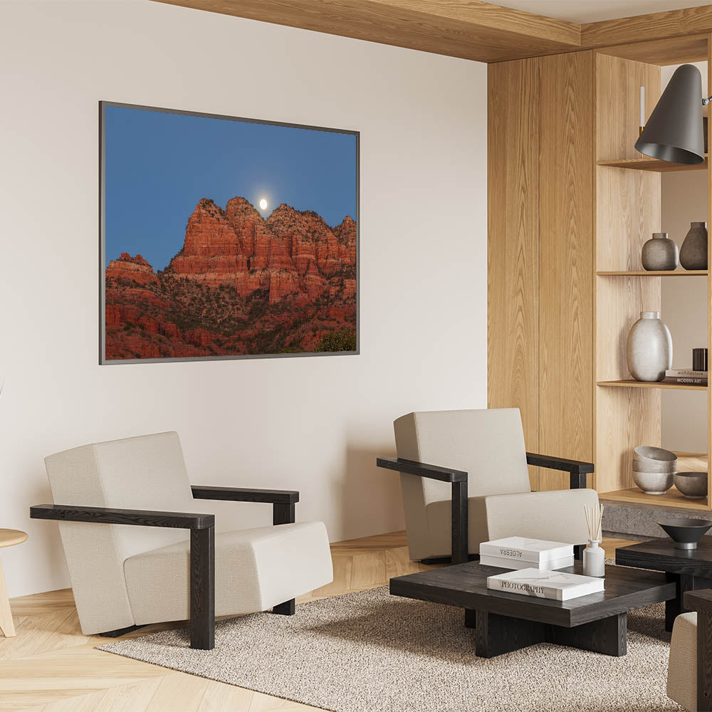 Capture the beauty of Arizona's natural wonders with this stunning piece of Sedona wall art. Featuring a serene moonrise over Sedona's iconic red rock formations, this artwork brings the captivating views of the desert right into your home. Perfect for adding a sense of tranquility and the vibrant beauty of Sedona’s landscapes, this piece is available in various high-quality materials including stretched canvas, framed canvas, acrylic glass, and framed prints.