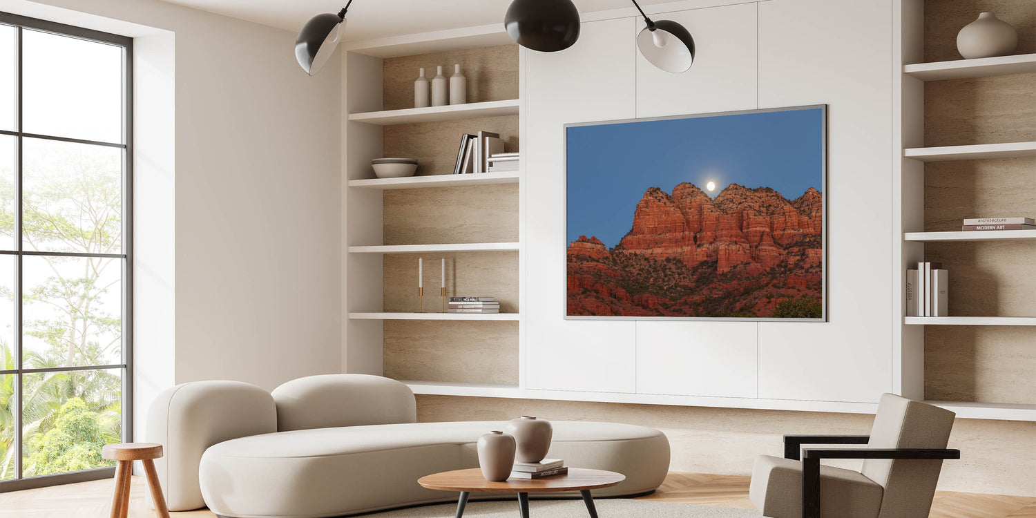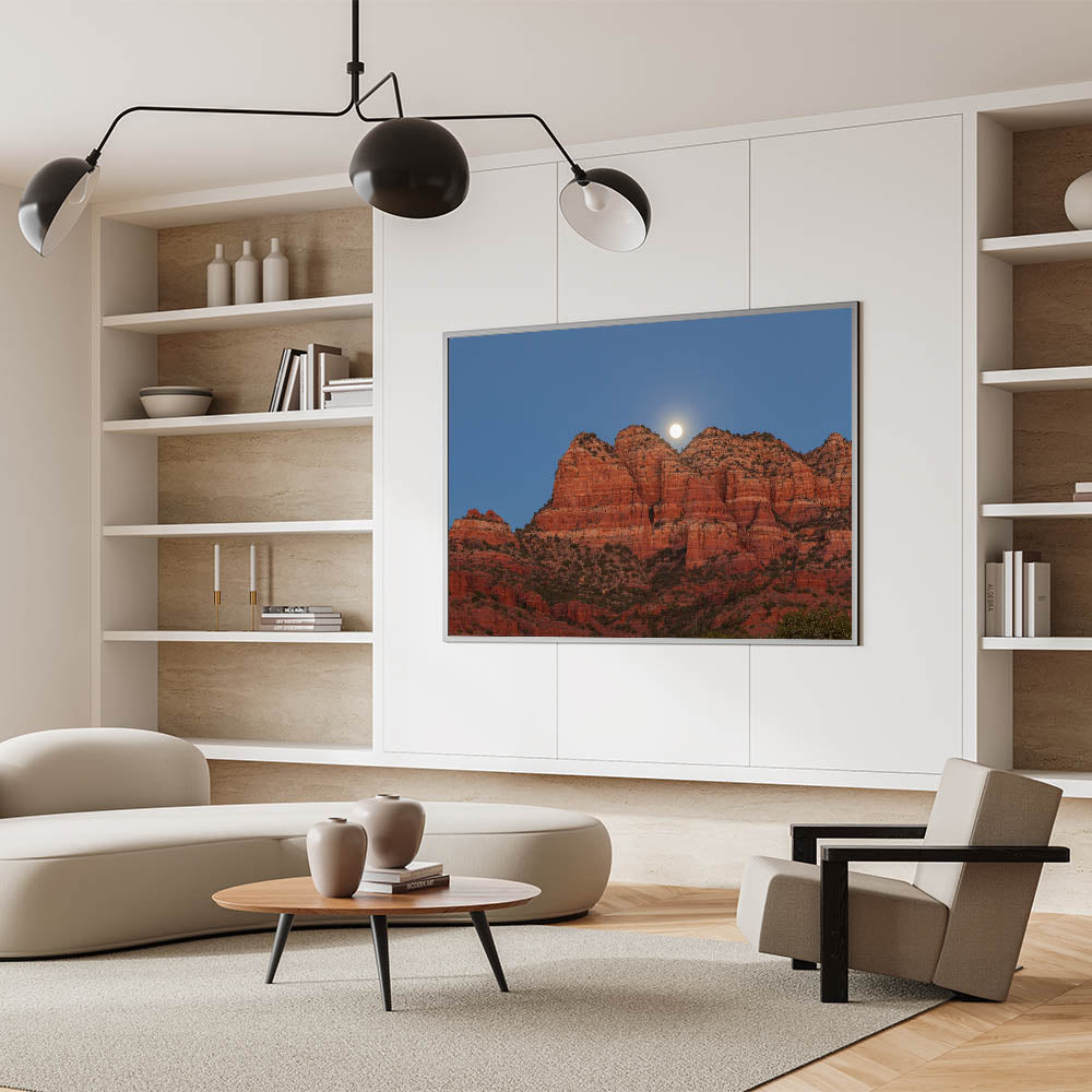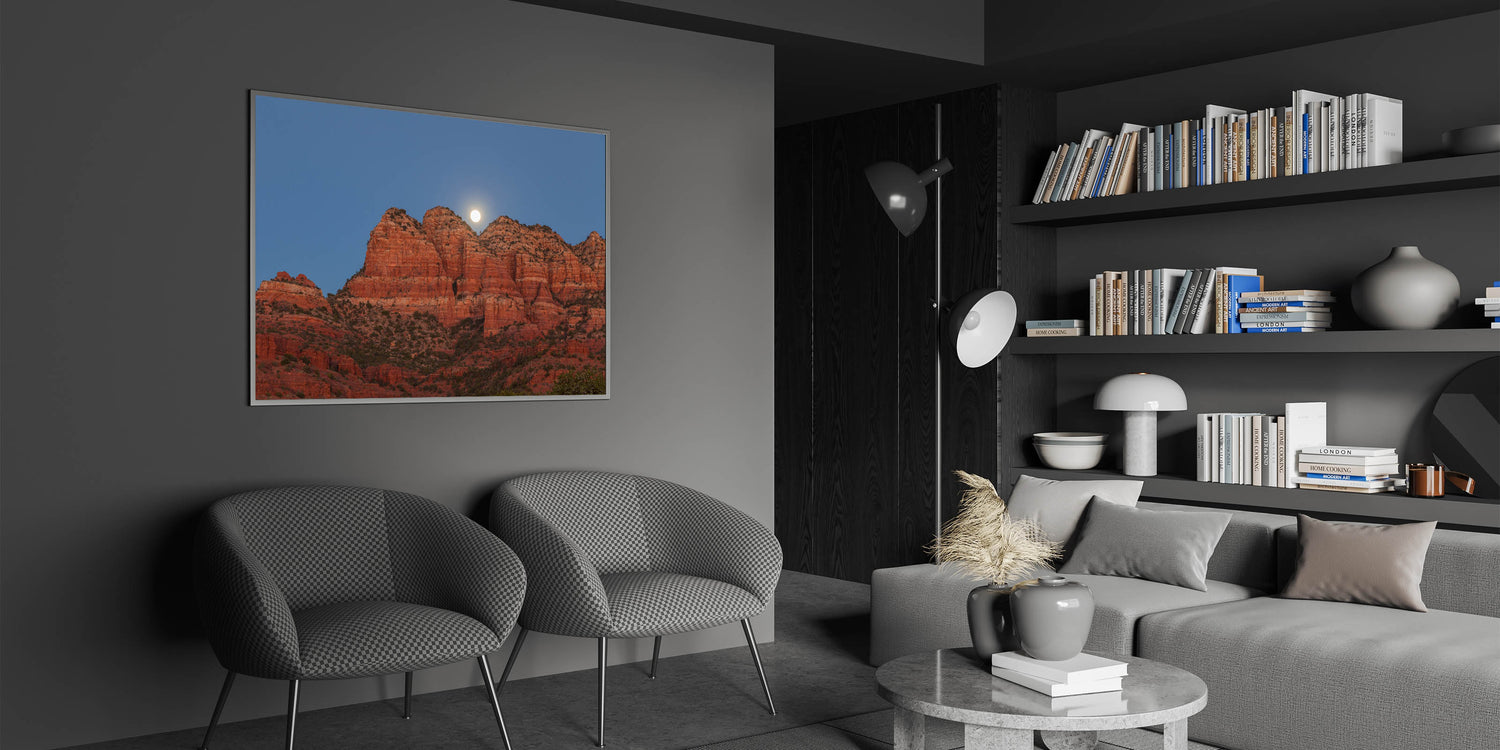 Capture the beauty of Arizona's natural wonders with this stunning piece of Sedona wall art. Featuring a serene moonrise over Sedona's iconic red rock formations, this artwork brings the captivating views of the desert right into your home. Perfect for adding a sense of tranquility and the vibrant beauty of Sedona’s landscapes, this piece is available in various high-quality materials including stretched canvas, framed canvas, acrylic glass, and framed prints.