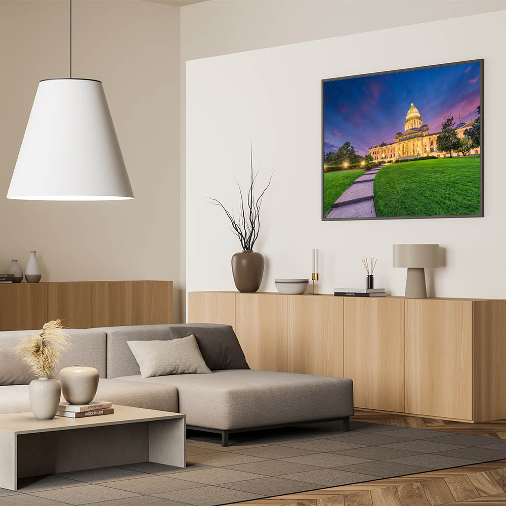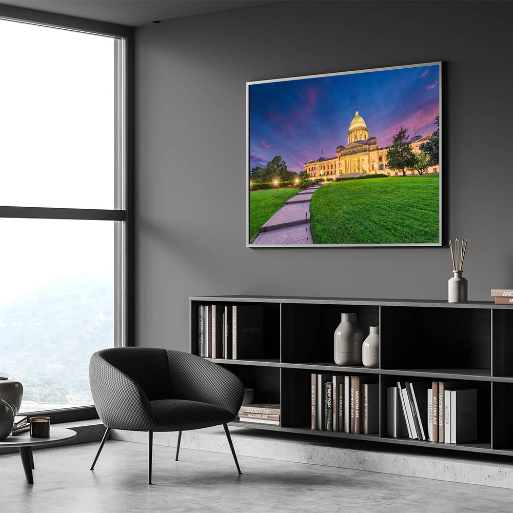 Experience the grandeur of Arkansas’s iconic Capitol building at twilight with this stunning art print. The twilight sky’s rich purples and pinks provide a dramatic backdrop to the Capitol’s majestic architecture, while the lush green lawn in the foreground adds a natural balance. This piece of art beautifully combines the historic elegance of the Capitol with the natural beauty of Arkansas’s landscapes, making it a perfect addition to any space.