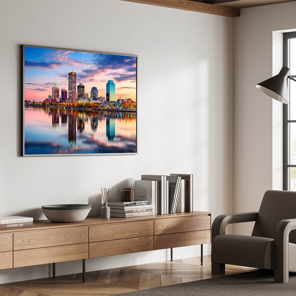 Celebrate the vibrant beauty of Little Rock’s skyline with this stunning cityscape art print. The reflections of the buildings and autumn trees on the calm water below create a dynamic and serene composition. The sunset or twilight sky casts soft hues of pink, orange, and blue, adding warmth to the modern skyline. This piece is perfect for lovers of urban landscapes and Arkansas state posters, bringing a mix of nature and architecture into your home decor.