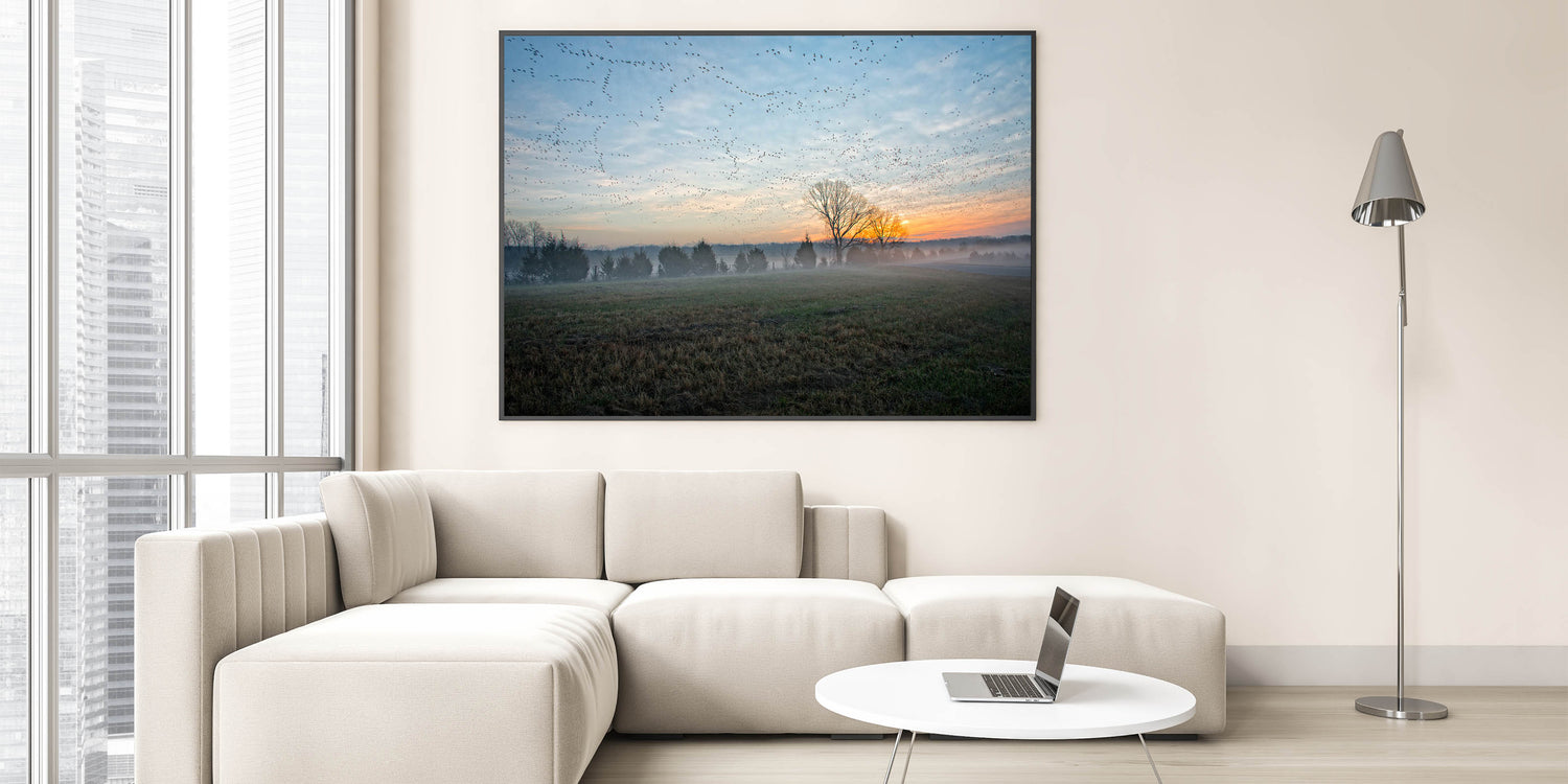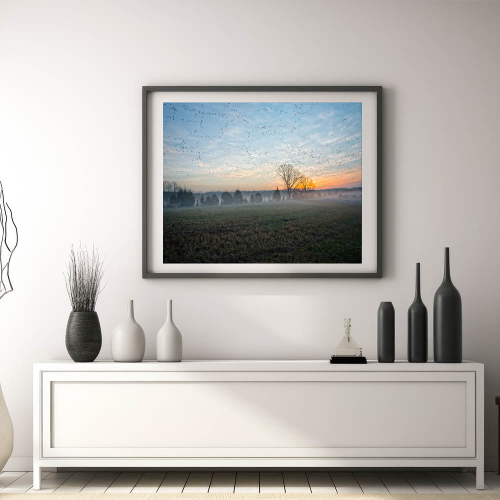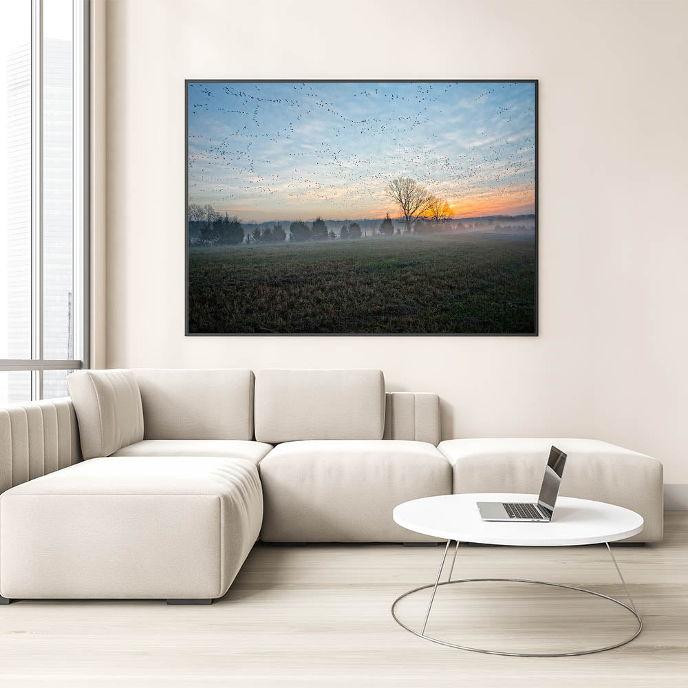 Bring the peaceful beauty of Arkansas into your home with this stunning landscape print featuring the misty dawn over the Ozark Mountains. Captured in perfect detail, this artwork portrays a serene morning with the sun gently rising over the horizon, a sky full of birds, and the quiet stillness of the land. It is a perfect piece for those who love rustic Arkansas scenes and want to enhance their space with nature-inspired Arkansas prints.