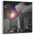 - Vivid color contrast between the American flag and the monochrome cityscape