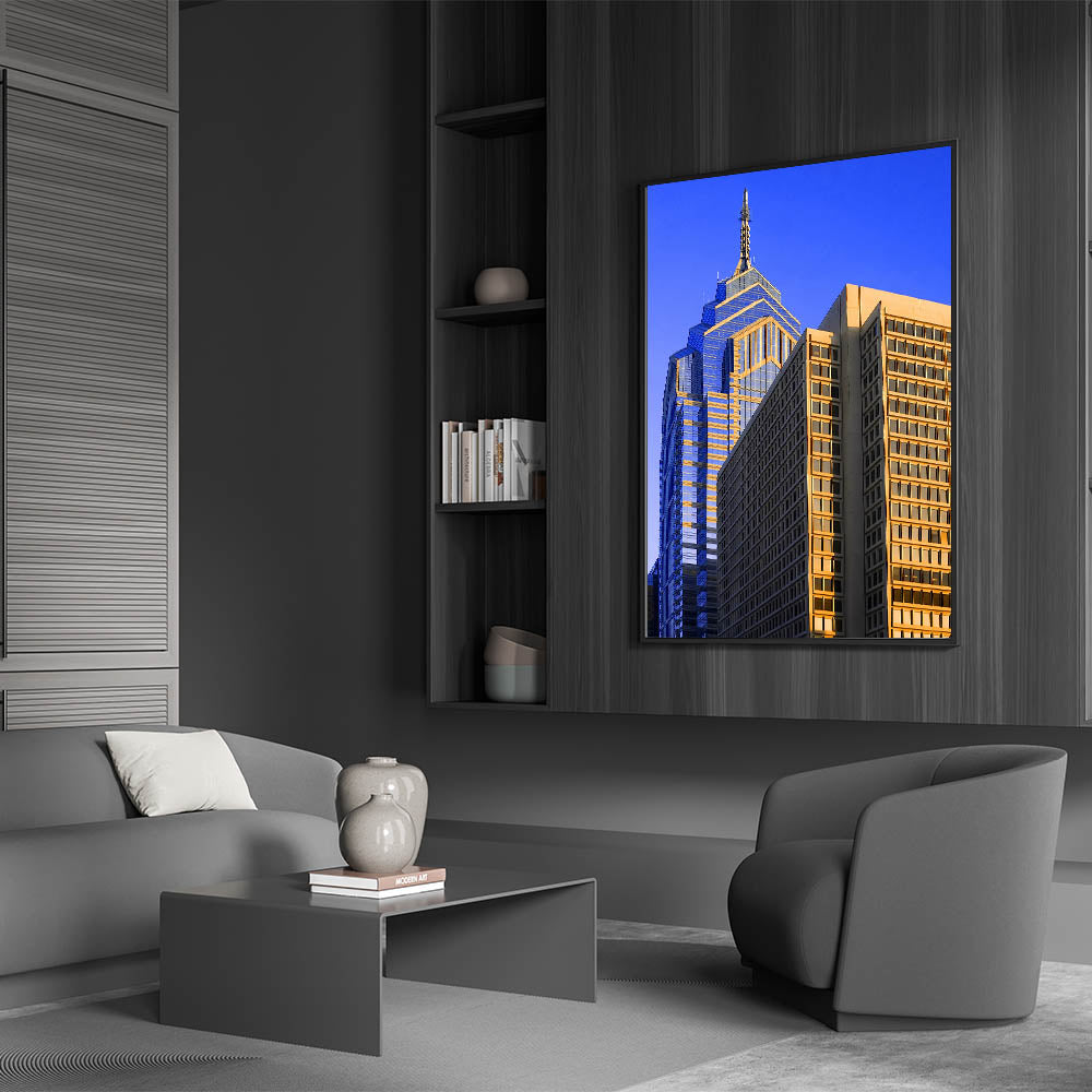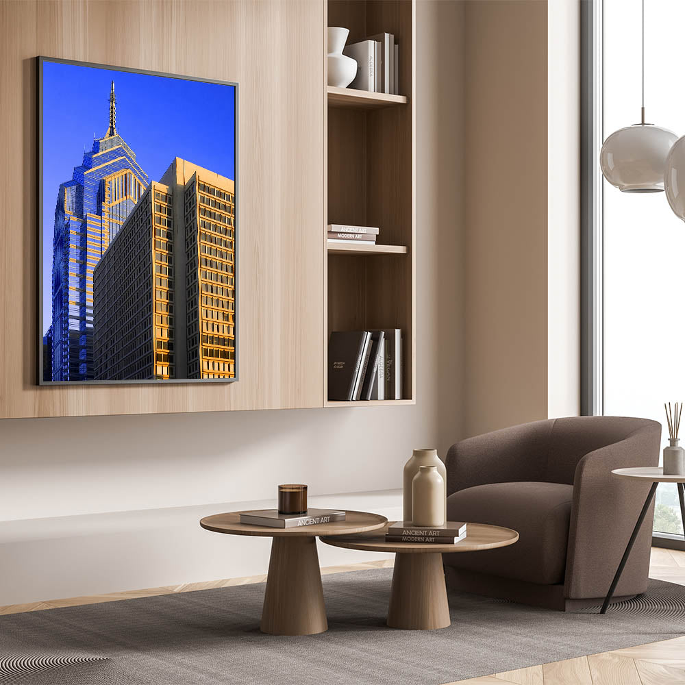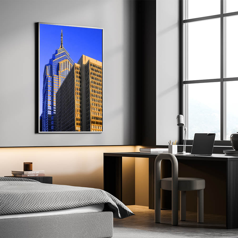 Capture the essence of Philadelphia with this striking cityscape artwork. This piece showcases the iconic skyline with a perfect balance of modern architecture and classic elegance. The vibrant blues of the sky contrast beautifully with the golden reflections on the buildings, making it a stunning addition to any space. Whether you're a proud resident or simply love the rich history and beauty of the city, this Philadelphia skyline wall art is an ideal choice for your home or office decor.