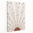 Add a touch of earthy elegance to your space with this abstract sunburst design. The dynamic lines, accented by geometric dots in warm tones of brown, green, and peach, radiate outward from a bold central circle. This artwork creates a sense of movement and vibrancy, making it a perfect focal point for modern bohemian or minimalist interiors.