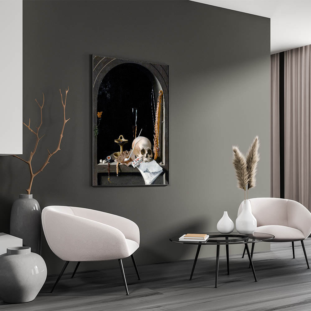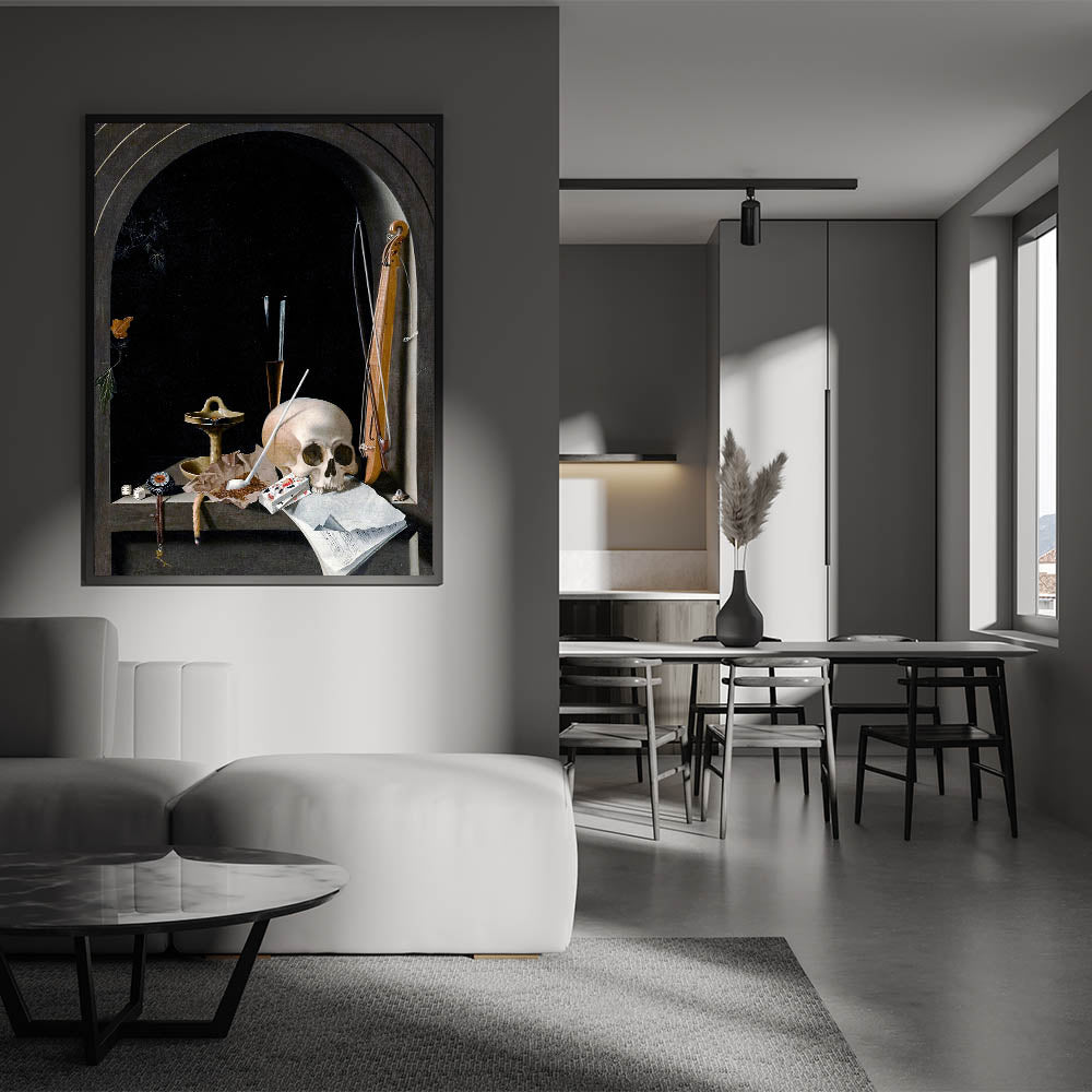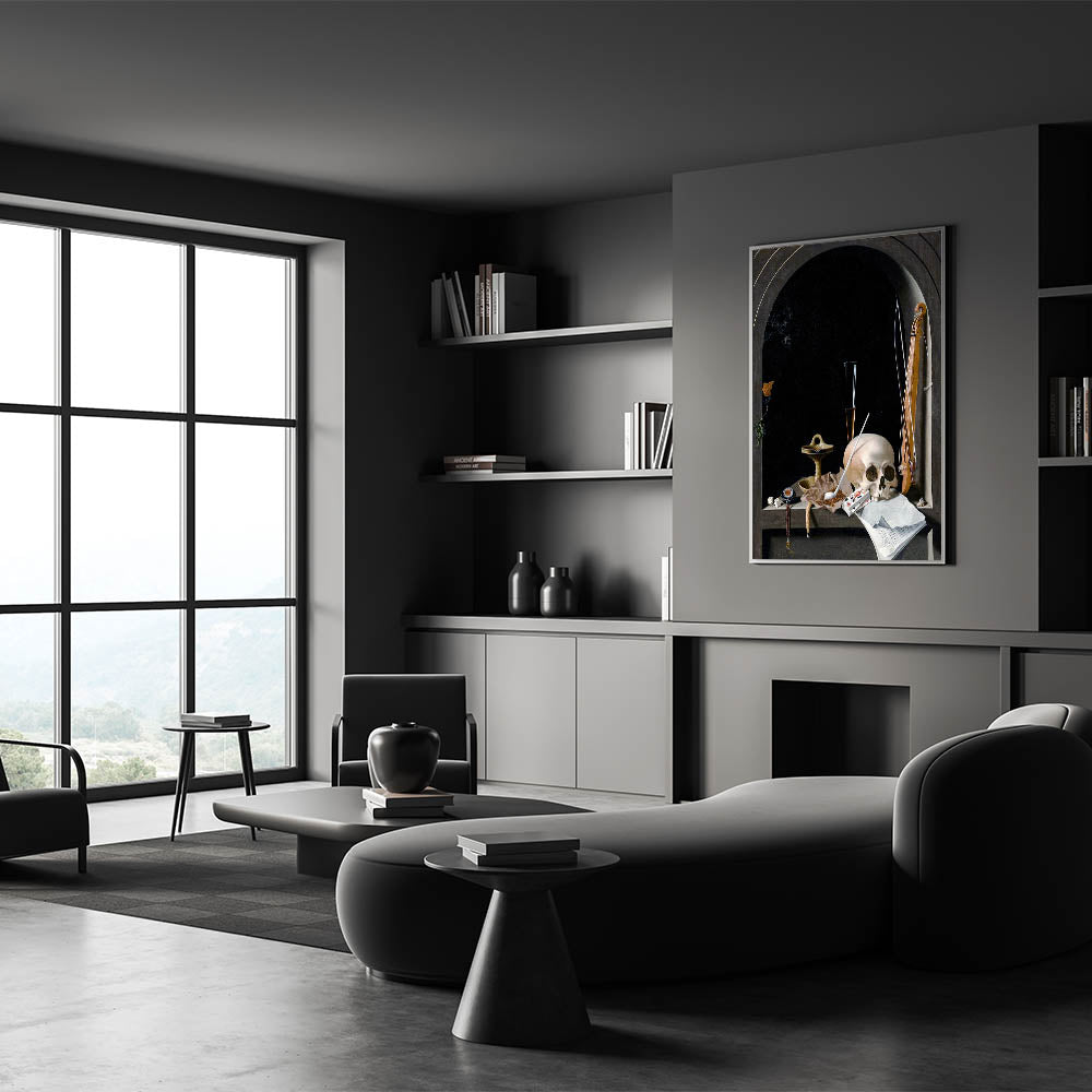 This striking Dark Academia wall art features a classic still life composition with deep gothic undertones. The centerpiece, a skull resting among symbolic objects like a musical instrument, a compass, and playing cards, captures the essence of life's fragility and the intellectual weight of the Dark Academia aesthetic. The dark backdrop and intricate details lend this piece a moody, atmospheric vibe that is perfect for any study, library, or living space where vintage academic style reigns supreme.