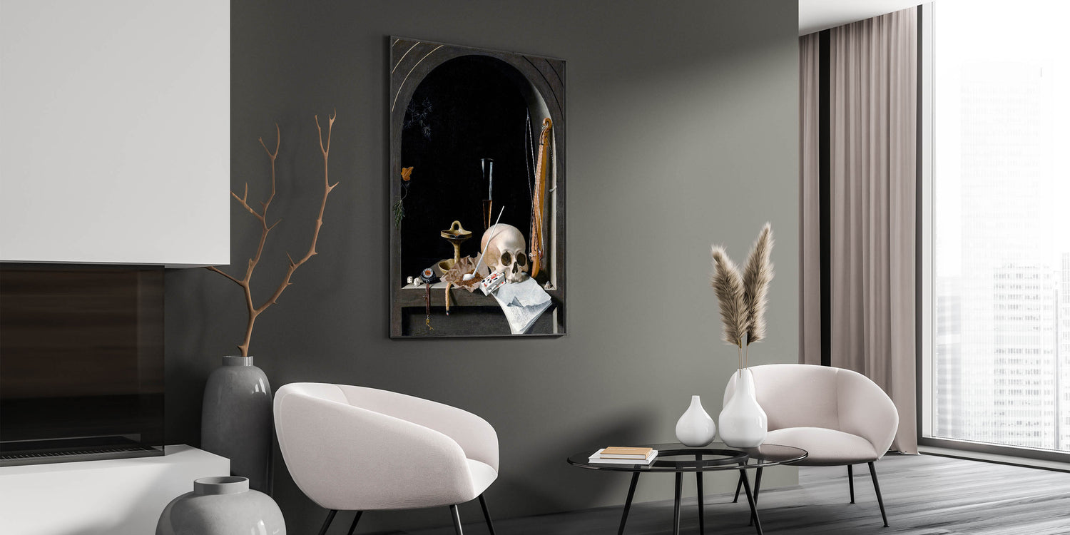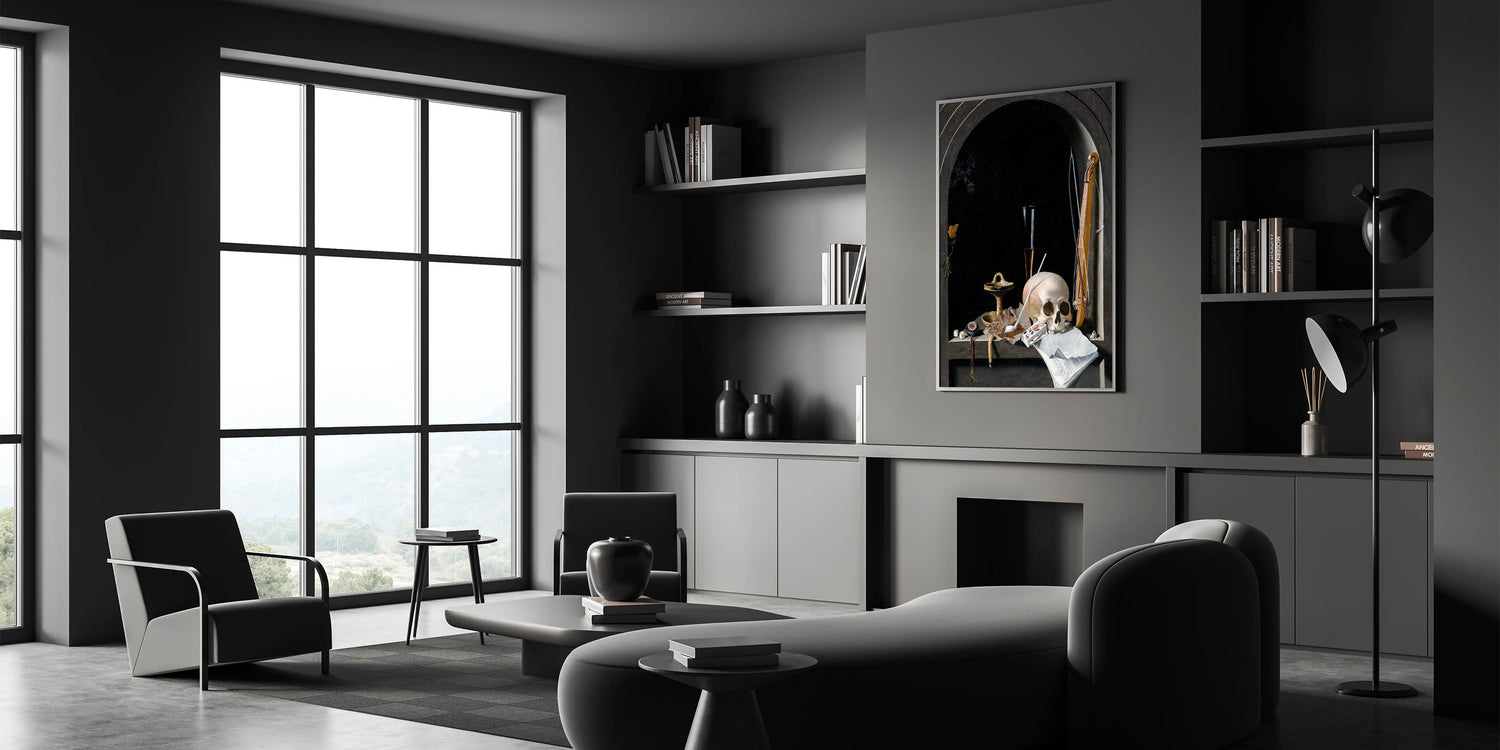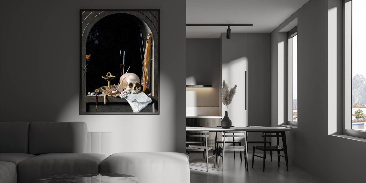 This striking Dark Academia wall art features a classic still life composition with deep gothic undertones. The centerpiece, a skull resting among symbolic objects like a musical instrument, a compass, and playing cards, captures the essence of life's fragility and the intellectual weight of the Dark Academia aesthetic. The dark backdrop and intricate details lend this piece a moody, atmospheric vibe that is perfect for any study, library, or living space where vintage academic style reigns supreme.