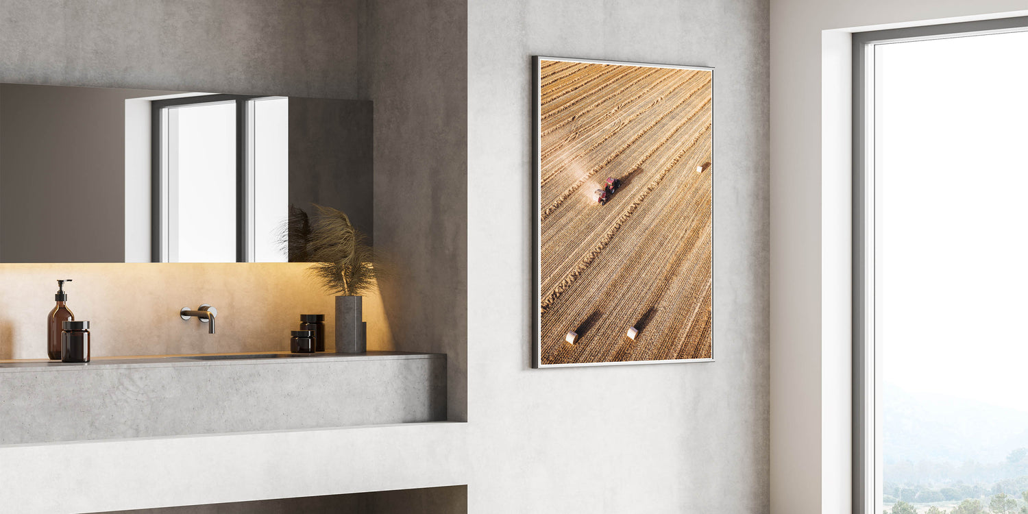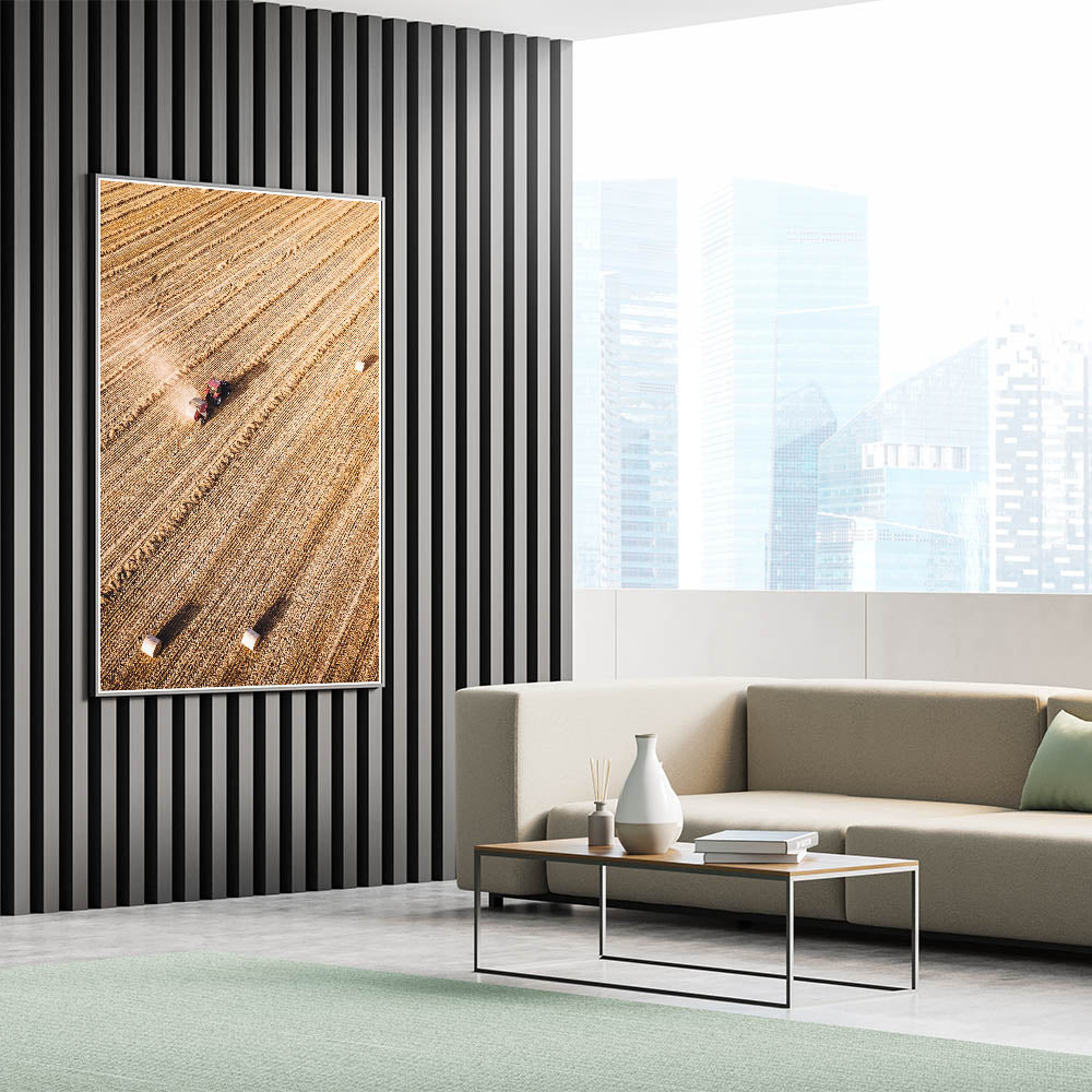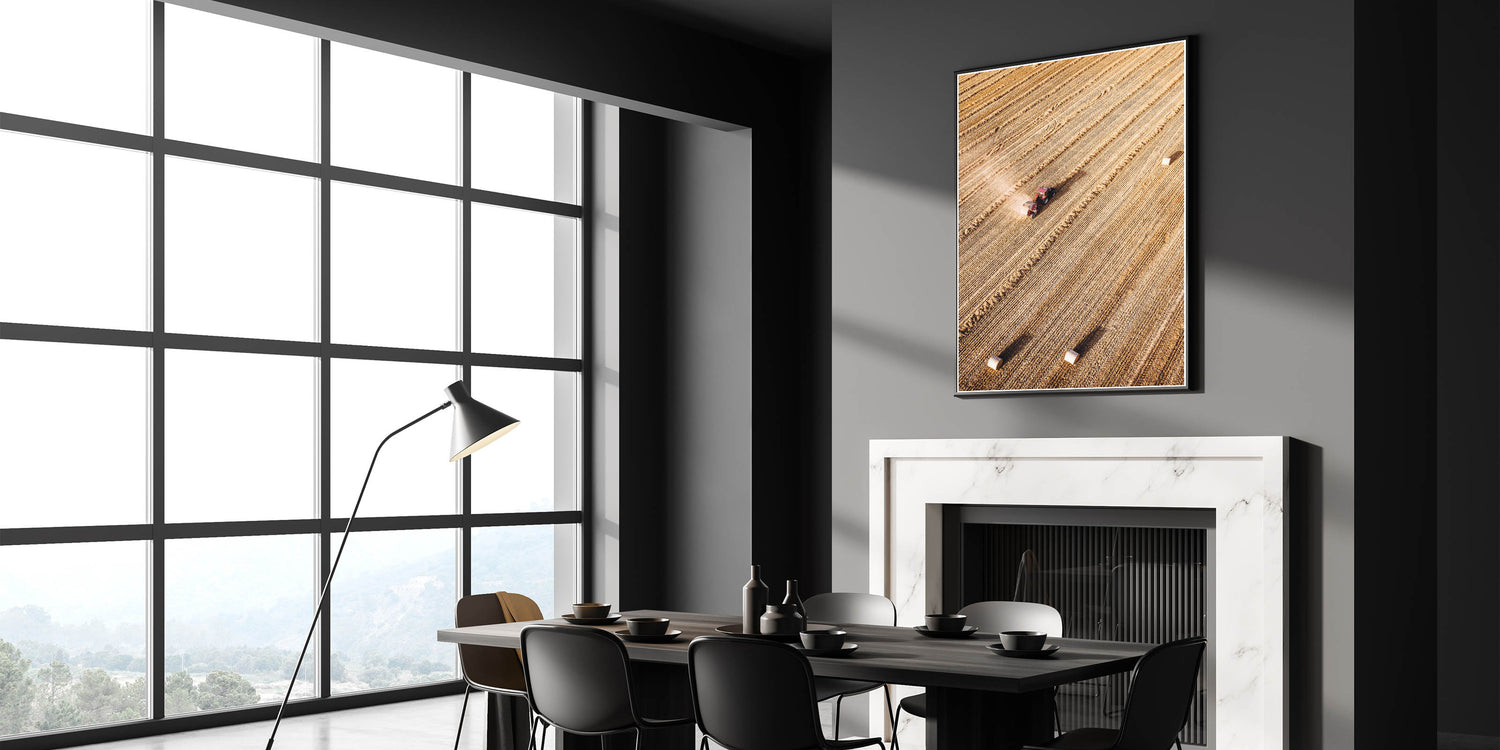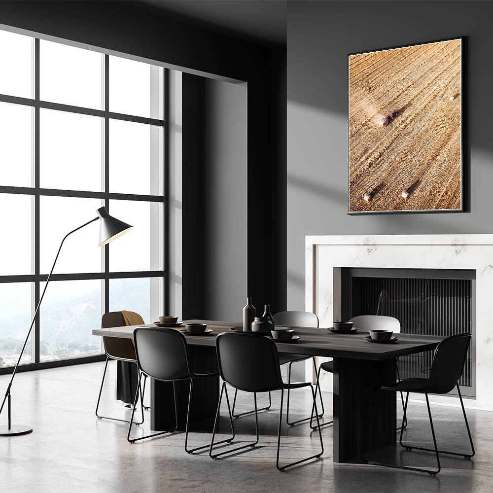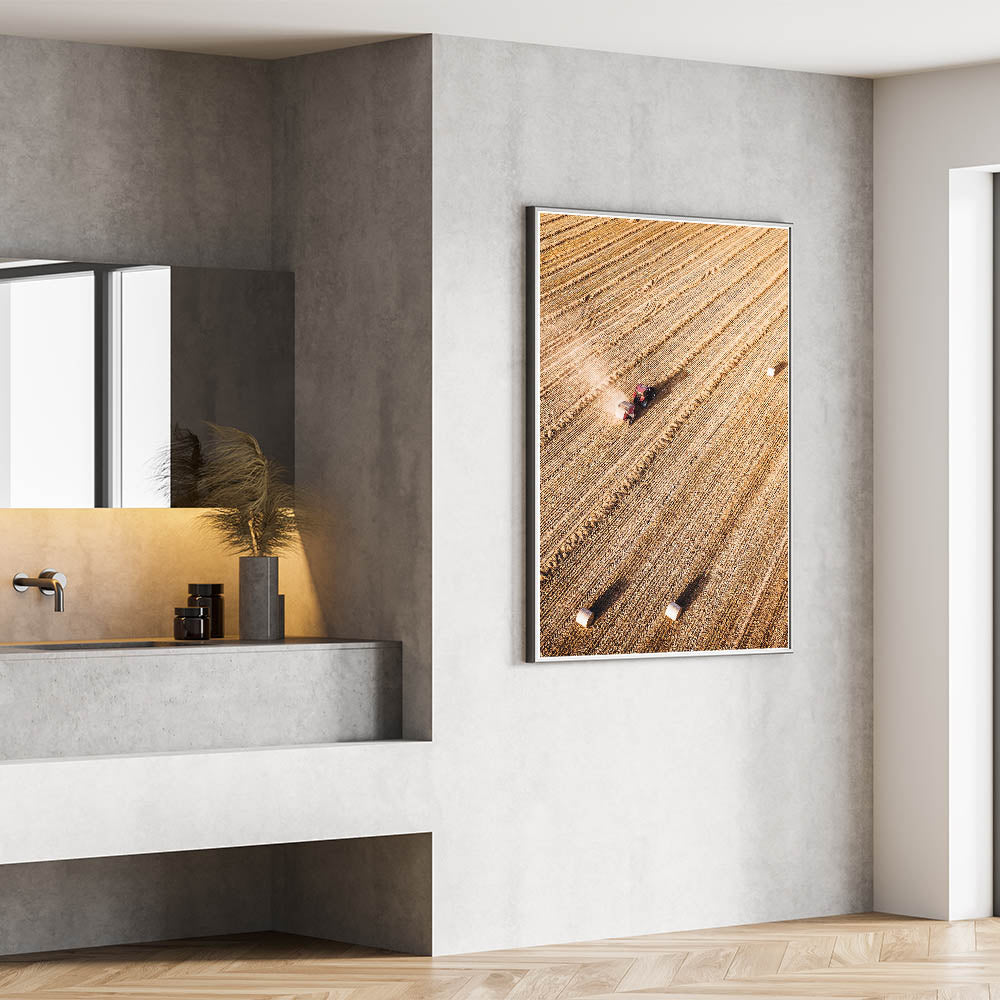 Embrace the spirit of the harvest with "Harvest Glow," a stunning aerial depiction of a tractor at work, perfect for anyone who loves rustic or farmhouse decor. This art print showcases the vibrant yet earthy tones of a working field, capturing the essence of rural life.