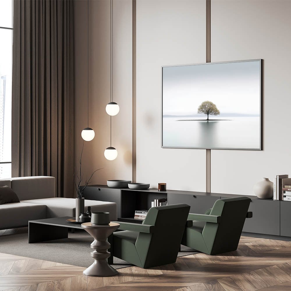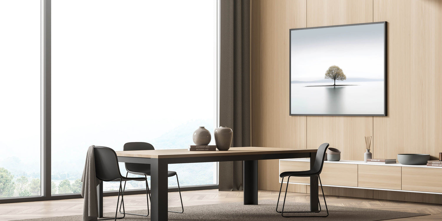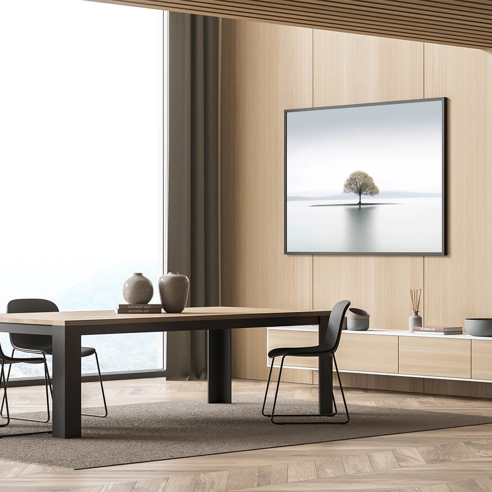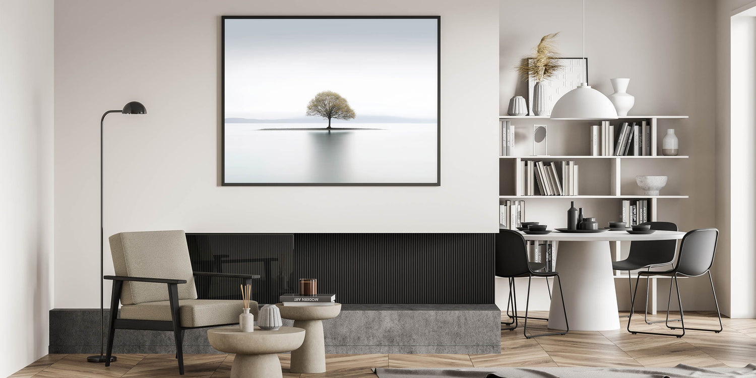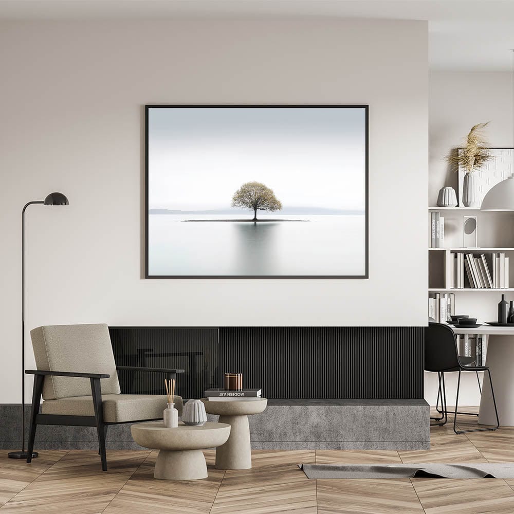 Capture the essence of solitude and tranquility with this breathtaking fine art photography framed print. Featuring a single tree standing gracefully on a strip of land, surrounded by still water and a soft sky, this composition evokes serenity and balance. The muted palette of soft grays, beiges, and subtle blues makes it a perfect choice for minimalist and modern interiors.