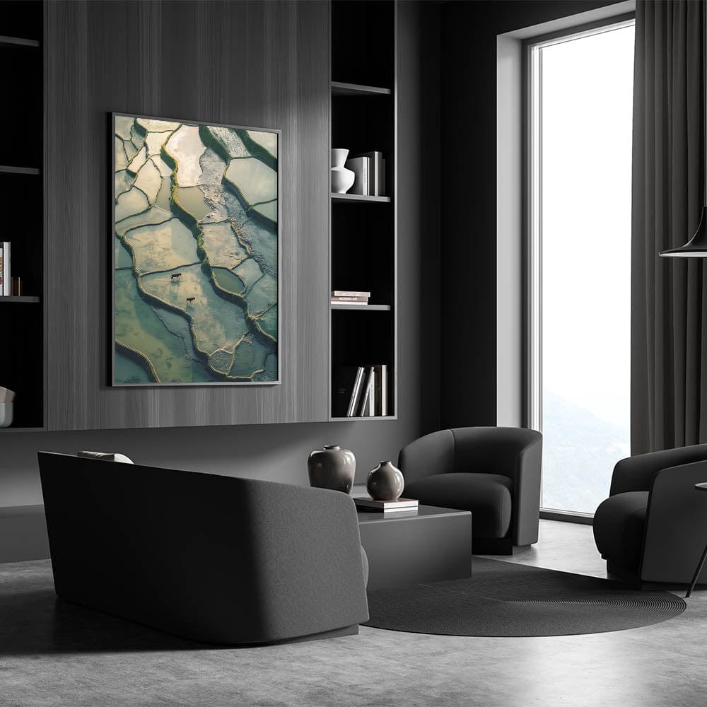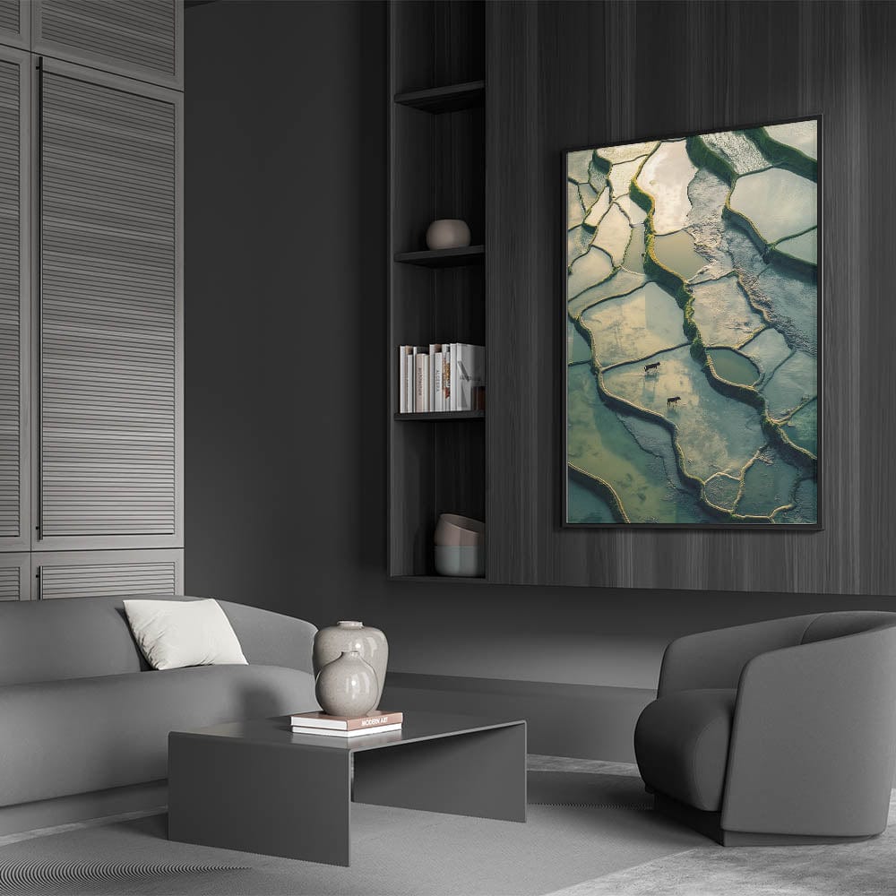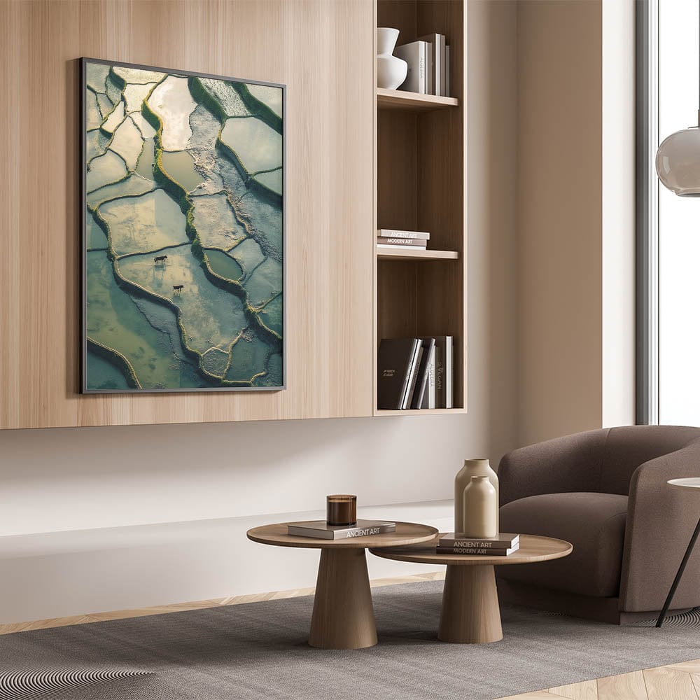 This Minimalist Landscape Wall Art presents a mesmerizing aerial view of terraced rice fields filled with reflective water, creating organic patterns in nature. The soft blend of greens, golds, and earthy browns enhances the Modern Minimalist Landscape Print, while two animals wading through the fields add a serene, life-filled element.