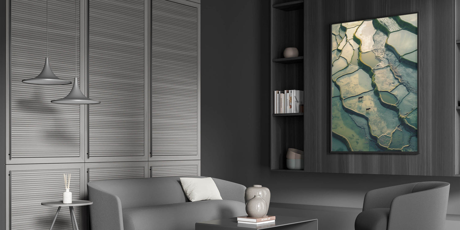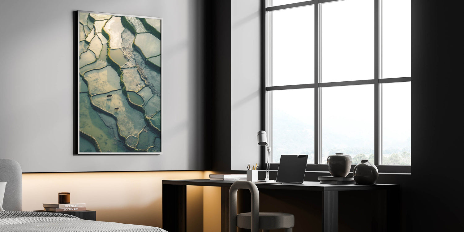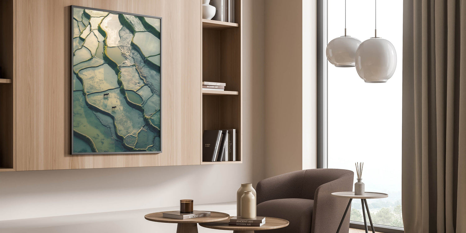 This Minimalist Landscape Wall Art presents a mesmerizing aerial view of terraced rice fields filled with reflective water, creating organic patterns in nature. The soft blend of greens, golds, and earthy browns enhances the Modern Minimalist Landscape Print, while two animals wading through the fields add a serene, life-filled element.
