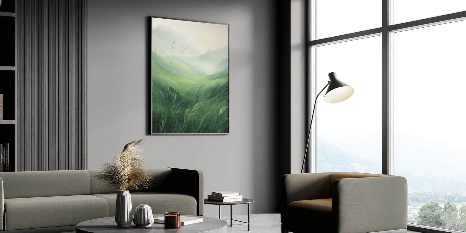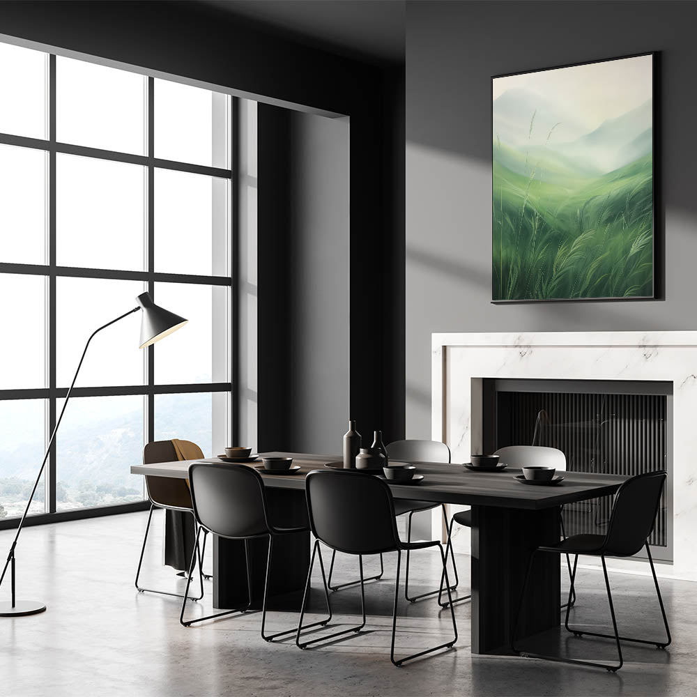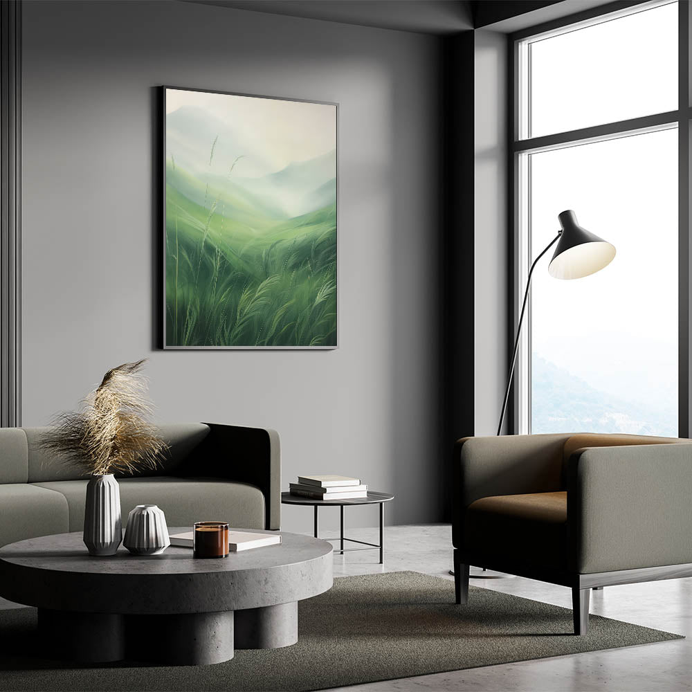 This serene electric wall art piece captures the beauty of a misty green landscape with soft gradients and lush, flowing grasses. The soothing shades of green and the gentle rise of hills create a tranquil atmosphere, inviting viewers into a peaceful and immersive natural setting. Ideal for spaces that seek to evoke a sense of calm and connection with nature, this artwork offers a serene aesthetic that enhances modern and contemporary decor. Perfect for living rooms, bedrooms, or offices, this piece brings a touch of nature's tranquility into any space, allowing you to experience the peacefulness of an early morning mist.