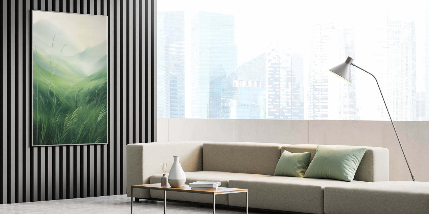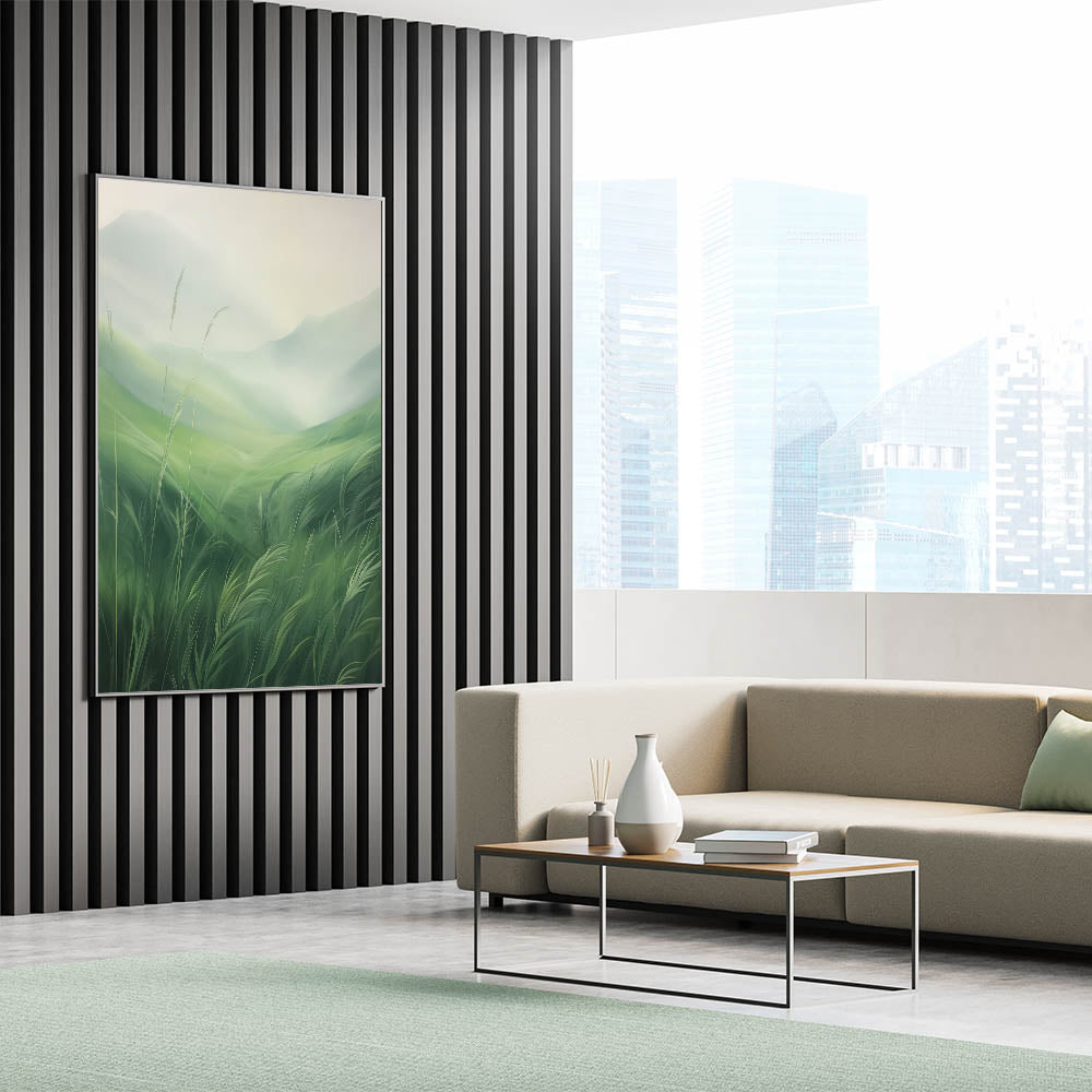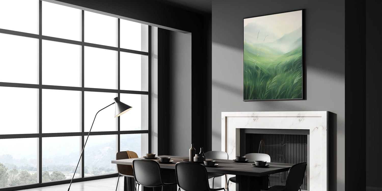 This serene electric wall art piece captures the beauty of a misty green landscape with soft gradients and lush, flowing grasses. The soothing shades of green and the gentle rise of hills create a tranquil atmosphere, inviting viewers into a peaceful and immersive natural setting. Ideal for spaces that seek to evoke a sense of calm and connection with nature, this artwork offers a serene aesthetic that enhances modern and contemporary decor. Perfect for living rooms, bedrooms, or offices, this piece brings a touch of nature's tranquility into any space, allowing you to experience the peacefulness of an early morning mist.