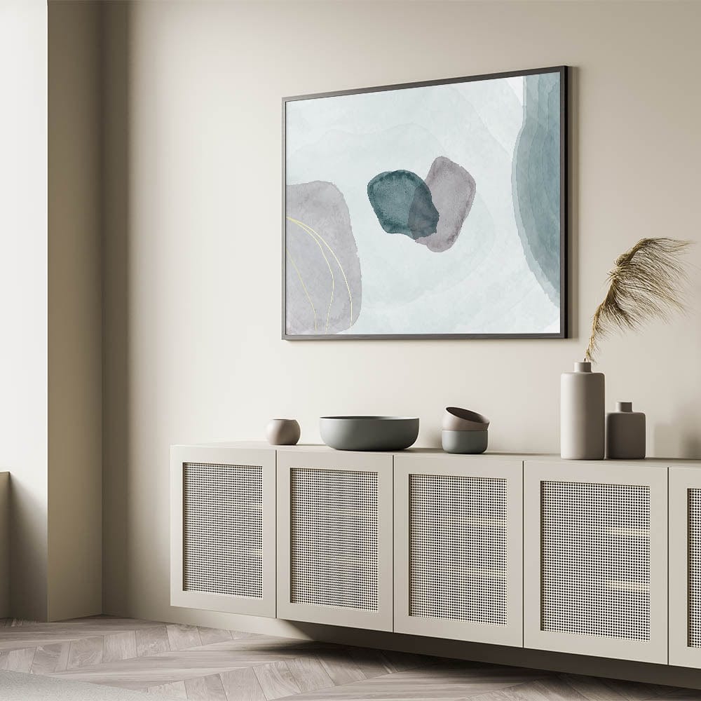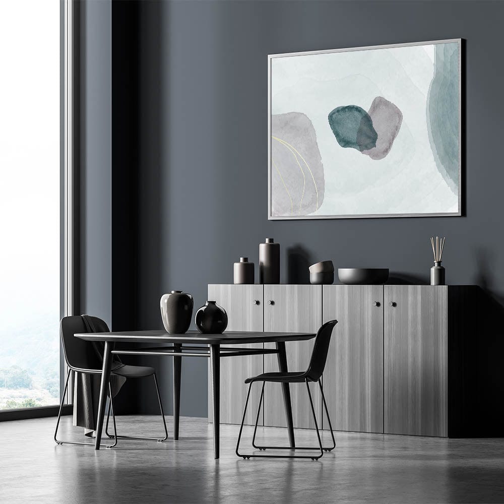Elevate your space with this modern abstract fluid art. Featuring soft gray tones blended with rich teal accents and delicate gold detailing, this minimalist wall decor embodies elegance and balance. The fluid watercolor-like movement and organic shapes make it a versatile piece suited for contemporary interiors.