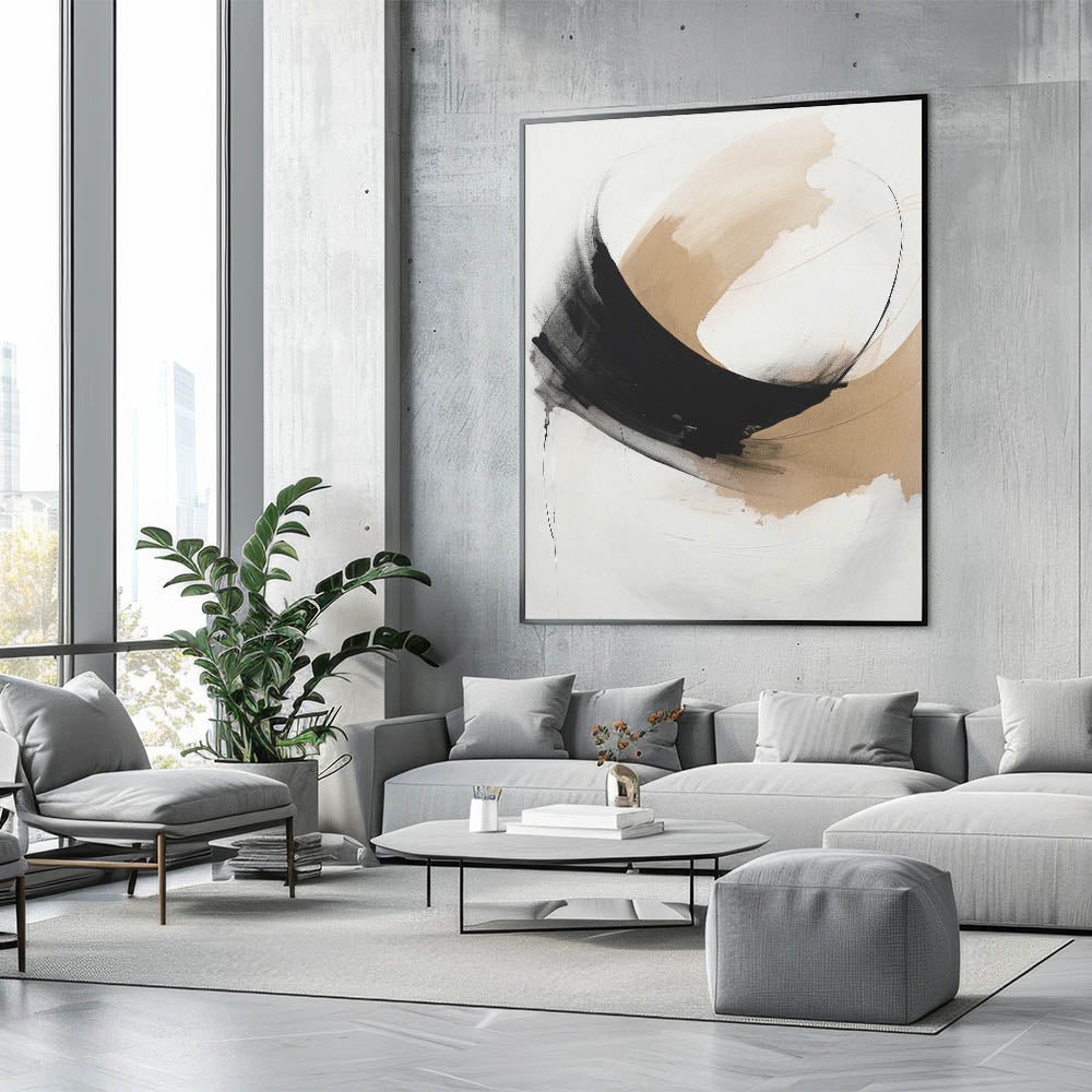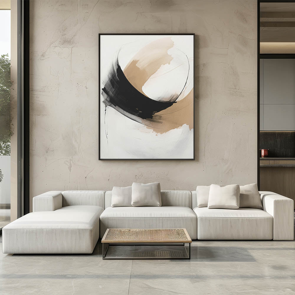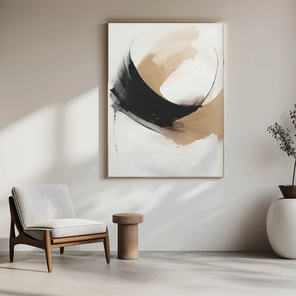 Make a statement in your living space with this striking piece of modern abstract wall art. This artwork features a bold contrast of deep black and warm beige tones, brought together in a dynamic, sweeping minimalist design. The fluid, curved strokes create a sense of movement and energy, making this piece an eye-catching addition to any contemporary or modern interior.