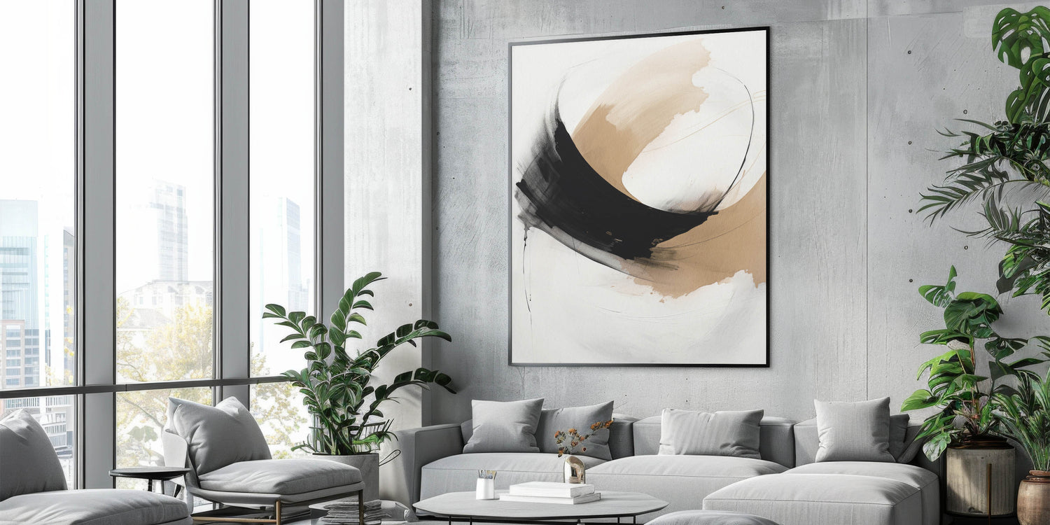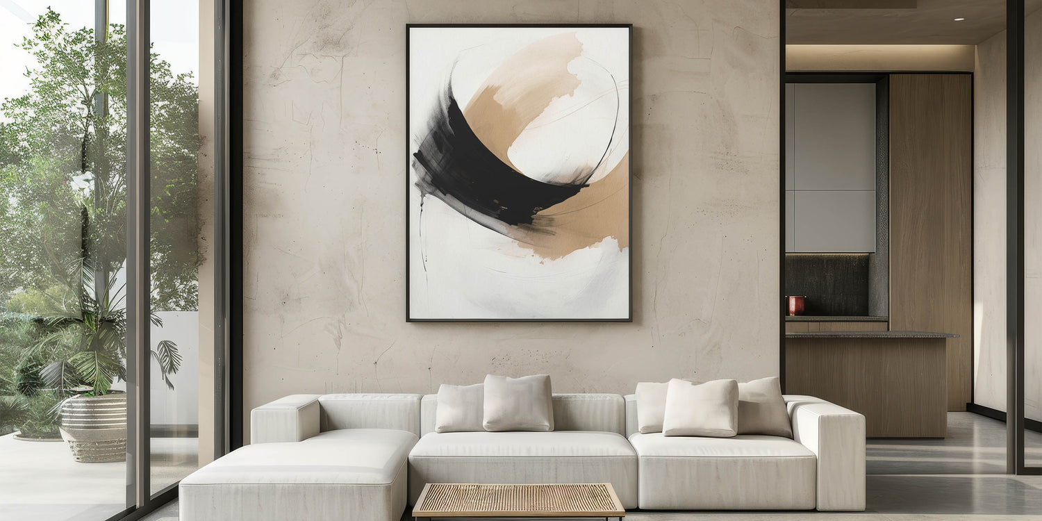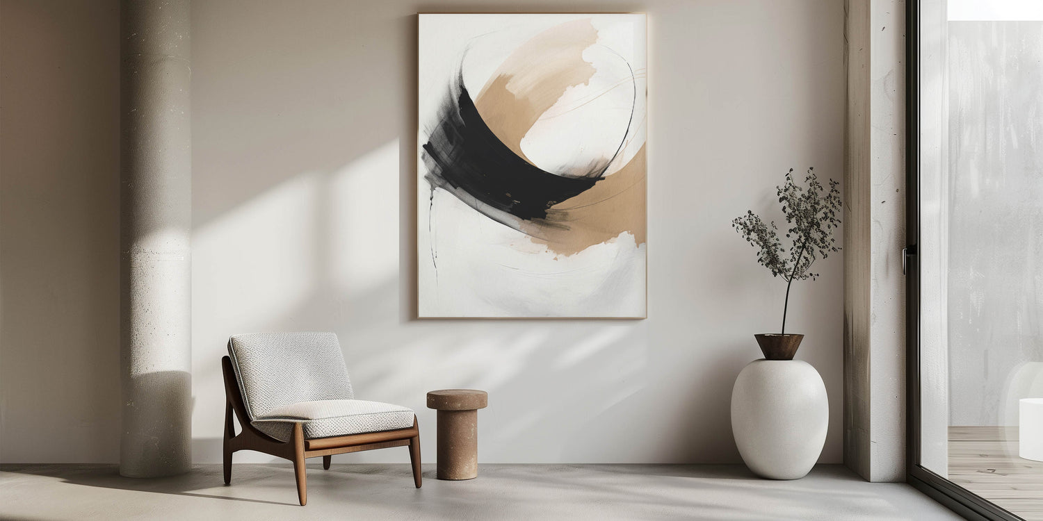 Make a statement in your living space with this striking piece of modern abstract wall art. This artwork features a bold contrast of deep black and warm beige tones, brought together in a dynamic, sweeping minimalist design. The fluid, curved strokes create a sense of movement and energy, making this piece an eye-catching addition to any contemporary or modern interior.