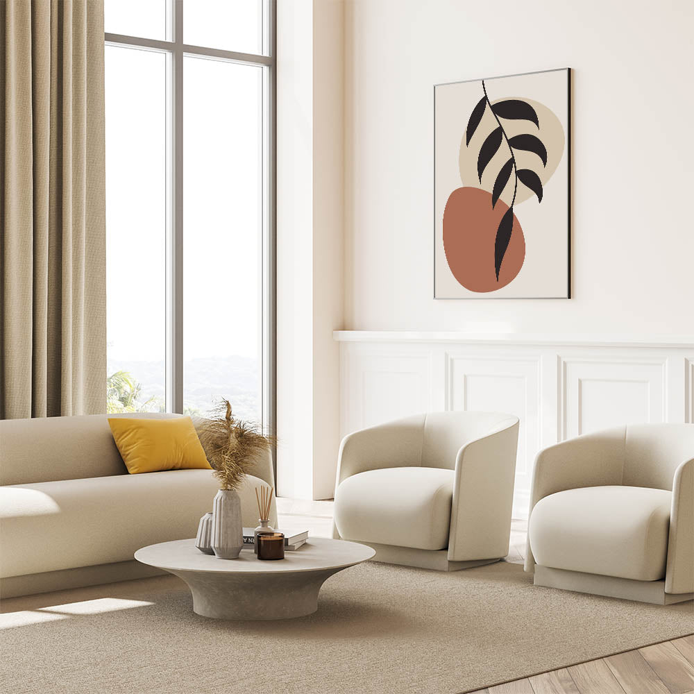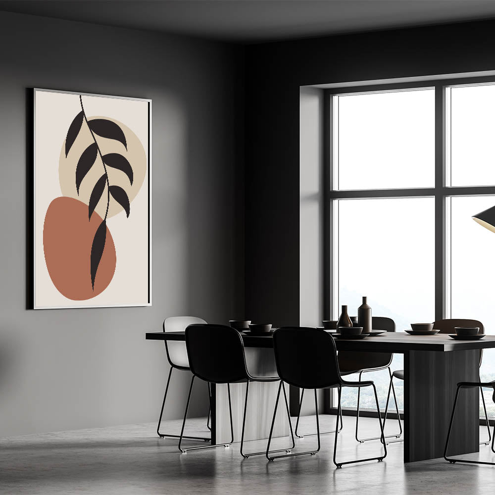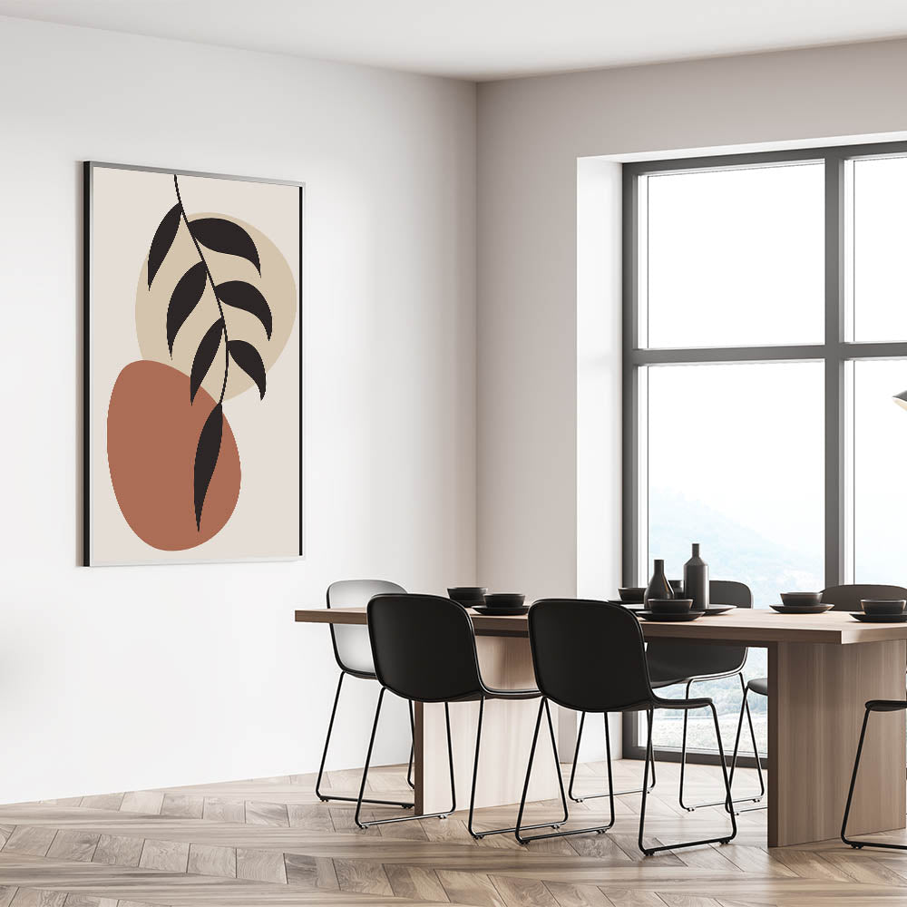 This minimalist boho leaf wall art brings together natural elements and abstract forms in a harmonious design. Featuring a bold black leaf silhouette set against soft beige and terracotta shapes, this artwork offers a modern, earthy aesthetic perfect for bohemian and eclectic interiors. The simple, organic design adds a touch of nature to your living space while maintaining a sleek and stylish look.