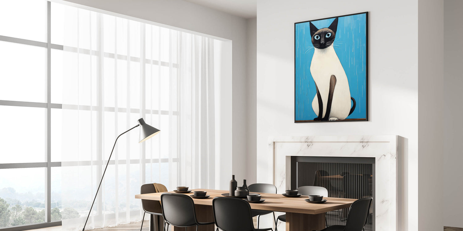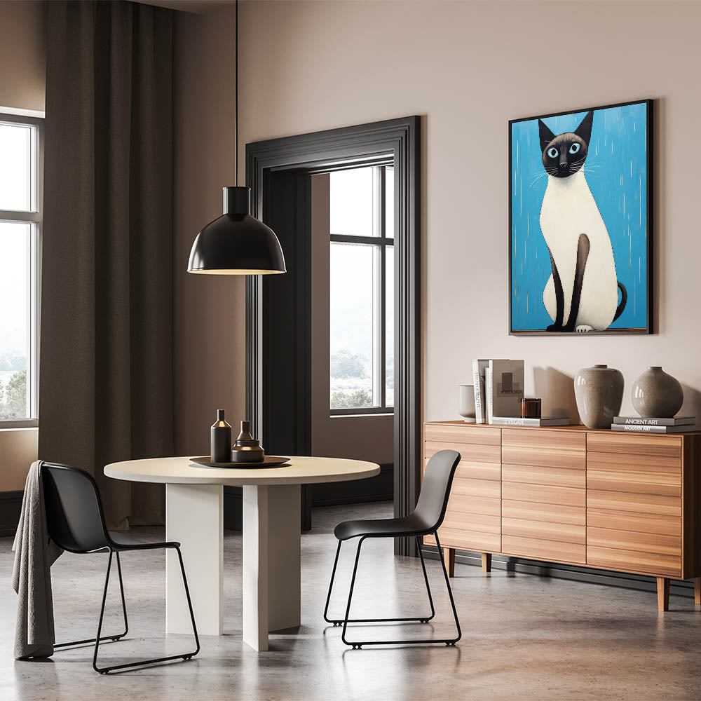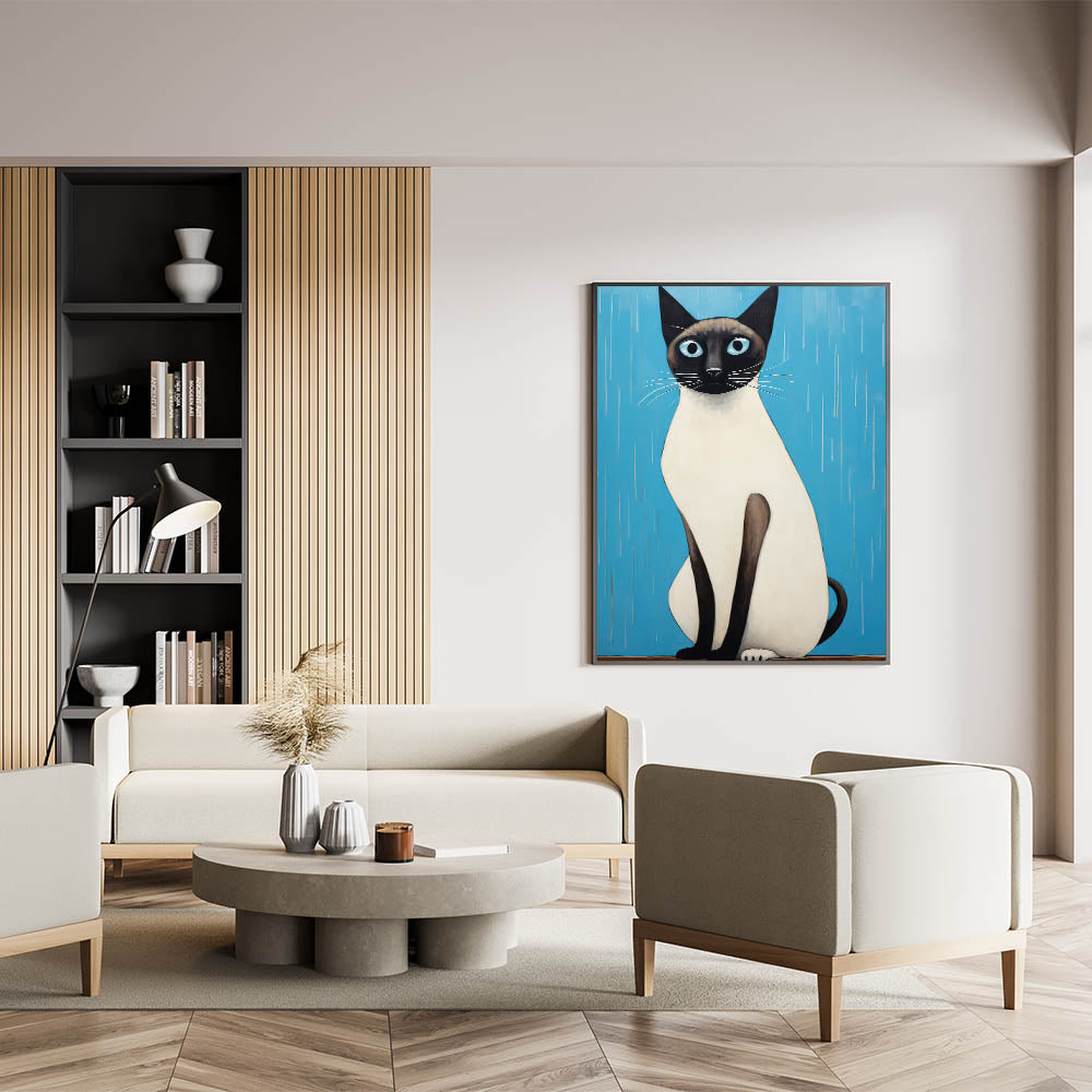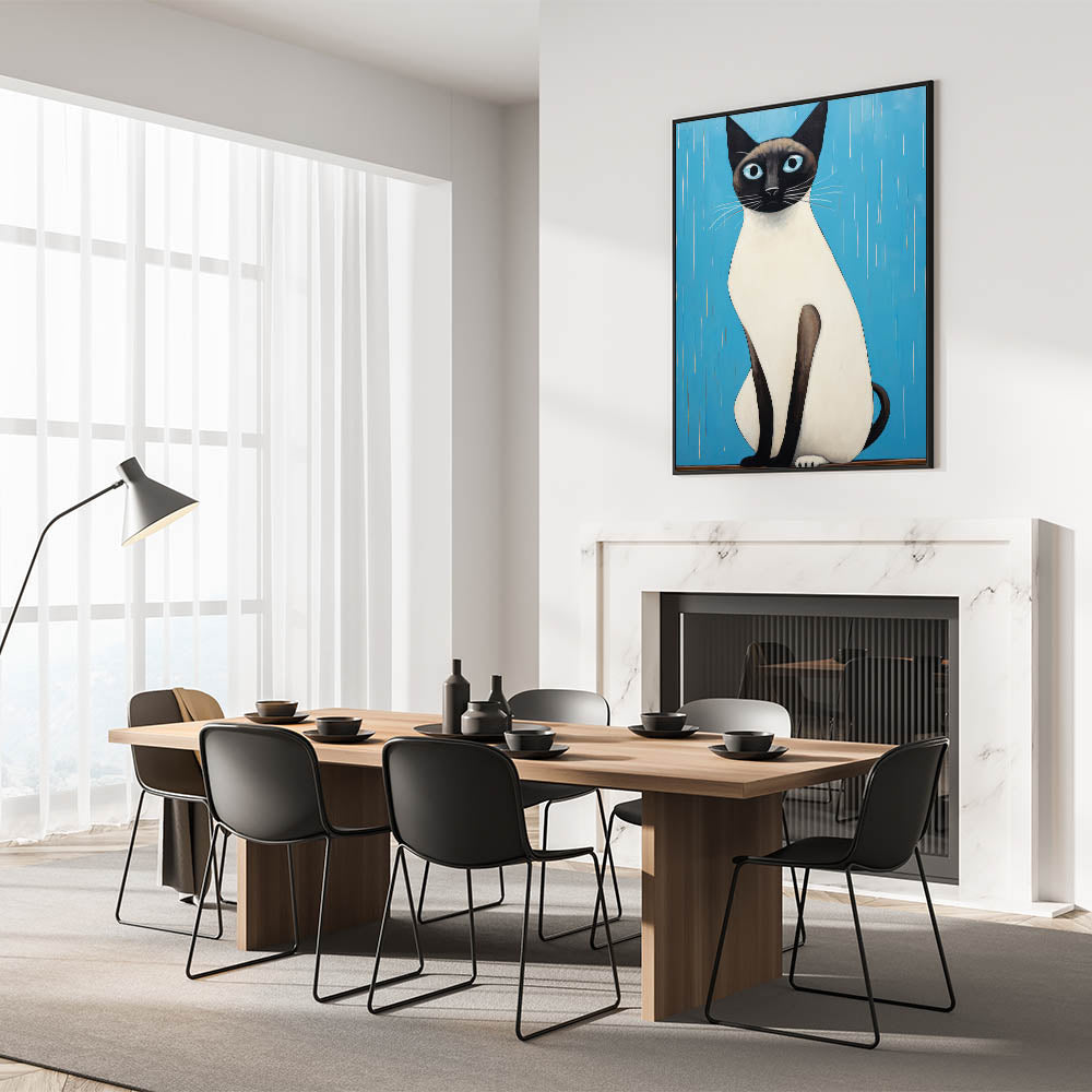 This modern electric art piece features a striking Siamese cat with captivating blue eyes against a bold blue backdrop. The cat's minimalistic and stylized form creates a playful yet sophisticated aesthetic, perfect for contemporary and eclectic interiors. The bright and dynamic blue background enhances the cat's expressive gaze, making this artwork an eye-catching focal point that brings character and charm to any space.