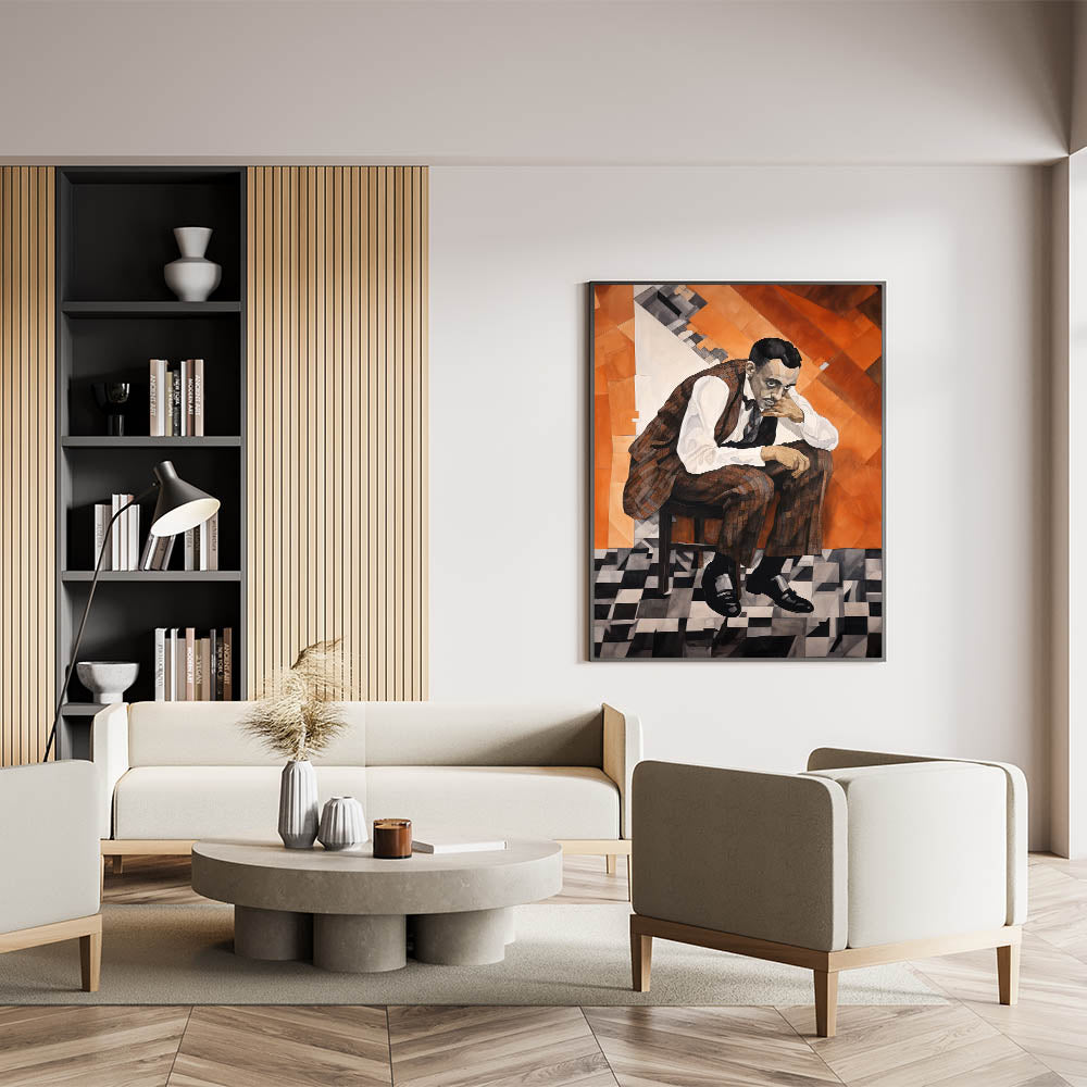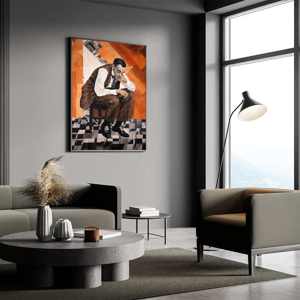 This modern cubist portrait art features an abstract interpretation of a seated figure, set against a backdrop of geometric shapes in warm, earthy tones. The intricate patterns and bold, angular forms create a sense of depth and intrigue, making this piece a captivating focal point for contemporary interiors. The vibrant orange hues, combined with subtle browns and grays, give the artwork a dynamic, electric feel that captures attention.