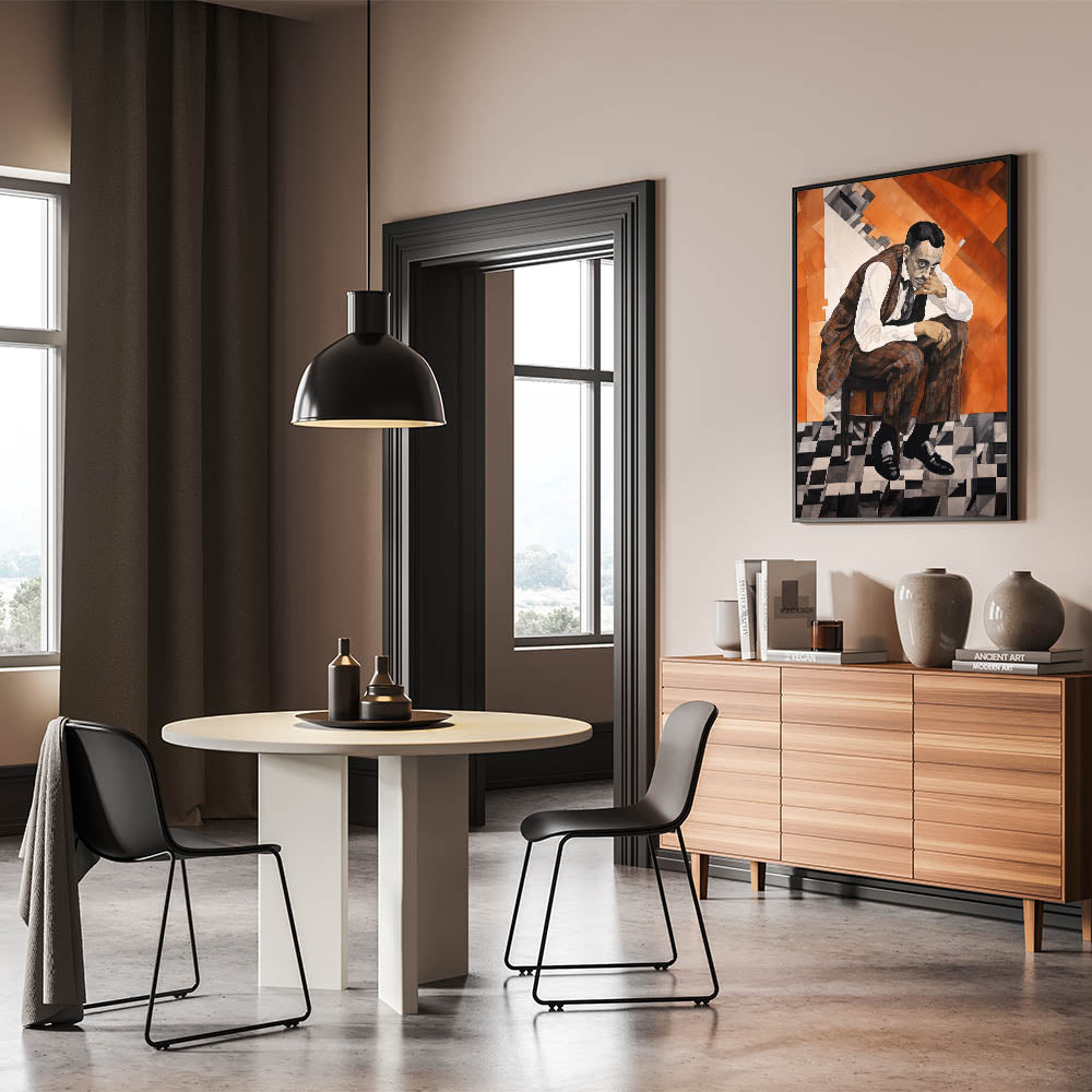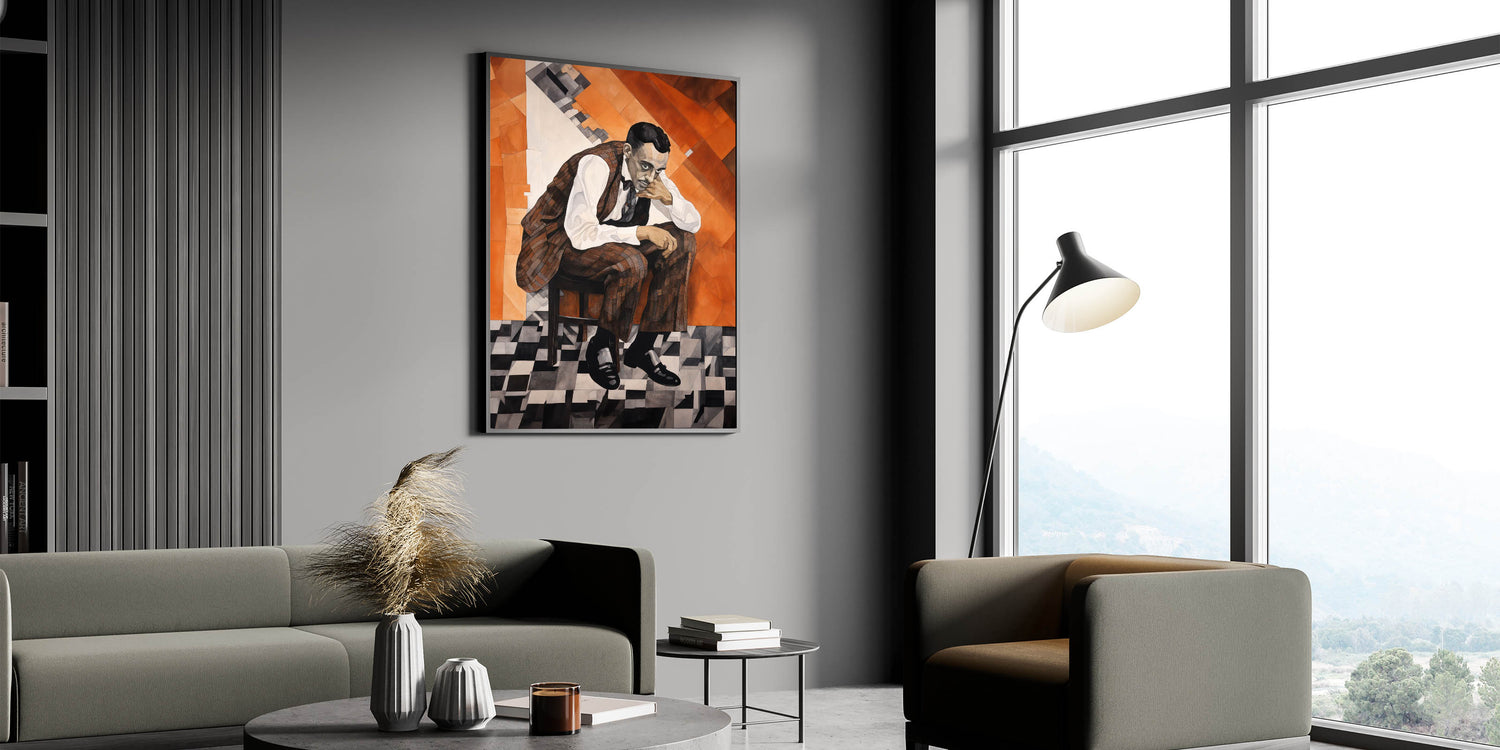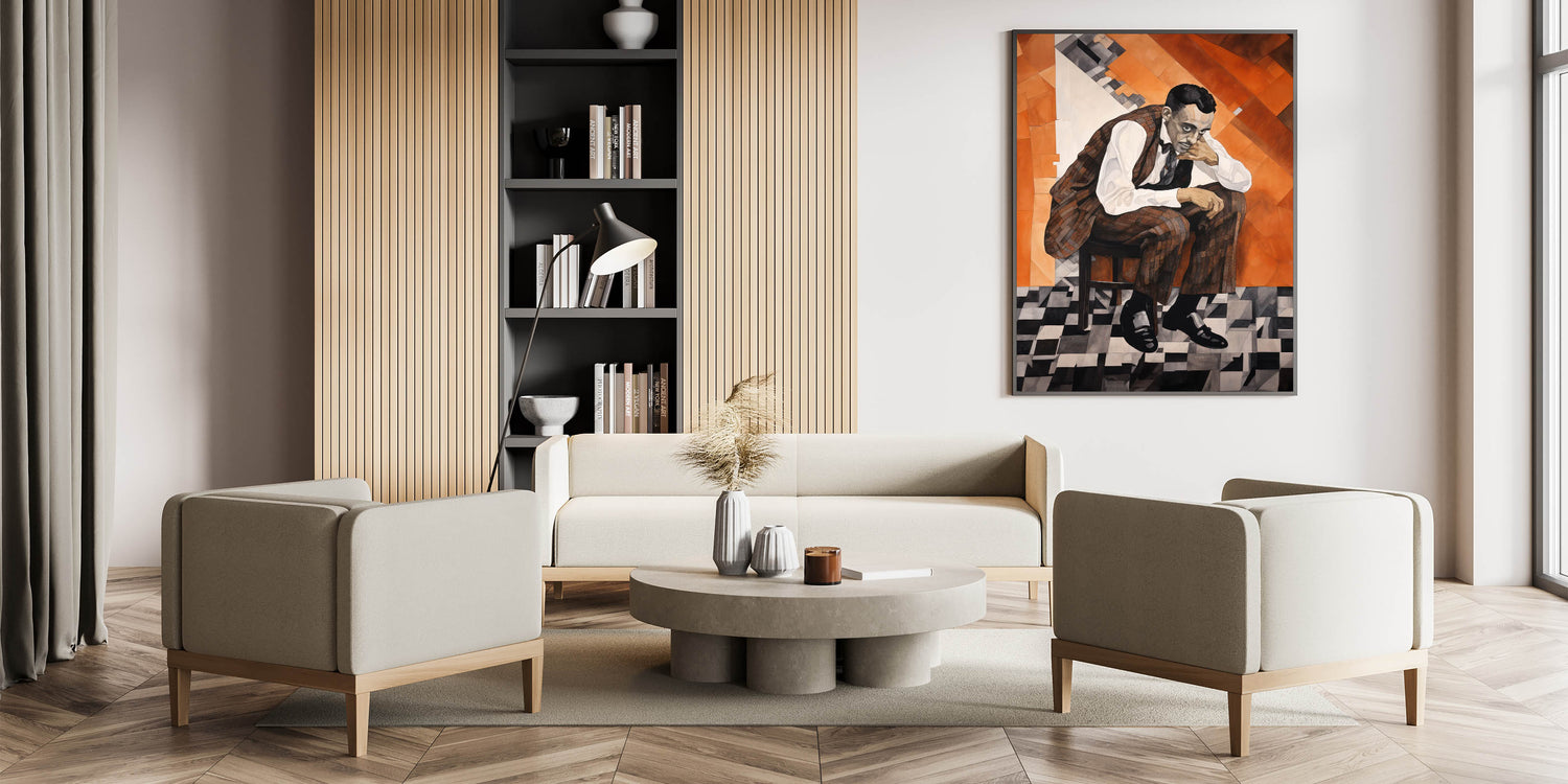 Add an artistic edge to your space with this cubist portrait that combines modern design with classic abstraction. Its warm palette and dynamic composition make it a standout addition to any modern setting.