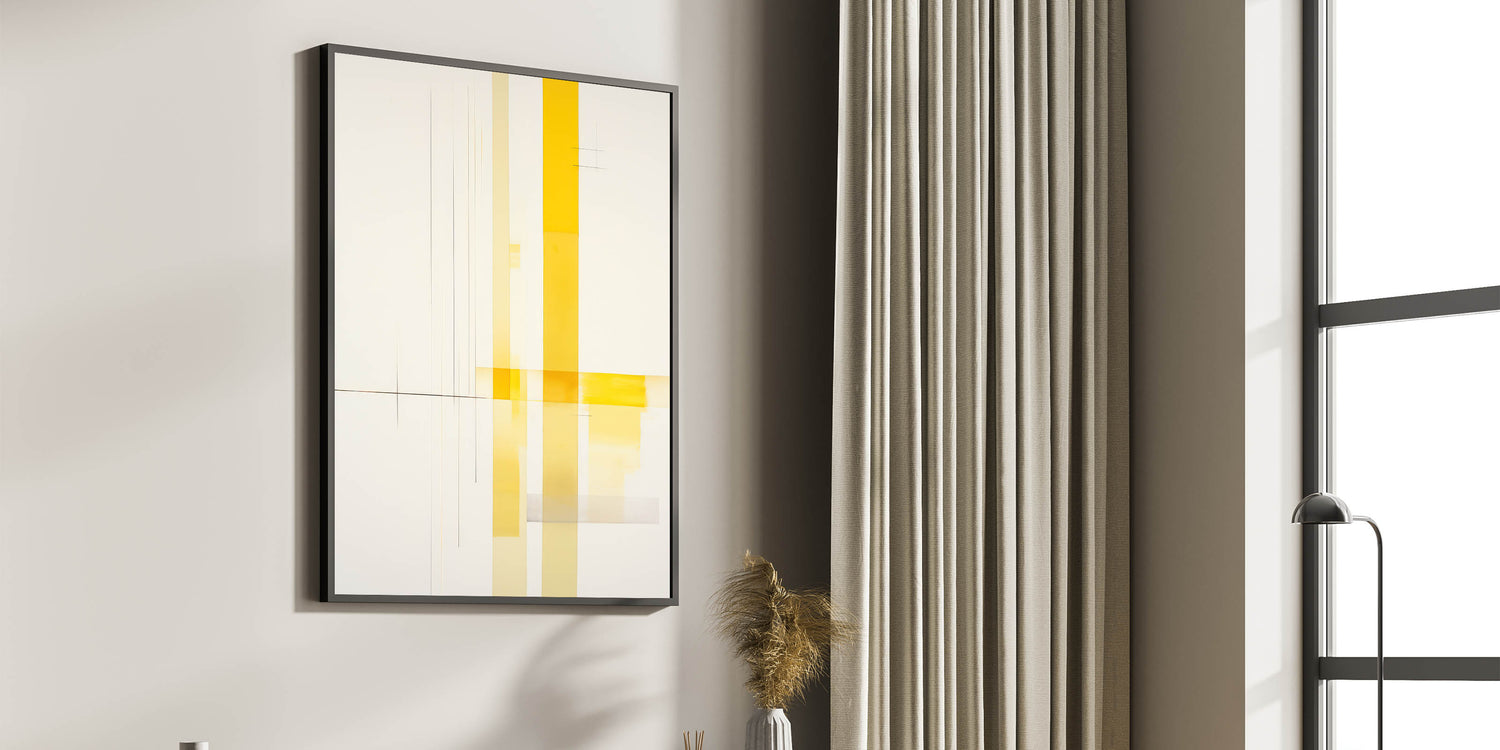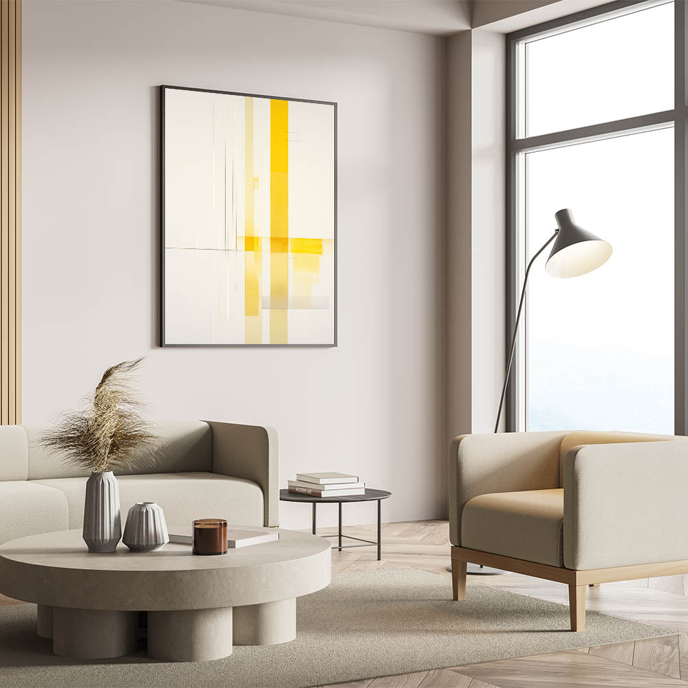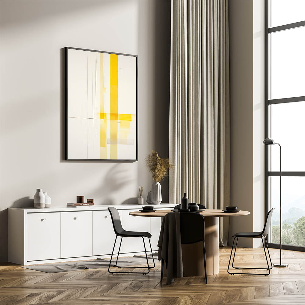 Add a bright and minimalist touch to your space with this Modern Electric Abstract Lines artwork. The piece showcases vertical and horizontal lines intersecting with bold yellow and soft beige hues, creating a simple yet captivating geometric composition. The subtle use of color against a light background evokes a sense of balance and harmony, making it a perfect addition to modern, Scandinavian, or minimalist interiors. The artwork's clean lines and structure provide a refined aesthetic that enhances the ambiance of any room, from offices to living spaces.