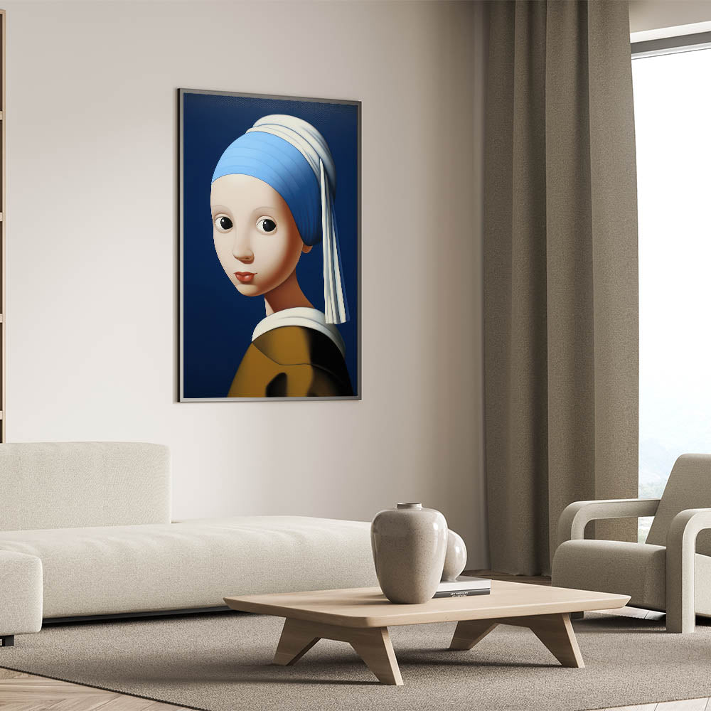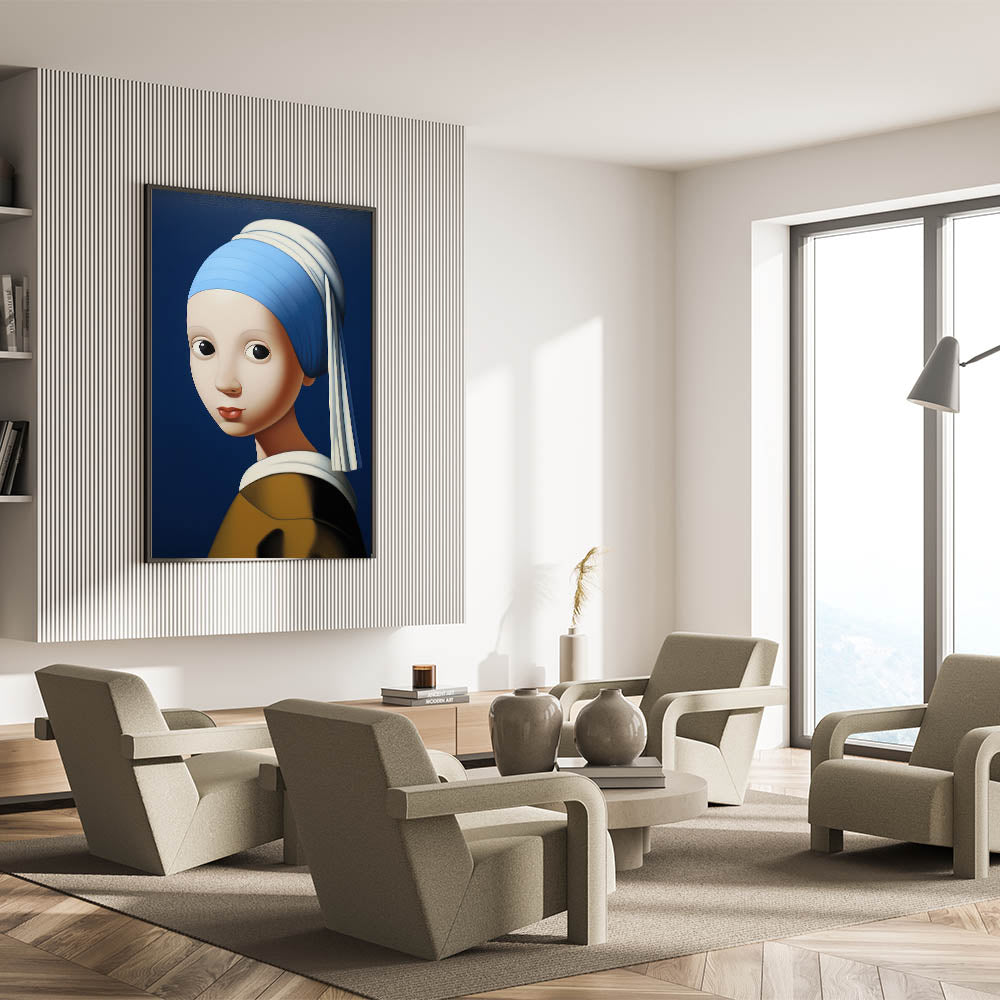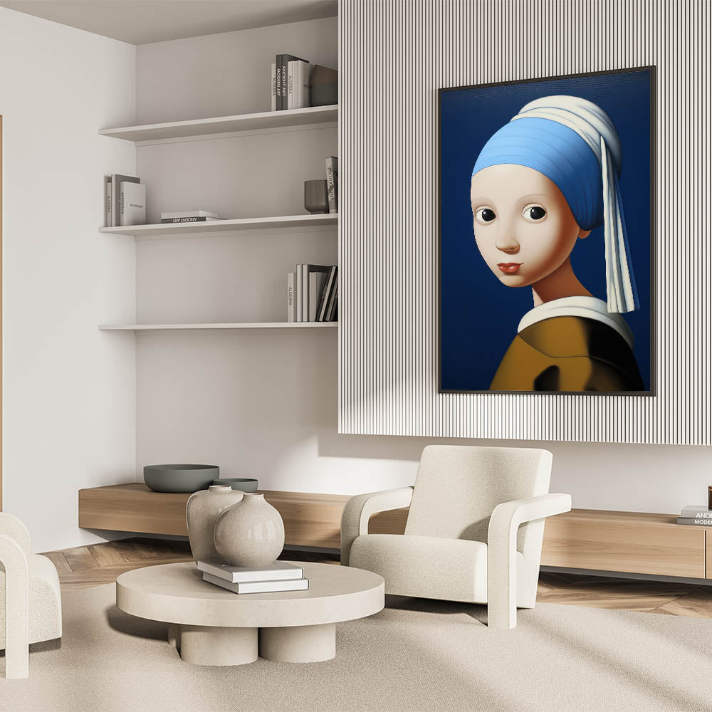 This modern electric portrait art offers an abstract interpretation of a classic masterpiece. The striking blue background contrasts with the soft skin tones and bold features, creating a captivating visual effect that merges tradition with a contemporary electric twist. The piece’s smooth, rounded forms and expressive eyes lend a playful and engaging vibe, making it a perfect centerpiece for eclectic and modern interiors.