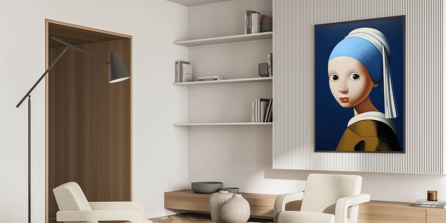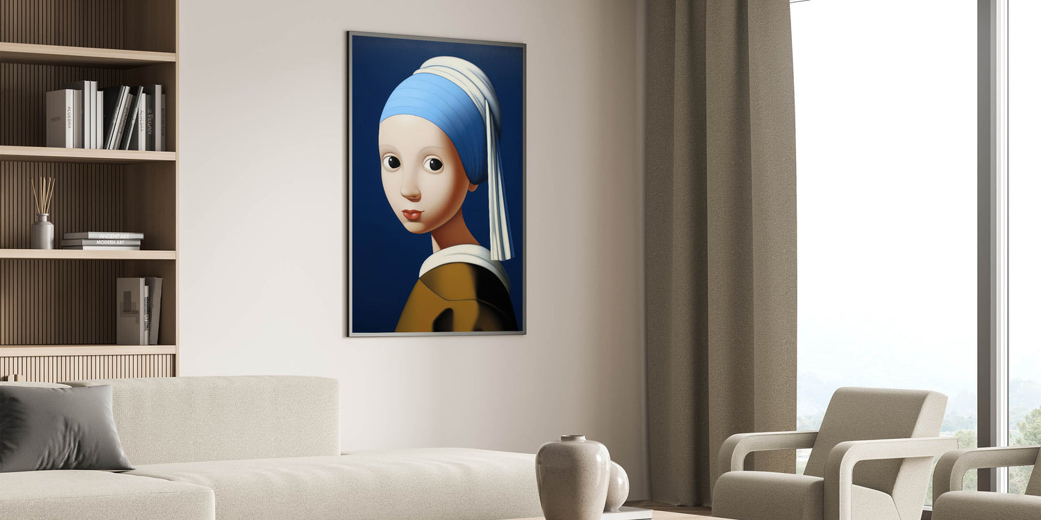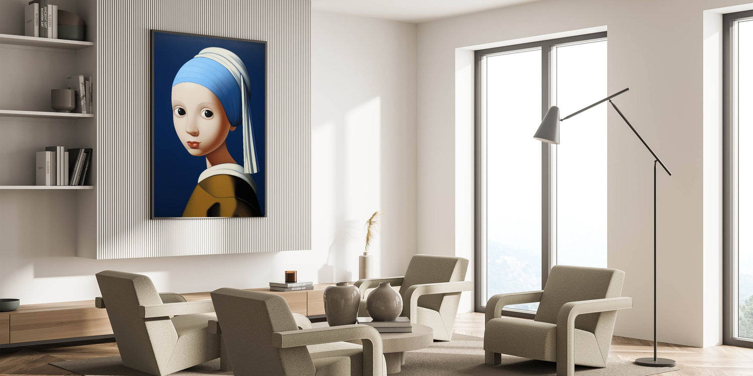 This modern electric portrait art offers an abstract interpretation of a classic masterpiece. The striking blue background contrasts with the soft skin tones and bold features, creating a captivating visual effect that merges tradition with a contemporary electric twist. The piece’s smooth, rounded forms and expressive eyes lend a playful and engaging vibe, making it a perfect centerpiece for eclectic and modern interiors.