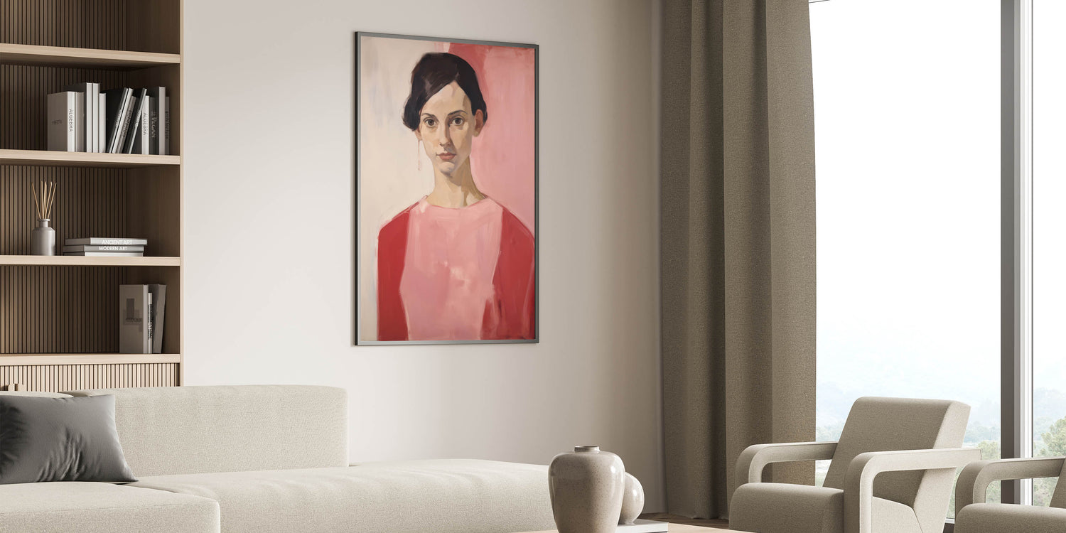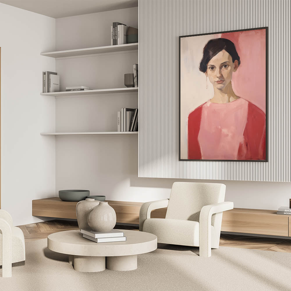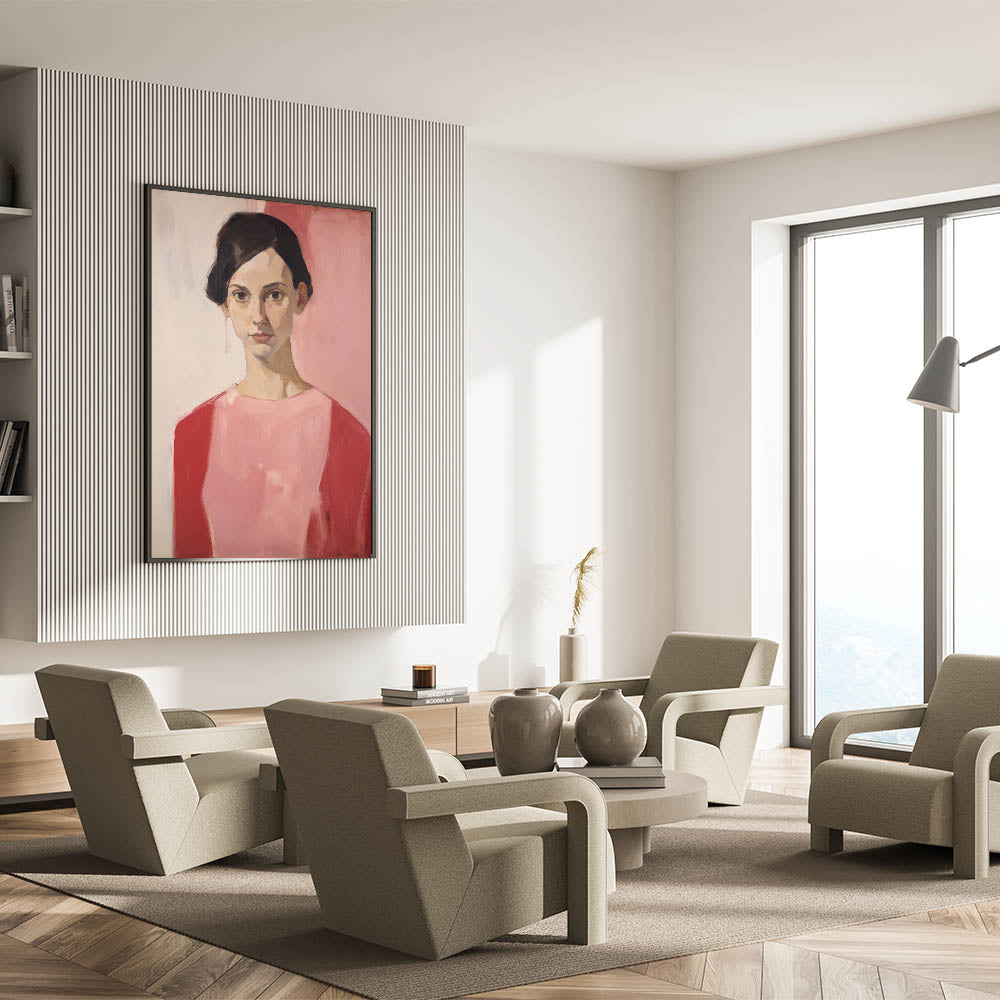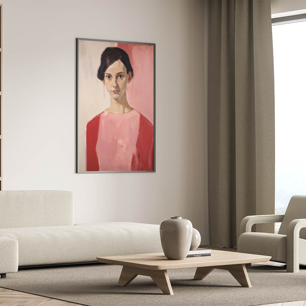 The "Modern Electric Portrait Canvas" showcases an elegant and contemporary portrait of a woman, depicted in soft and warm pink tones. The electric-themed artwork combines a minimalist aesthetic with expressive brushstrokes, bringing a sense of modern sophistication to any space. Ideal for contemporary and chic interiors, this canvas print serves as a refined focal point for living rooms, bedrooms, or home offices.