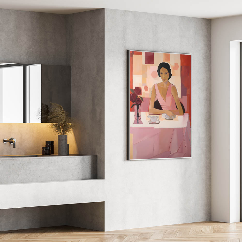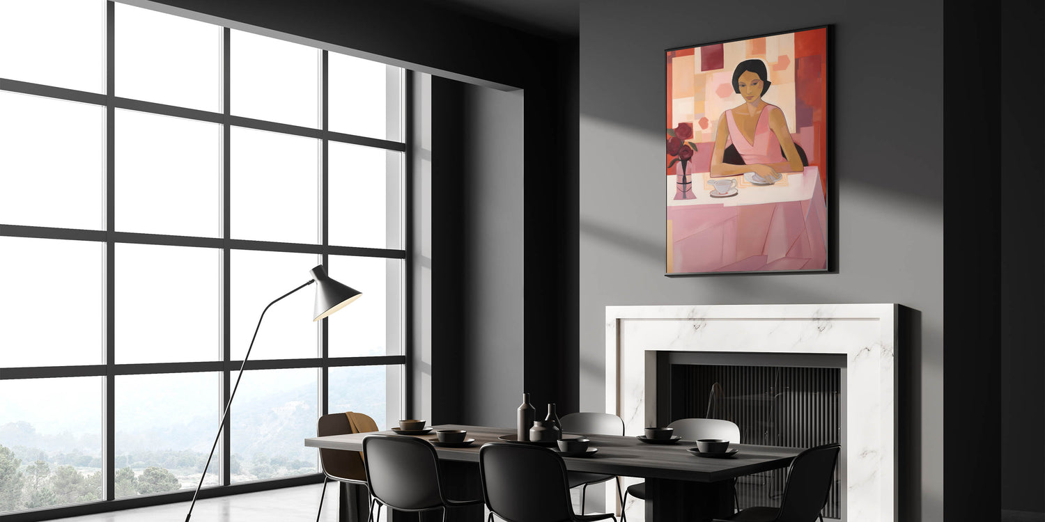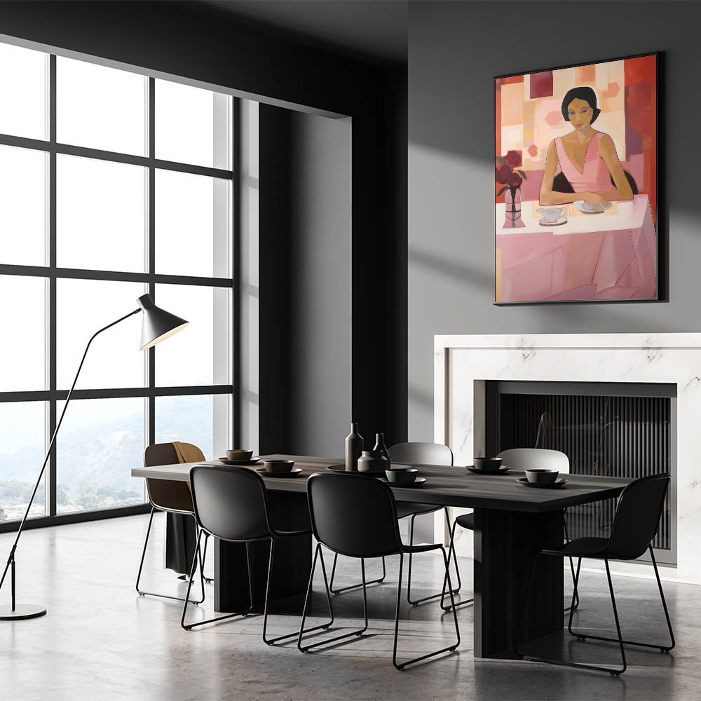 The "Modern Electric Portrait Canvas" offers a captivating view into an intimate dining scene, blending bold geometric forms and vibrant electric colors. This electric wall art piece showcases a woman seated at a table, with soft pinks, reds, and oranges creating a warm and lively atmosphere. Perfect for contemporary and eclectic interiors, this abstract electric painting adds an artistic and sophisticated touch to any space.
