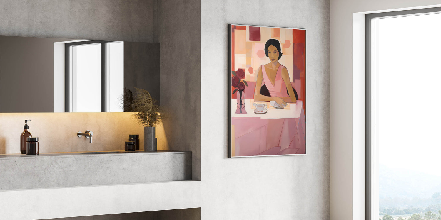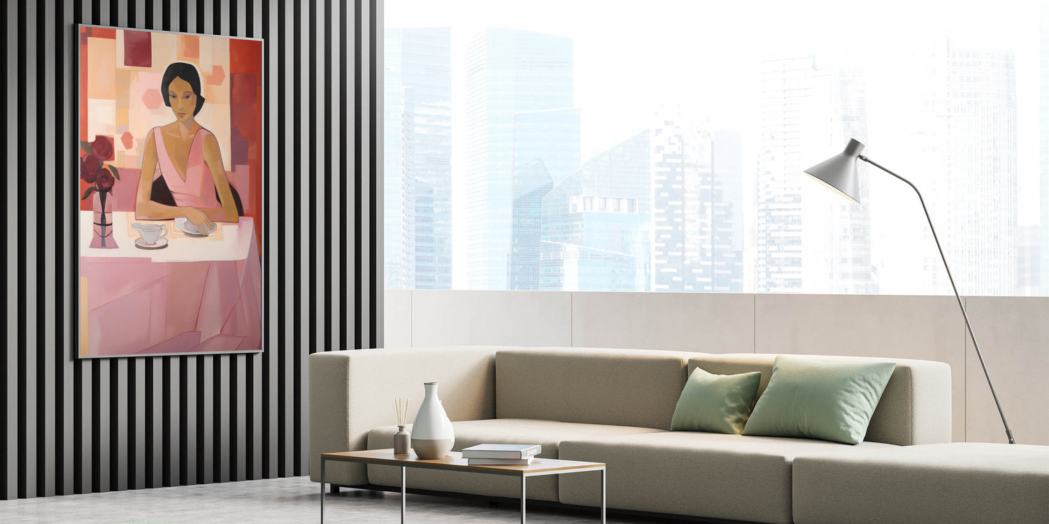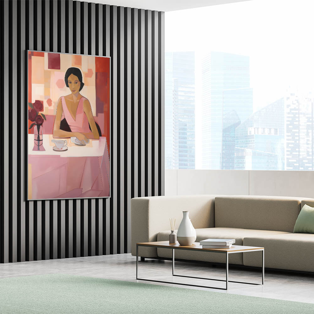 The "Modern Electric Portrait Canvas" offers a captivating view into an intimate dining scene, blending bold geometric forms and vibrant electric colors. This electric wall art piece showcases a woman seated at a table, with soft pinks, reds, and oranges creating a warm and lively atmosphere. Perfect for contemporary and eclectic interiors, this abstract electric painting adds an artistic and sophisticated touch to any space.