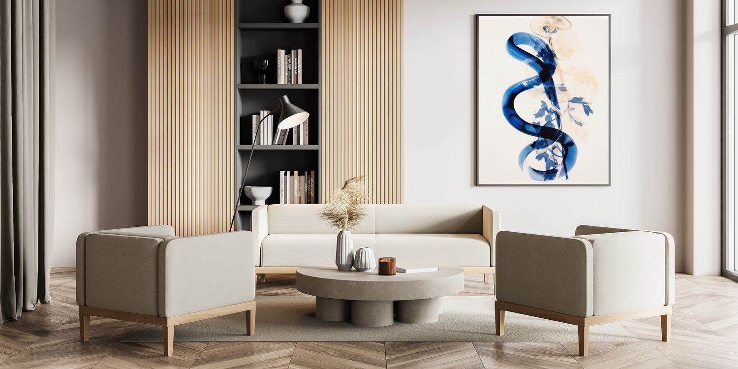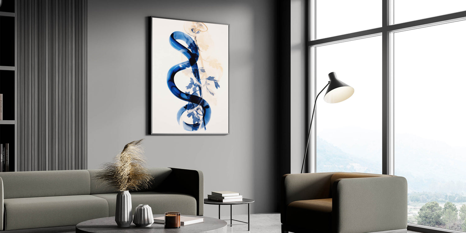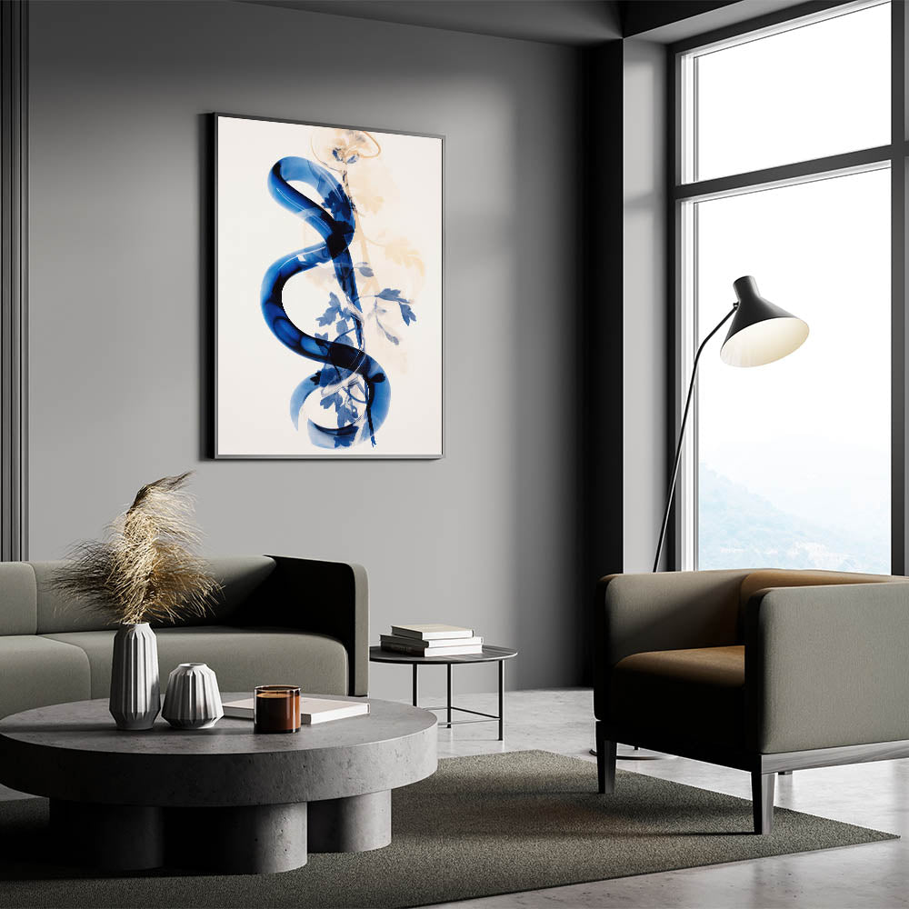 Elevate your interior with this stunning electric wall art, featuring a fluid blue abstract design intertwined with delicate floral elements. The combination of dynamic shapes and soft botanical details creates a visually striking contrast, perfect for modern spaces seeking a touch of vibrant electric decor. The graceful movement and interplay of shades provide a sense of depth, making this eye-catching electric design a beautiful focal point for any room.