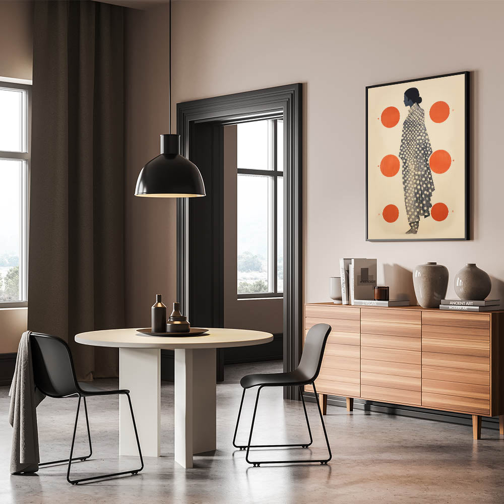 Elevate your space with this modern electric wall art, featuring an abstract silhouette adorned with dynamic polka dot patterns and striking orange accents. This unique piece blends contemporary design elements with electric vibrancy, creating a visual focal point that commands attention. The deep navy silhouette contrasts beautifully against the bold orange circles, making it an ideal addition to minimalist, modern, or eclectic interiors.