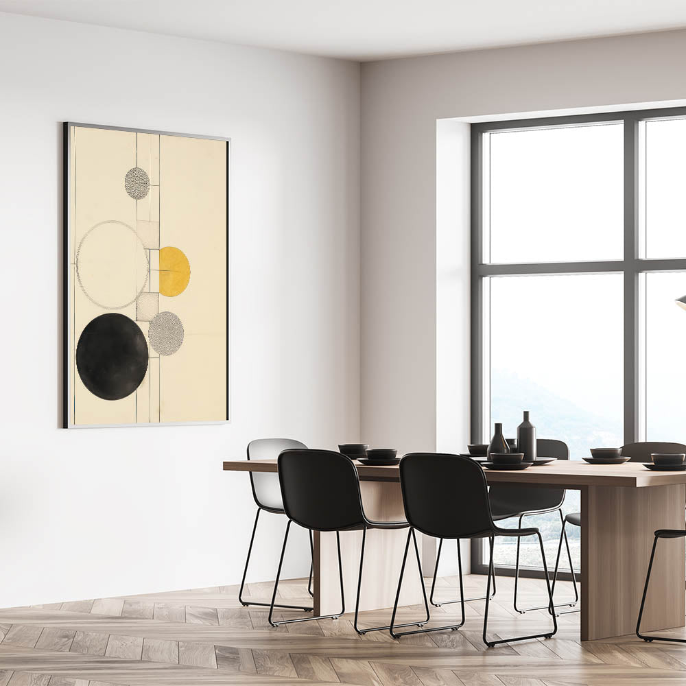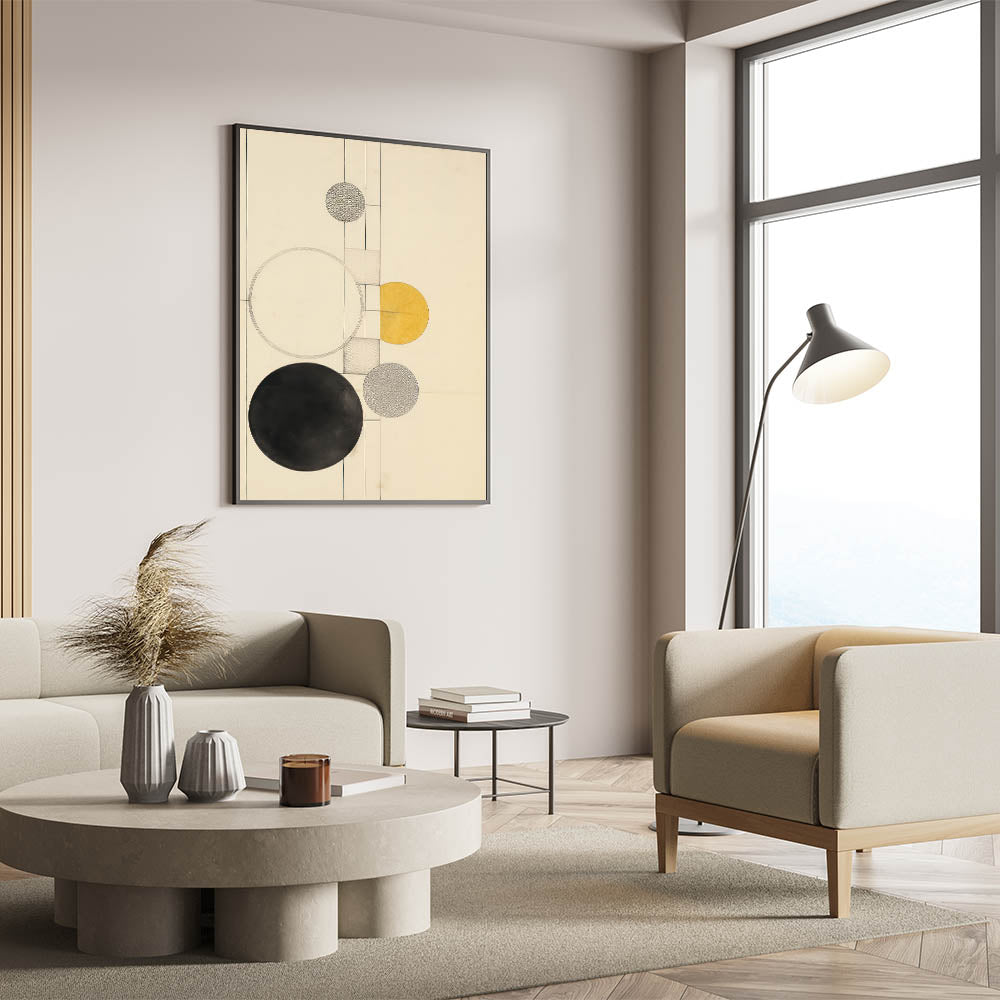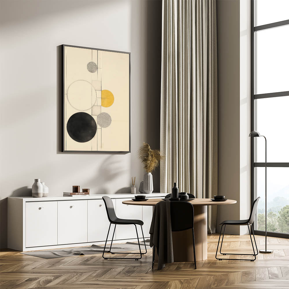 Embrace the elegance of modern minimalism with this geometric electric wall art, featuring a harmonious composition of circles, lines, and shapes. The artwork’s balanced arrangement of black, gray, and golden circles offers a sophisticated visual effect that captures the essence of contemporary design. Its clean lines and subtle contrast make it an ideal choice for modern, minimalist, or industrial-inspired interiors.