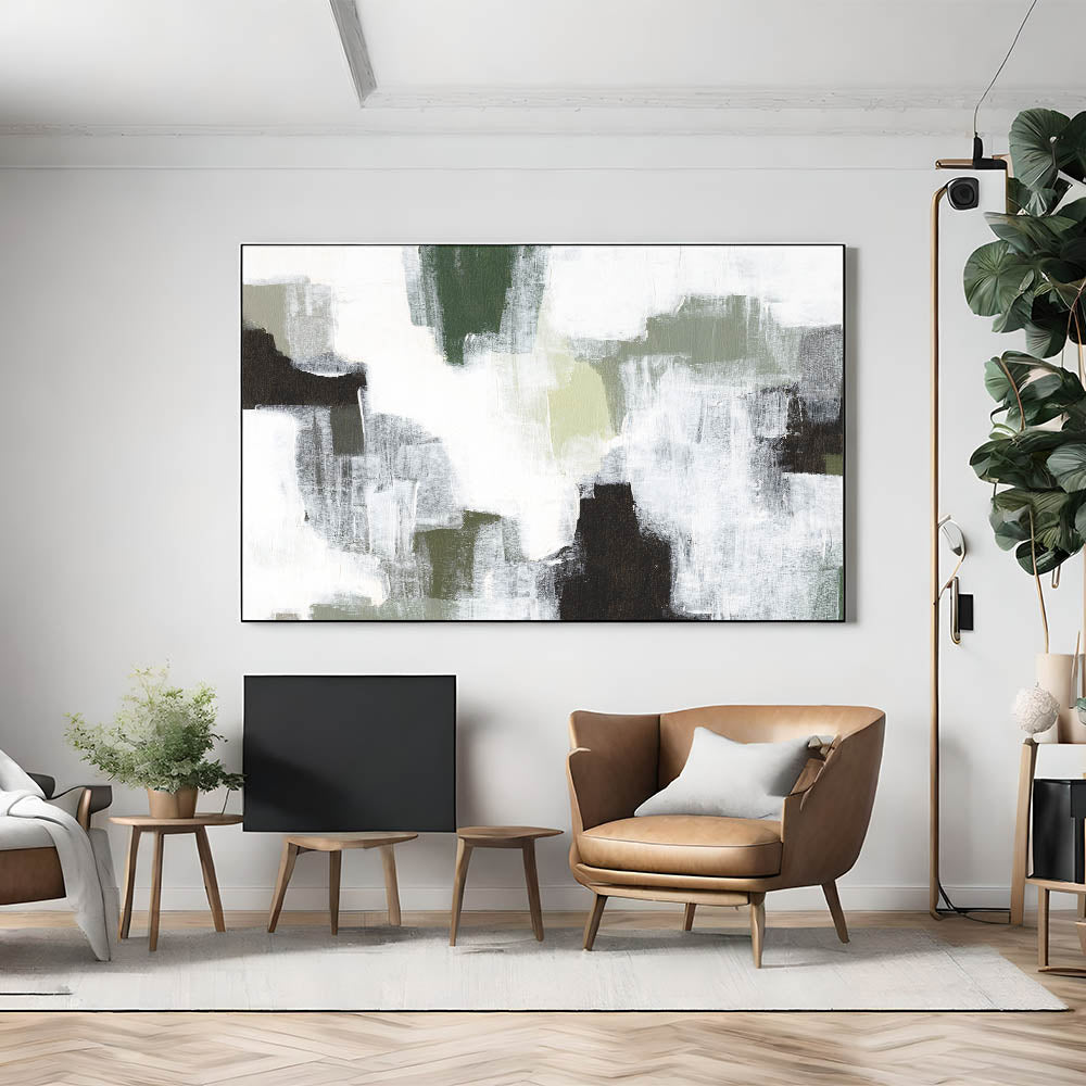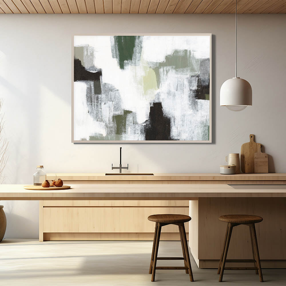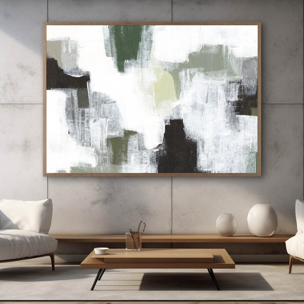 Elevate your interior decor with this elegant piece of modern minimalist art, showcasing a refined blend of green, gray, and white tones. The abstract geometric patterns create a captivating visual texture, offering a sophisticated yet understated aesthetic that fits seamlessly into any contemporary space. This artwork is perfect for those who appreciate the subtle beauty of minimalist design combined with a touch of natural elegance.