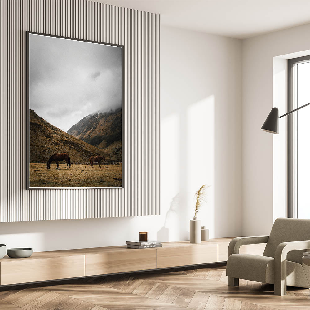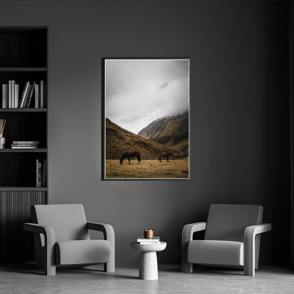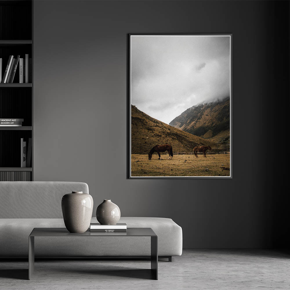 Captivate your space with the tranquil beauty of our "Mountain Grazing Horses" art print. This piece features a pair of horses peacefully grazing in a vast mountain valley, enveloped by misty clouds and towering peaks. The natural earth tones and the grandeur of the landscape evoke a sense of calm and freedom that is both rare and enchanting.
