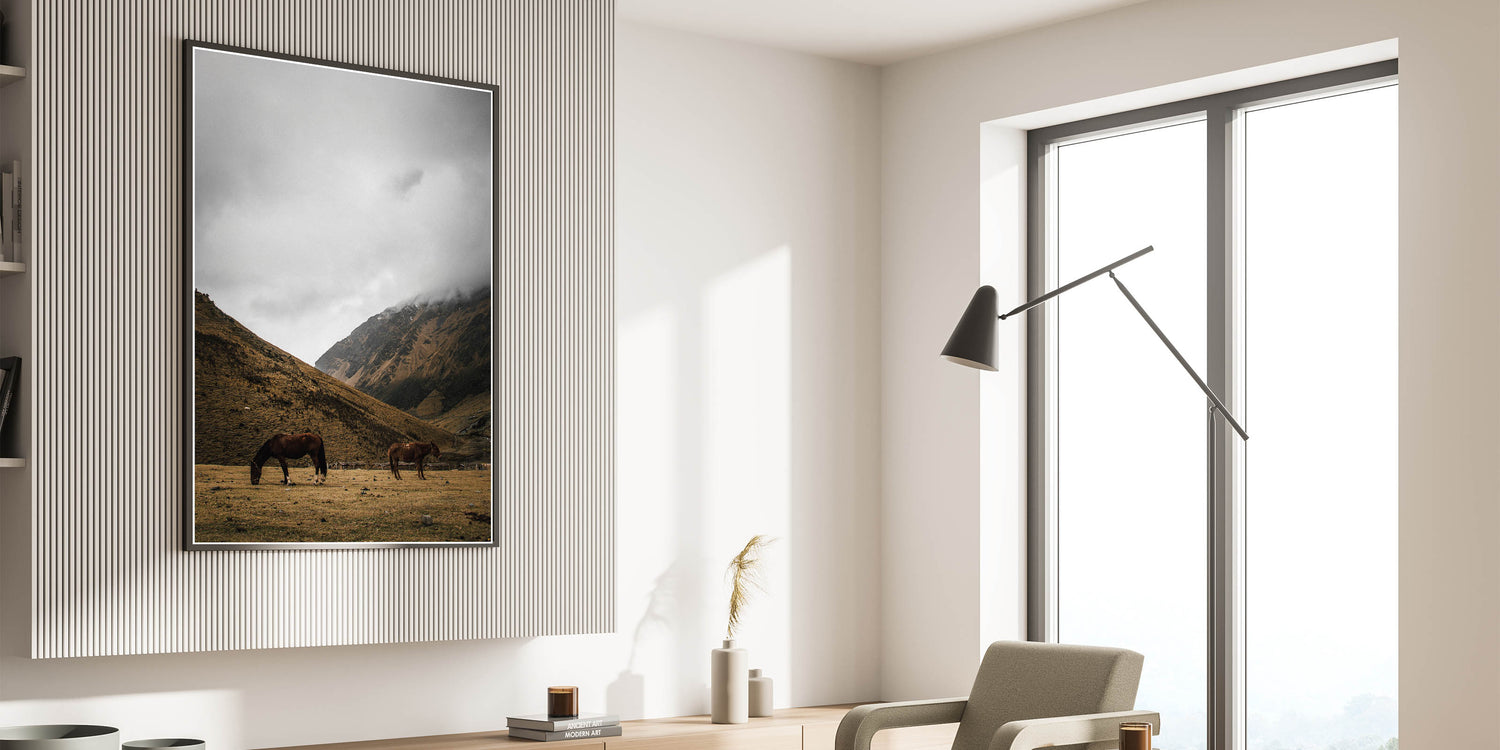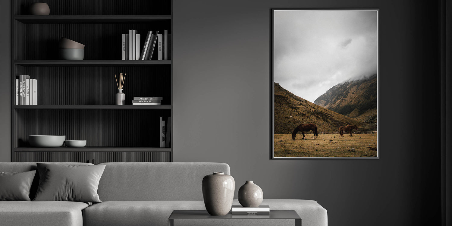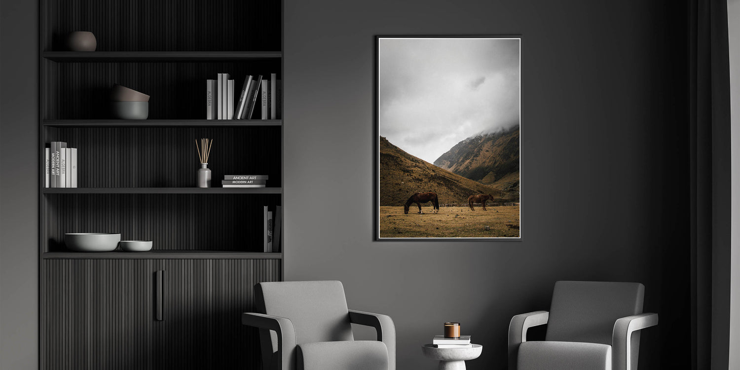 Captivate your space with the tranquil beauty of our "Mountain Grazing Horses" art print. This piece features a pair of horses peacefully grazing in a vast mountain valley, enveloped by misty clouds and towering peaks. The natural earth tones and the grandeur of the landscape evoke a sense of calm and freedom that is both rare and enchanting.