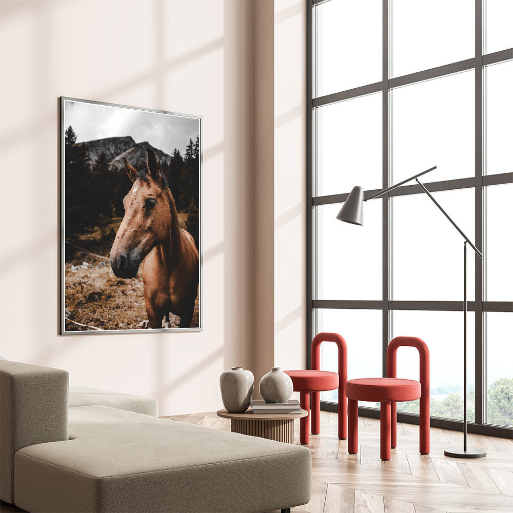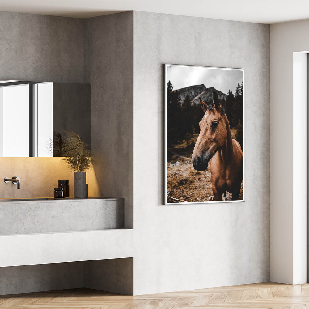 Discover the serene beauty of nature and the noble spirit of the horse with our "Mountain Majesty - Rustic Horse Portrait Art Print." This stunning piece captures a close-up view of a horse against the rugged backdrop of mountainous terrain, reflecting the untamed spirit and grace of this majestic creature.