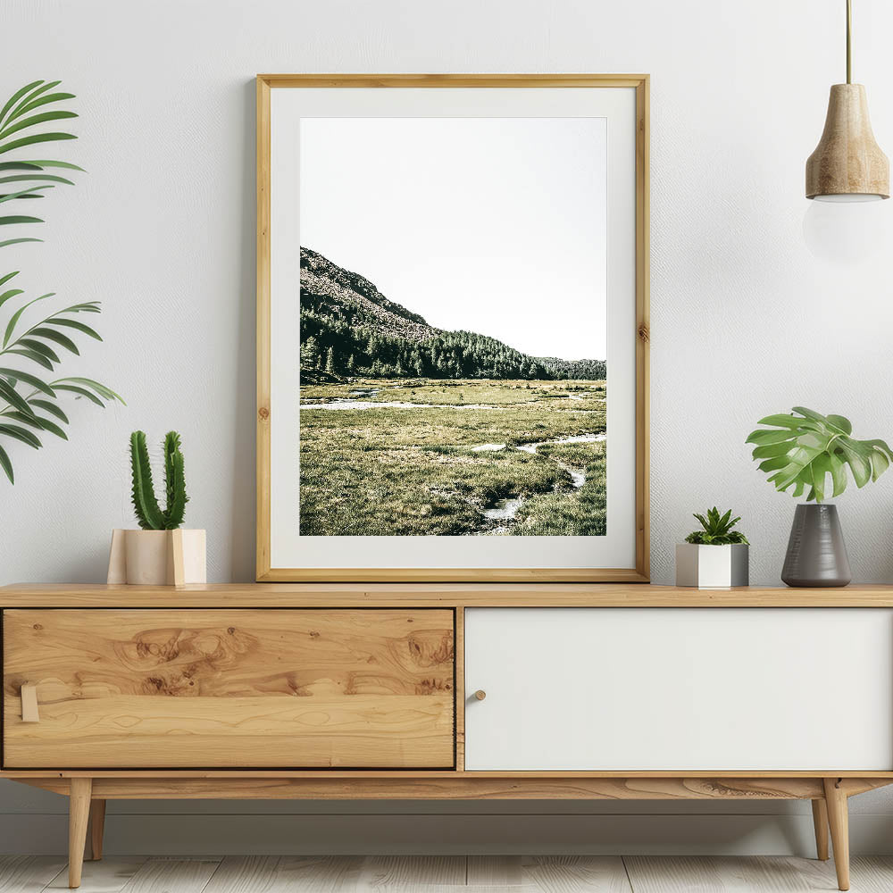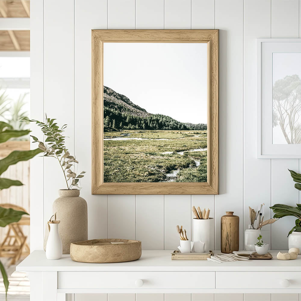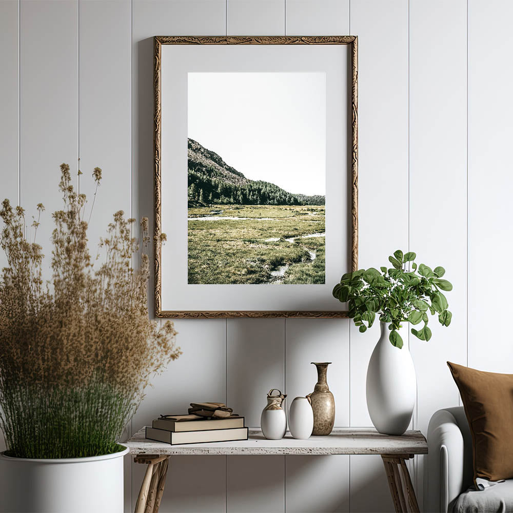 Bring the serenity of the great outdoors into your home with this captivating mountain valley wall art. This artwork features a stunning view of a lush, green valley framed by towering mountains and dense forests. The natural beauty of the landscape, with its calming greens and earthy tones, creates a peaceful atmosphere, making this piece an ideal addition to any farmhouse or country-style decor. Perfect for living rooms, bedrooms, or nature-themed spaces, this print captures the essence of the wilderness and invites tranquility into your home.