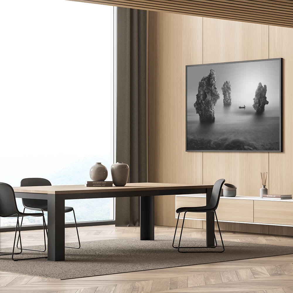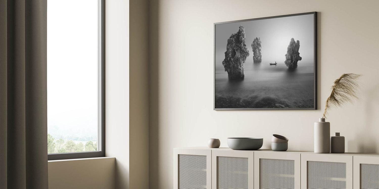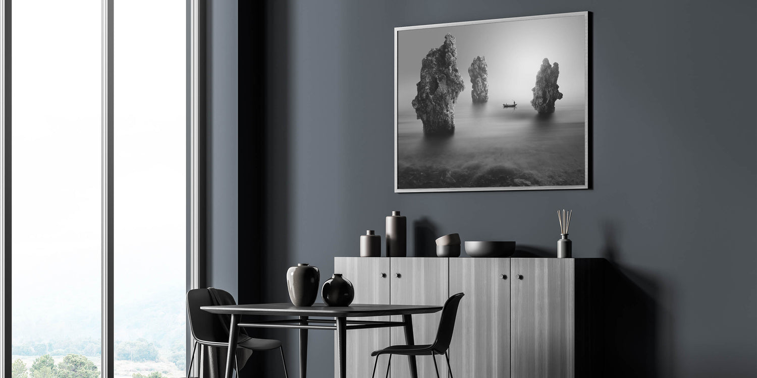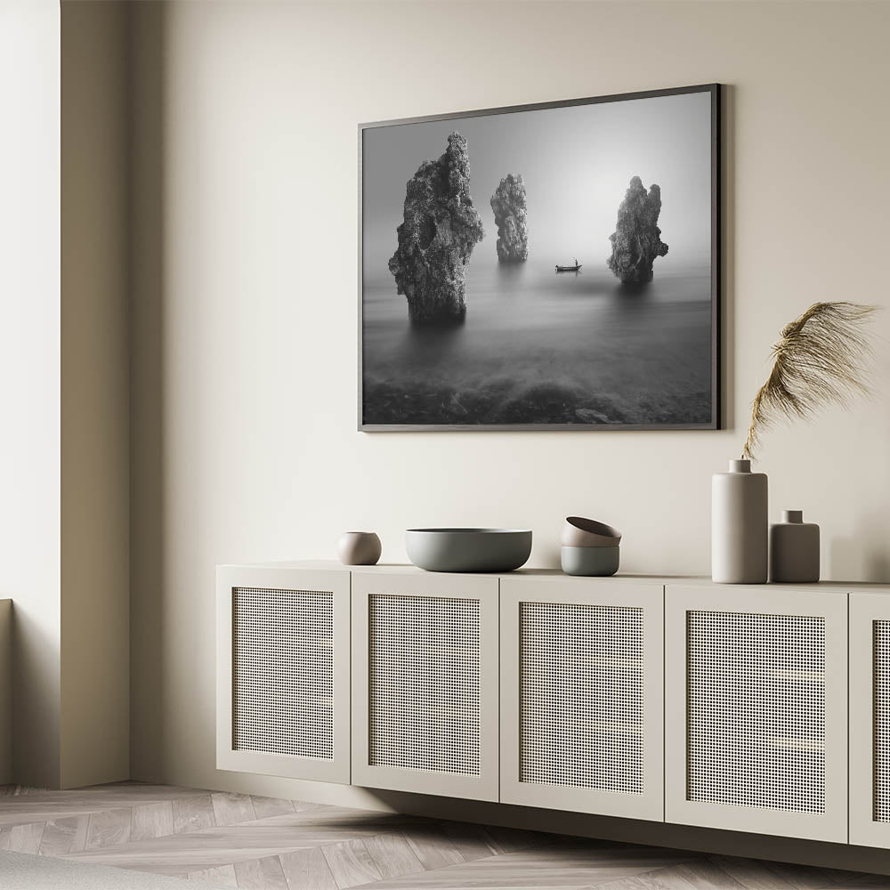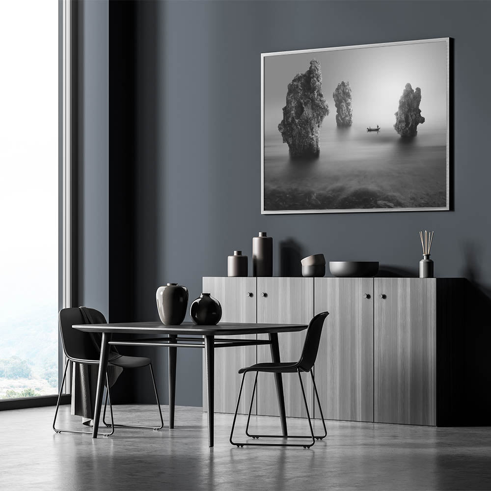 Immerse yourself in the tranquil beauty of this fine art photography framed print. This black-and-white seascape features towering rock formations rising from misty waters, with a lone fisherman navigating his small boat. The long-exposure effect creates a dreamlike, ethereal atmosphere, making this an elegant and thought-provoking addition to any modern space.