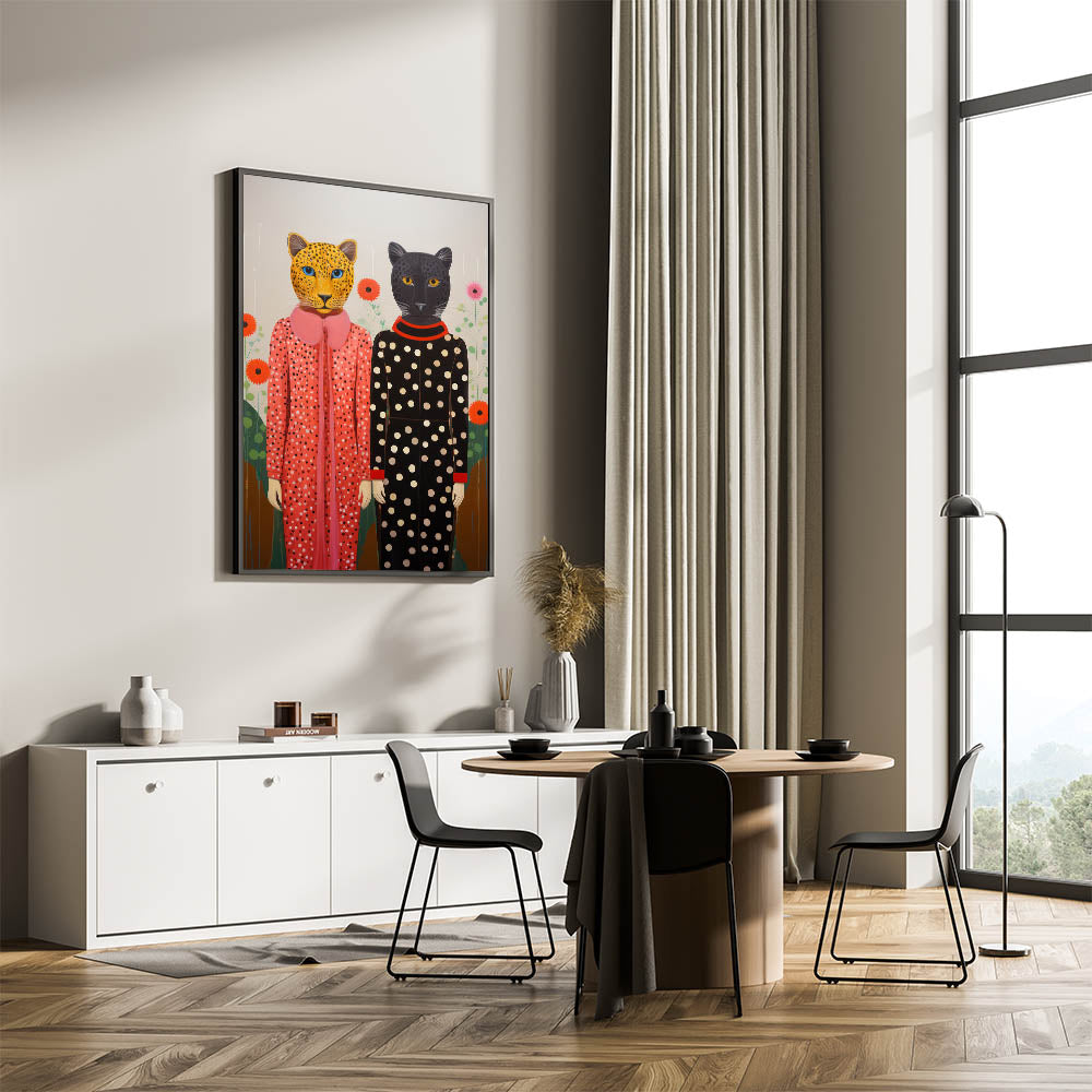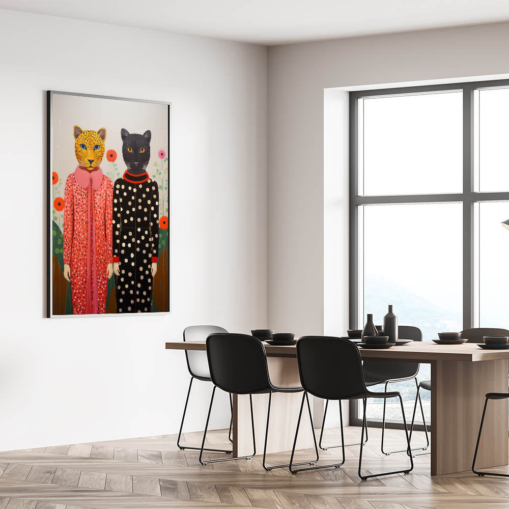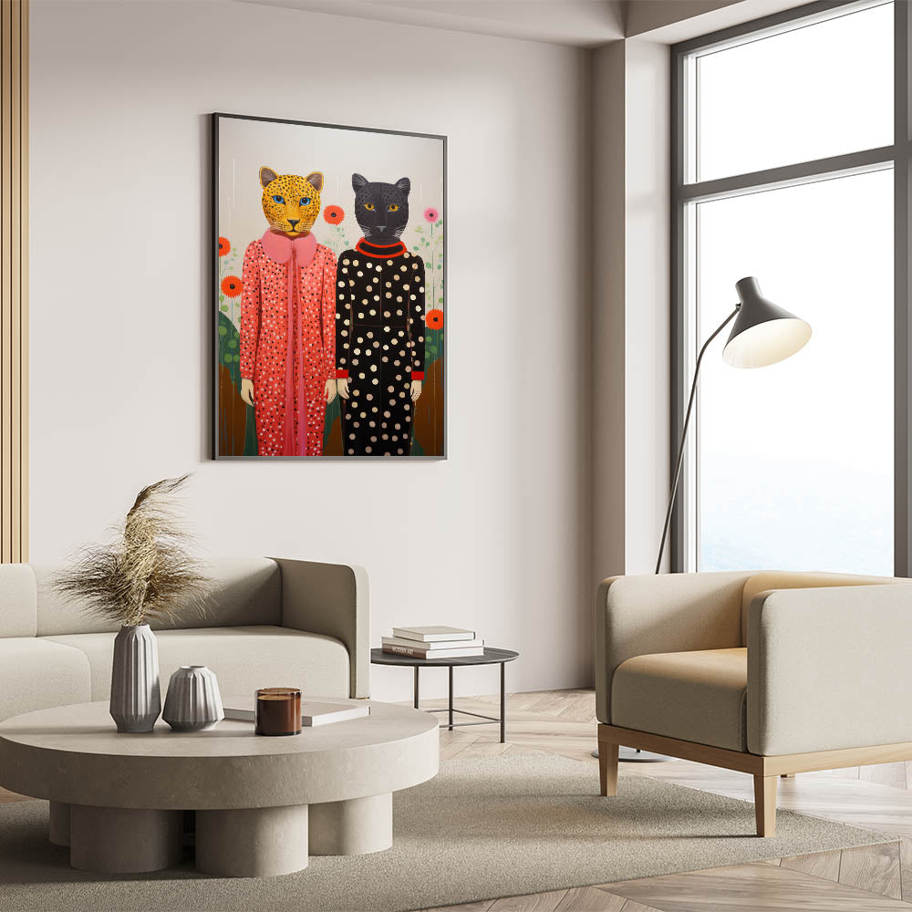 Infuse your space with charm and energy through this playful electric wall art, featuring two leopards dressed in stylish, polka-dot attire. The vibrant yellow and black leopards stand out against a lush floral background, creating a captivating blend of nature and fashion. This bold artwork brings a touch of whimsy and modern elegance to any room, making it perfect for eclectic and contemporary interiors.