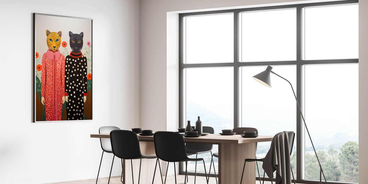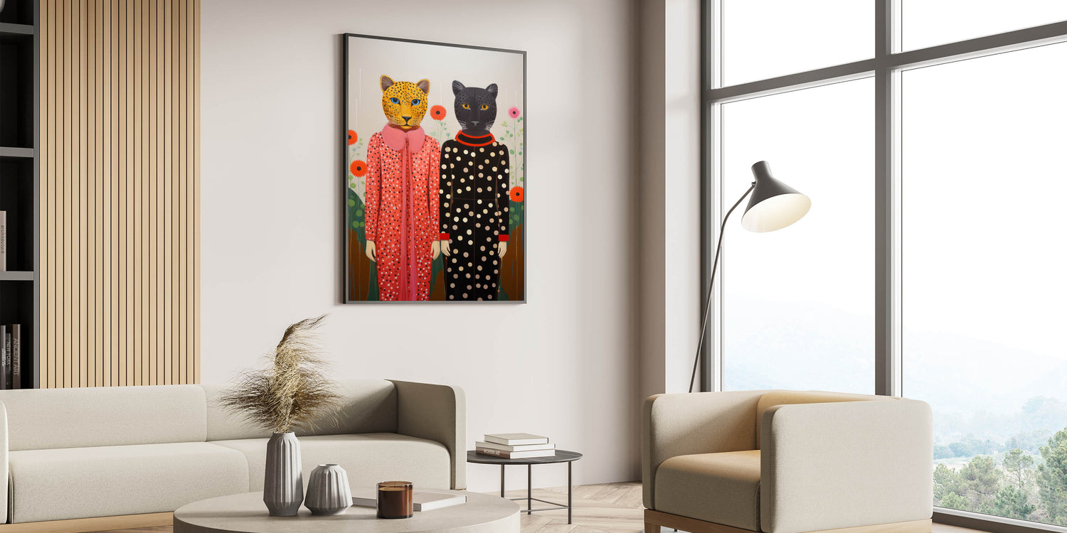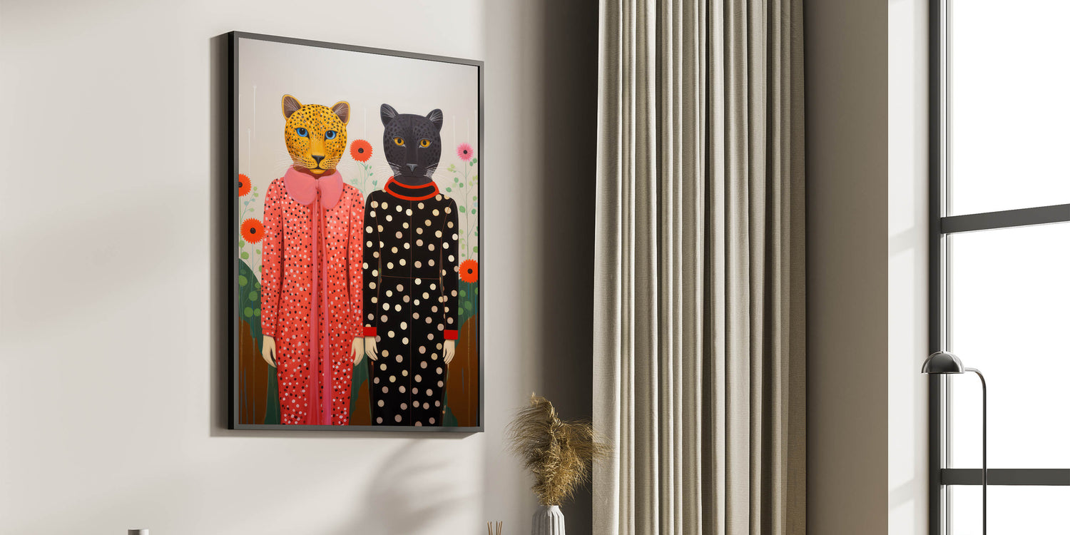 Infuse your space with charm and energy through this playful electric wall art, featuring two leopards dressed in stylish, polka-dot attire. The vibrant yellow and black leopards stand out against a lush floral background, creating a captivating blend of nature and fashion. This bold artwork brings a touch of whimsy and modern elegance to any room, making it perfect for eclectic and contemporary interiors.