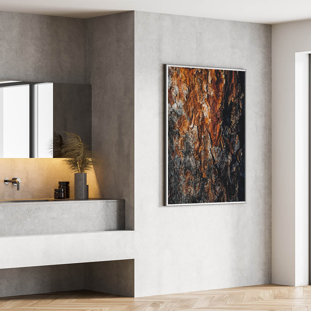Our "Rugged Bark Texture Art" presents an exquisite close-up view of tree bark, capturing the raw and untamed essence of nature. This print brings an intense and rustic feel to any room, highlighting the deep cracks and vibrant color play of natural wood.