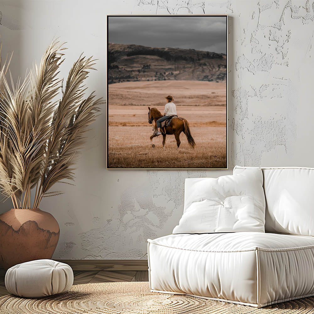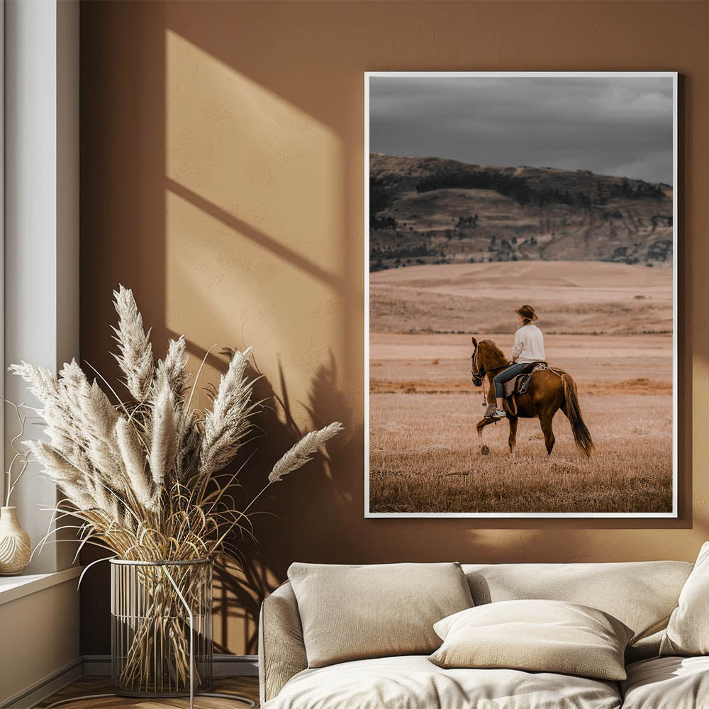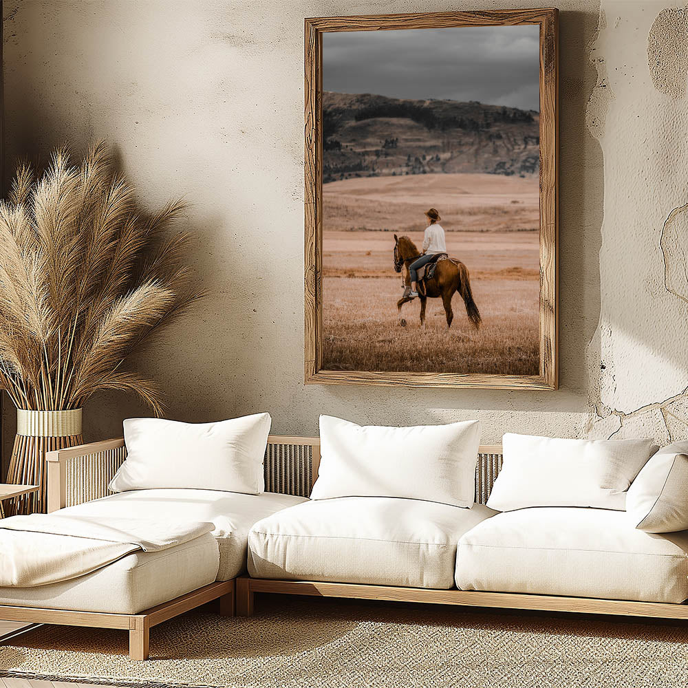 Capture the spirit of the countryside with this evocative horseback riding wall art. This rustic artwork portrays a serene cowboy scene, where the rider takes in the sweeping, golden plains of the countryside. The warm, earthy tones evoke the feeling of simplicity and calmness that comes with rural life, making it the perfect addition to any farmhouse or country-style home. This vintage-inspired piece blends effortlessly with an antique farmhouse aesthetic, adding a touch of rustic charm to your walls.