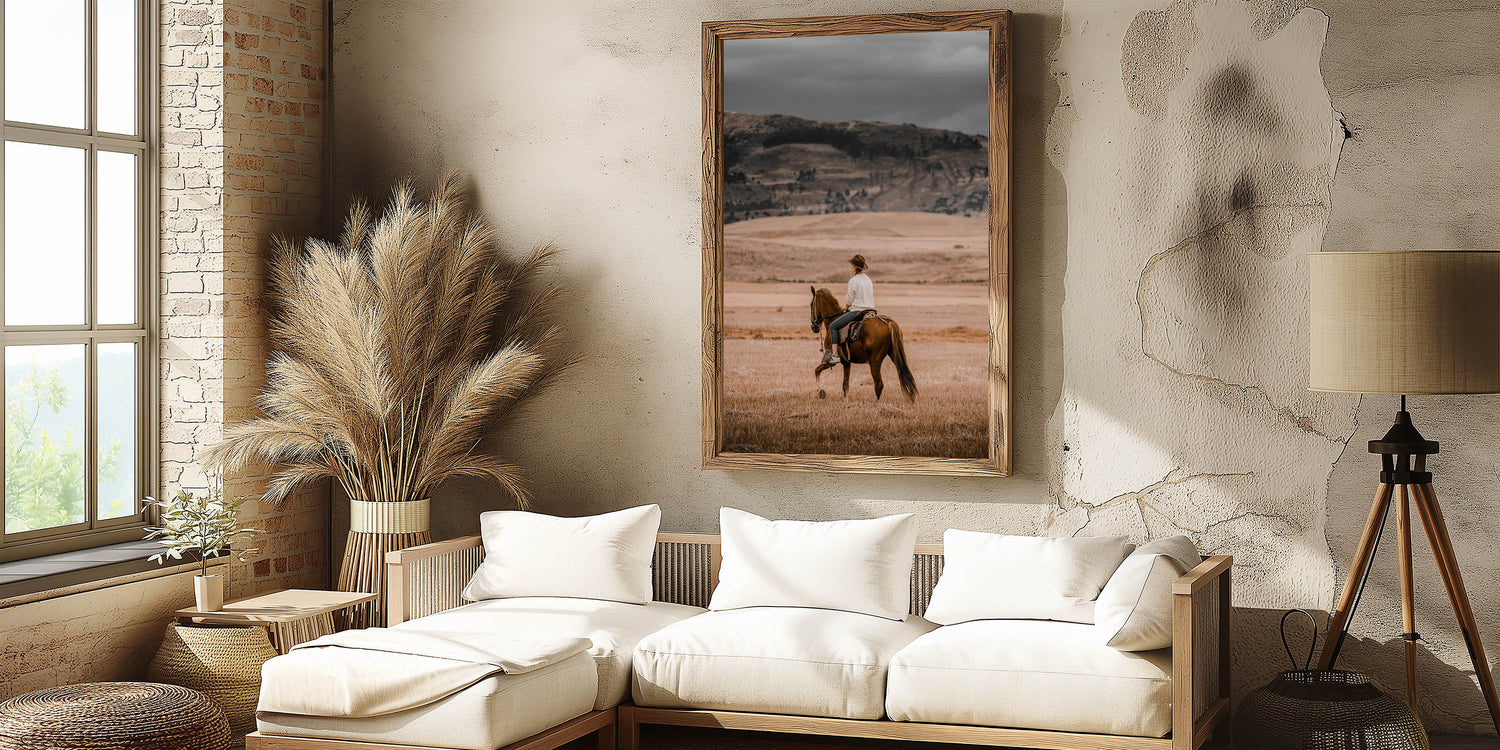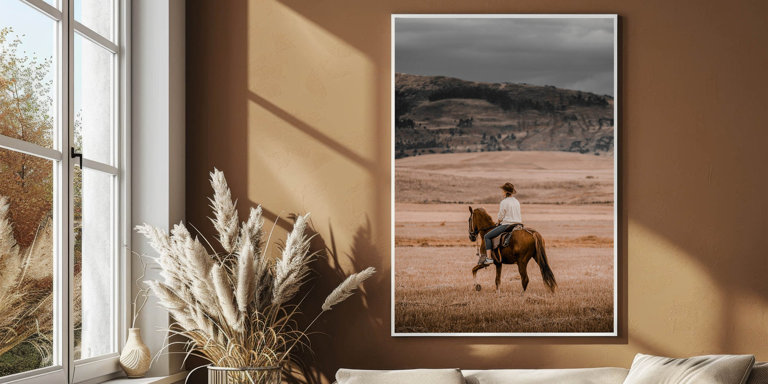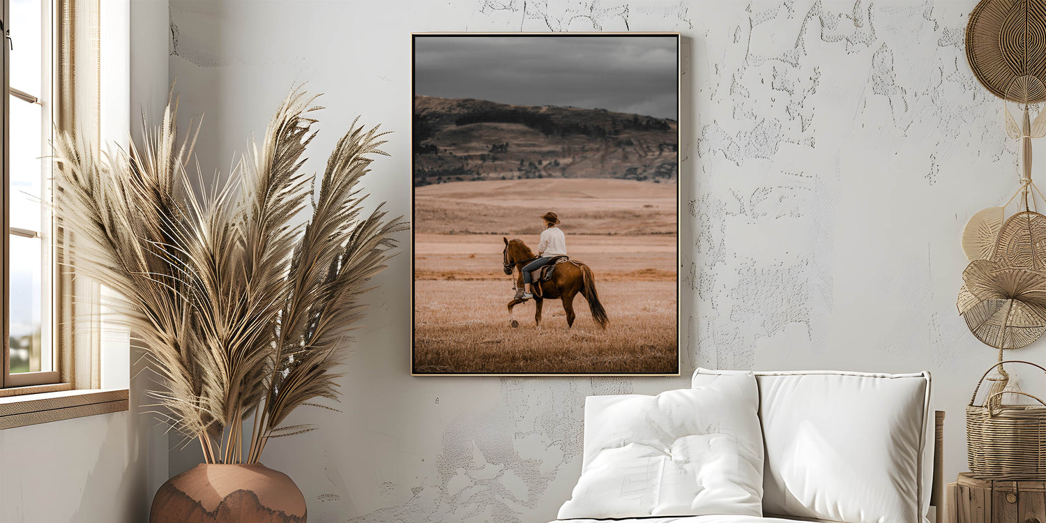 Capture the spirit of the countryside with this evocative horseback riding wall art. This rustic artwork portrays a serene cowboy scene, where the rider takes in the sweeping, golden plains of the countryside. The warm, earthy tones evoke the feeling of simplicity and calmness that comes with rural life, making it the perfect addition to any farmhouse or country-style home. This vintage-inspired piece blends effortlessly with an antique farmhouse aesthetic, adding a touch of rustic charm to your walls.