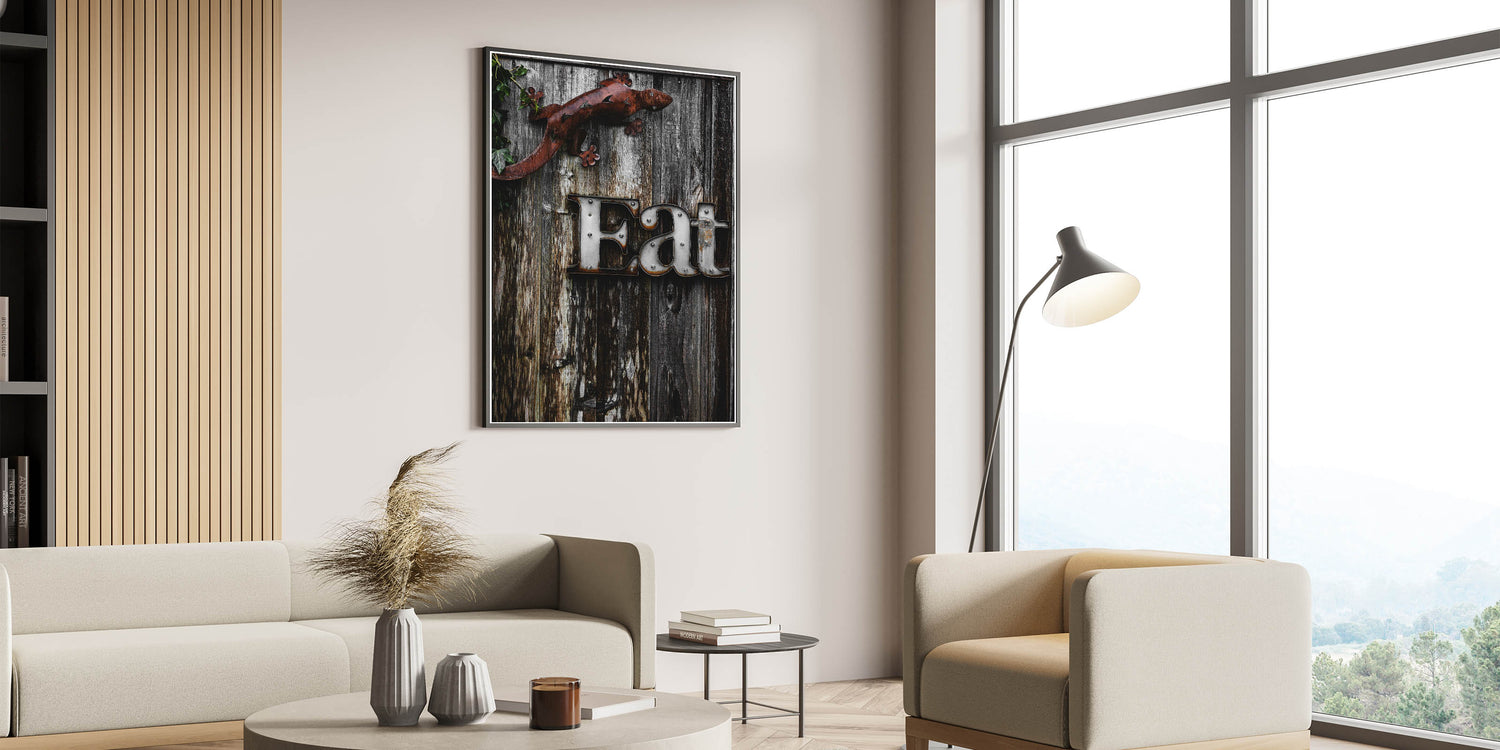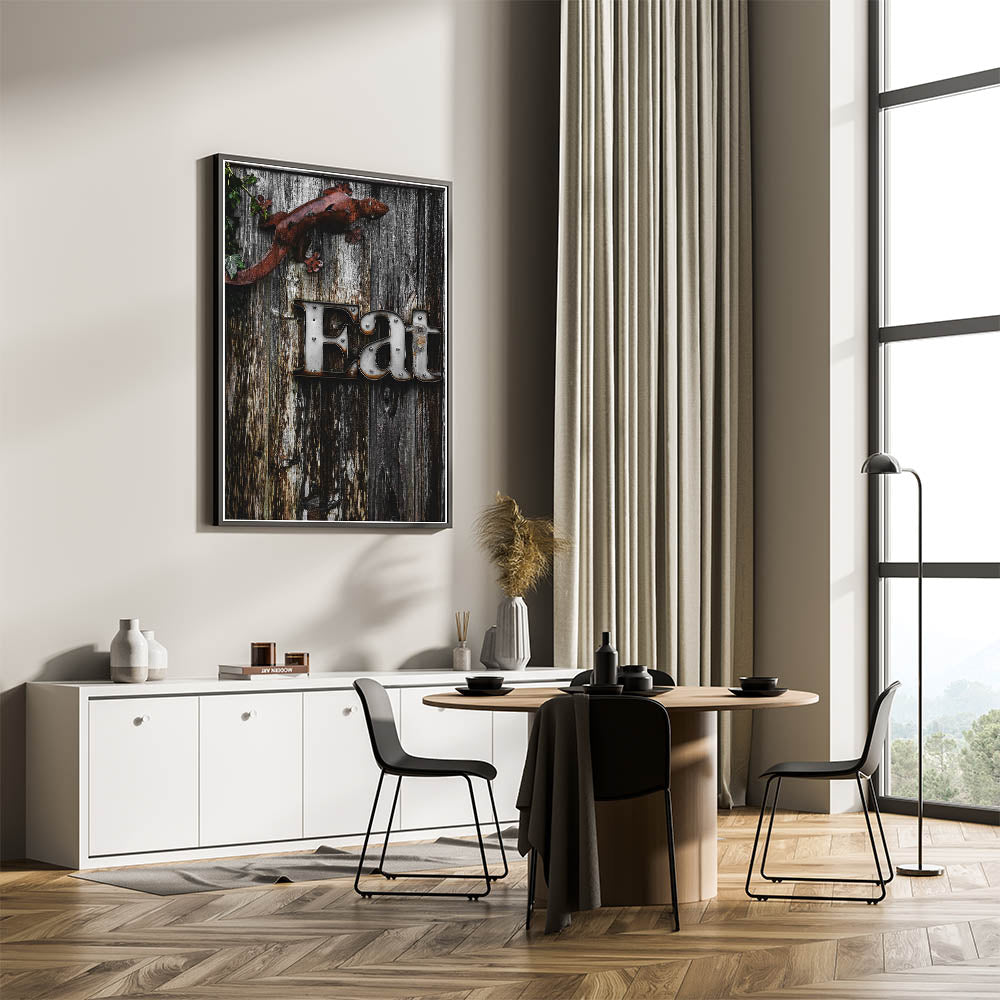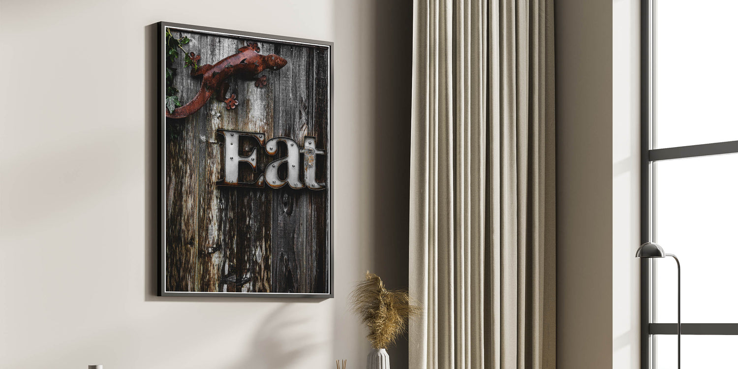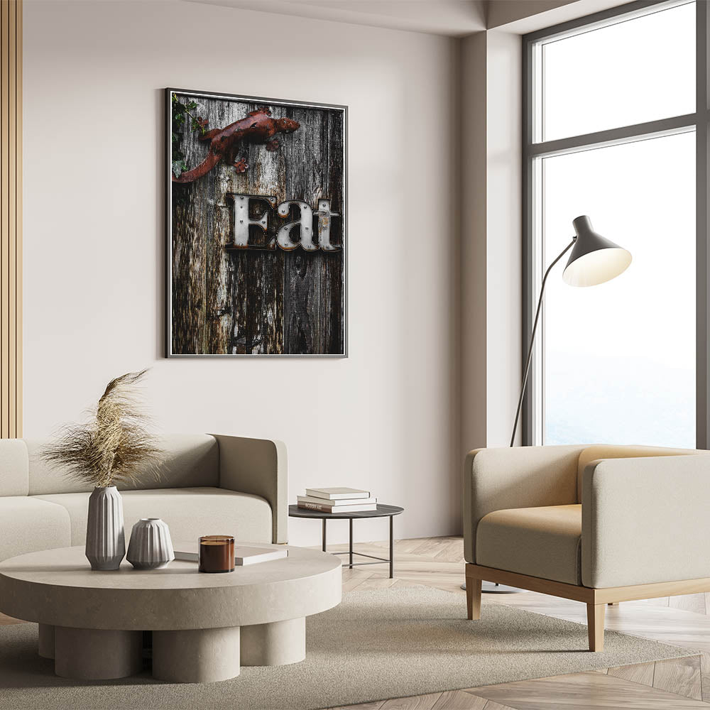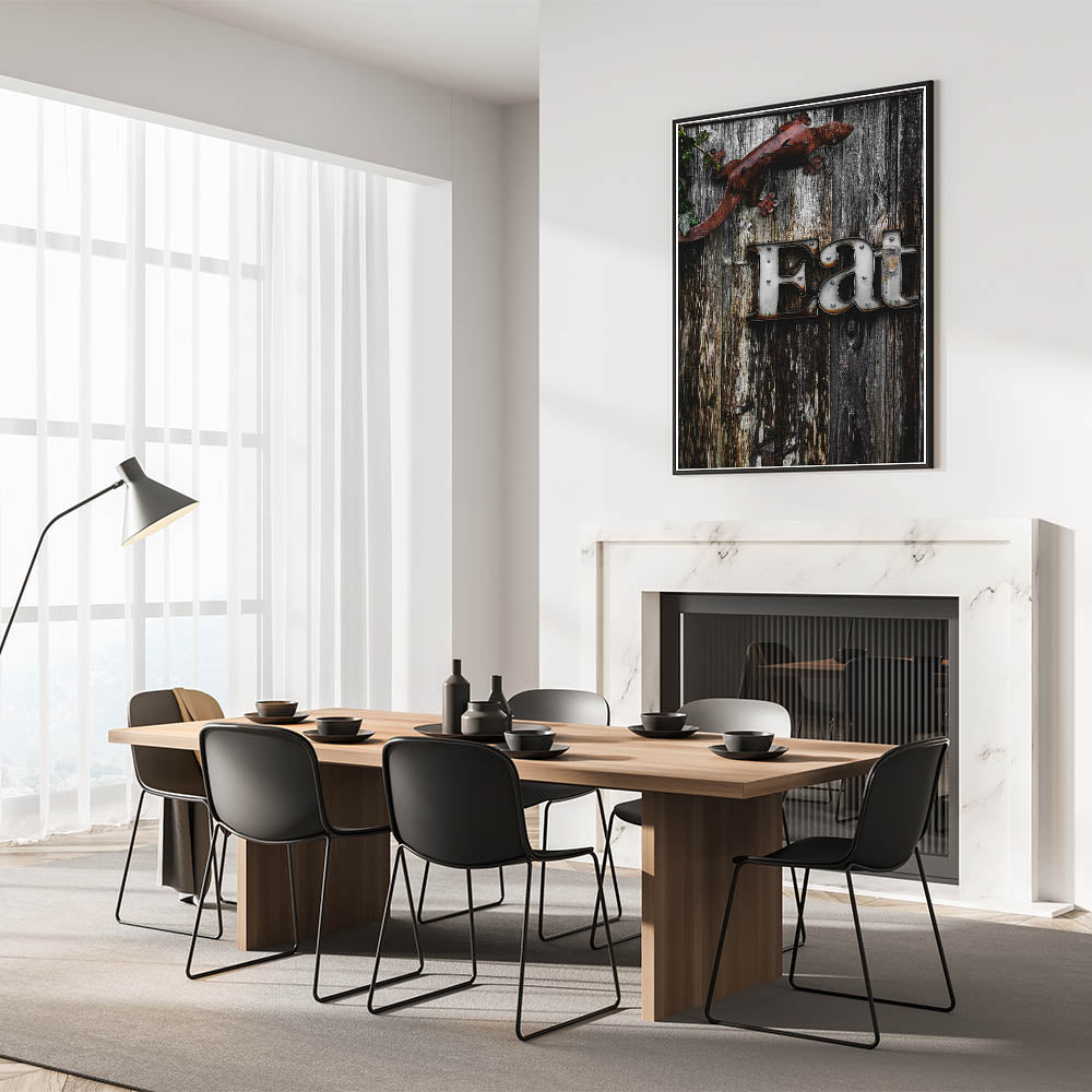 Add a touch of rustic charm to your kitchen or dining area with this unique "Eat" sign wall art. The distressed metal letters stand out against the weathered wooden background, creating a farmhouse-inspired look that brings warmth and character to any space. The metal lizard accent adds a quirky, artistic touch, making this piece a conversation starter and a fun addition to your home decor. Perfect for kitchens, dining rooms, or even outdoor spaces, this artwork combines rustic elegance with a playful twist.